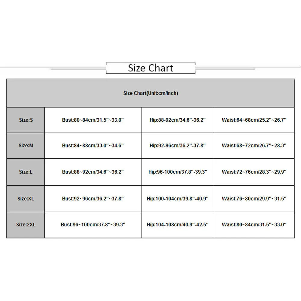 Размер Таблица (единица измерения: см/дюйм) Размеры: S Бюст: 80 ~ 84 см/31,5 "~ 33,0" Бедра: 88-92 см/34,6-36,2 дюйма Обхват талии: 64 ~ 68 см/25,2 "~ 26,7" Размеры: М Бюст: 84 ~ 88 см/33,0 "~ 34,6" Бедра: 92-96 см/36,2 "-37,8" Обхват талии: 68 ~ 72 см/26,7 "~ 28,3" Размеры: L Бюст: 88 ~ 92 см/34,6 "~ 36,2" Бедра: 96-100 см/37,8-39,3 дюйма Обхват талии: 72 ~ 76 см/28,3 "~ 29,9" Размеры: XL Бюст: 92 ~ 96 см/36,2 "~ 37,8" Бедра: 100-104 см/39,8-40,9 дюйма Обхват талии: 76 ~ 80 см/29,9 "~ 31,5" Размеры: 2XL Бюст: 96 ~ 100 см/37,8 "~ 39,3" Бедра: 104-108 см/40,9-42,5 дюйма Обхват талии: 80 ~ 84 см/31,5 "~ 33,0"