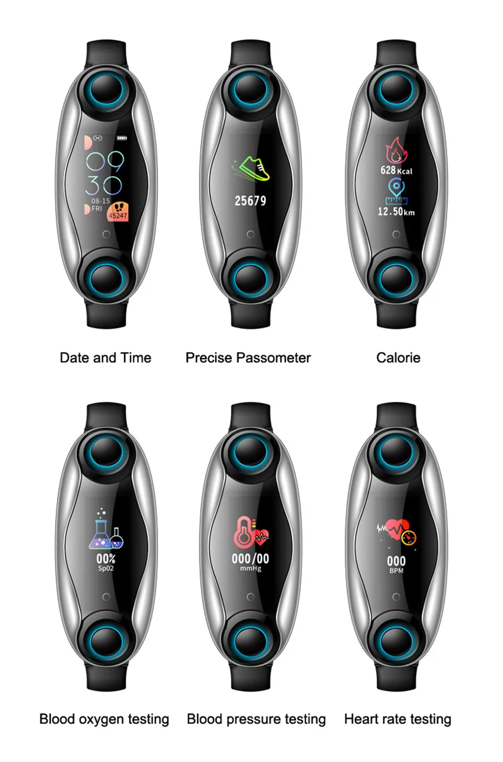 Мониторинг Артериального Давления, мониторинг качества сна, фотосъемка встряхиванием, двусторонний поиск, напоминание о сообщениях.