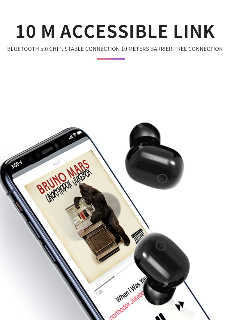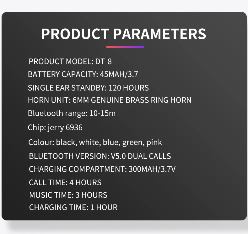 Спецификация Версия Bluetooth: V5.0 Поддержка: Поддержка дисплея питания Емкость аккумулятора гарнитуры: 50 мА · ч Емкость аккумулятора зарядного устройства: 300 мА · ч Зарядка через USB: гарнитура полностью заряжается в течение 1 часа, а зарядное устройство полностью заряжается в течение 2 часов. Время работы гарнитуры в режиме ожидания: 200 часов, Время зарядки гарнитуры в зарядном отсеке: 3 раза. Непрерывное Время разговора: 4-5 часов, Воспроизведение музыки: 4-5 часов Основные характеристики продукта Bluetooth 5,0: быстрое соединение и стабильный сигнал Легкий вес: 4,1 г, удобно носить, без падения Долгое время работы от аккумулятора: 12 часов работы от аккумулятора (с зарядным устройством) Голосовое управление: Пробуждение голосового ассистента