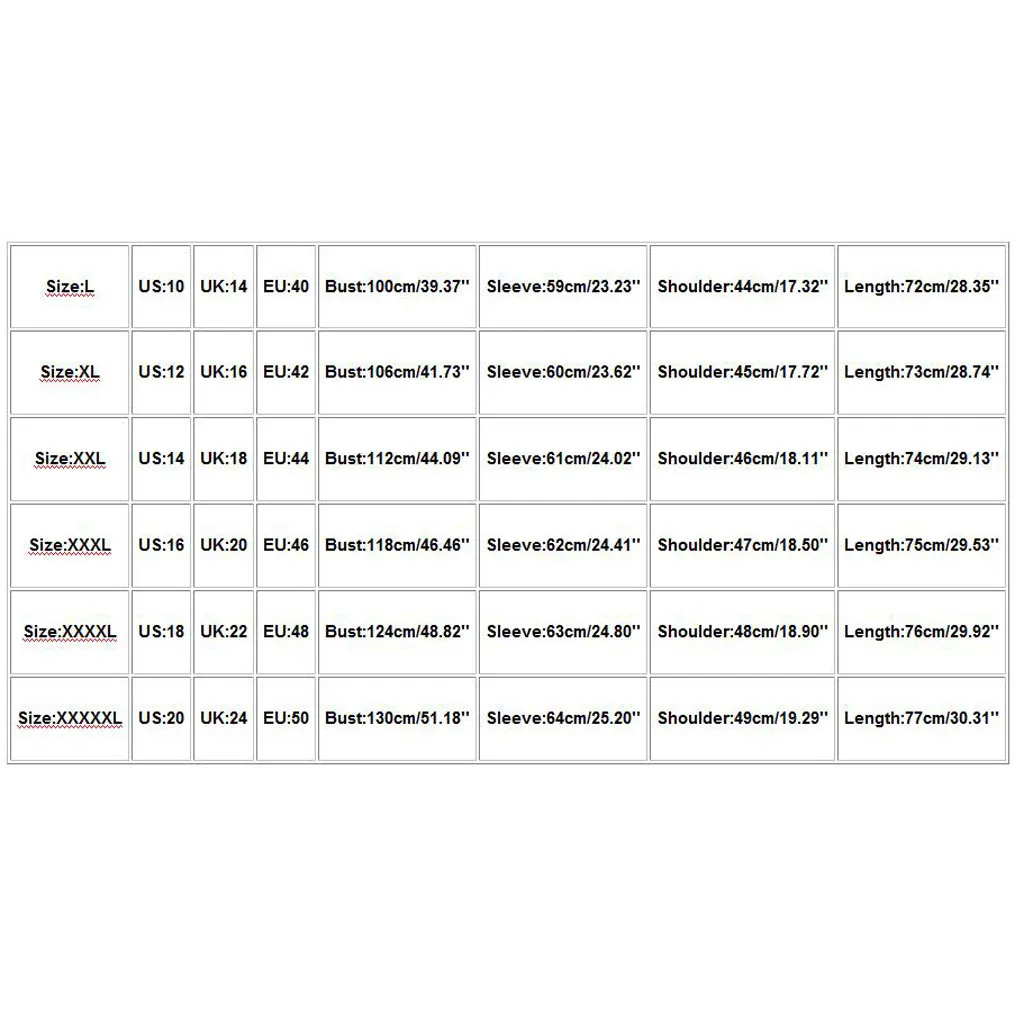 Размер США Великобритания ЕС Бюст Рукав Плечо Длина L 10 14 40 100 см/39,37'' 59 см/23,23'' 44 см/17,32'' 72 см/28,35'' XL 12 16 42 106 см/41,73'' 60 см/23,62'' 45 см/17,72'' 73 см/28,74'' XXL 14 18 44 112 см/44,09'' 61 см/24,02'' 46 см/18,11'' 74 см/29,13'' XХХL 16 20 46 118 см/46,46'' 62 см/24,41'' 47 см/18,50'' 75 см/29,53'' XXXXL 18 22 48 124 см/48,82'' 63 см/24,80'' 48 см/18,90'' 76 см/29,92'' XXXXXL 20 24 50 130 см/51,18'' 64 см/25,20'' 49 см/19,29'' 77 см/30,31''