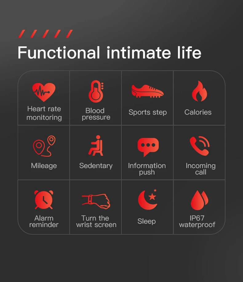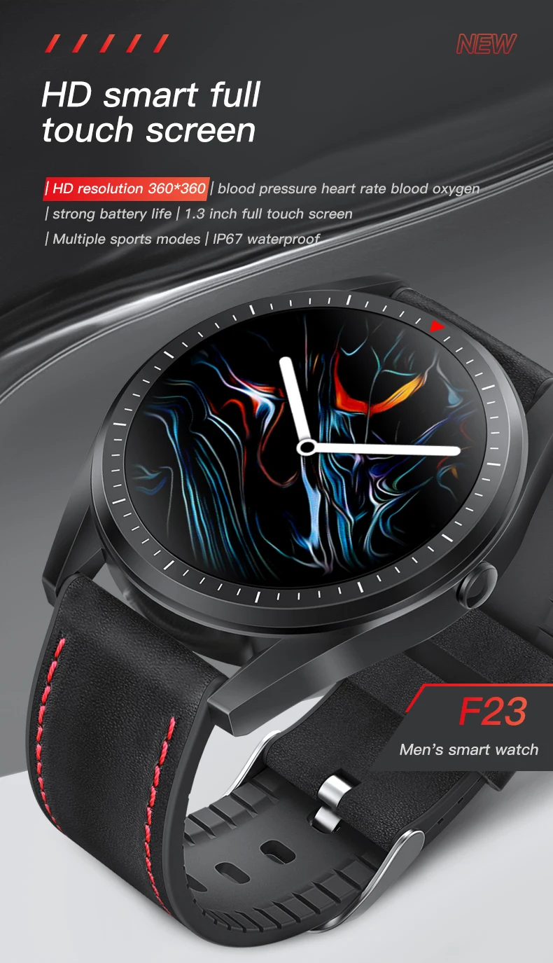 * BT 5,0 * Разрешение HD 360*360 * Кровяное давление пульса кислорода в крови * Сильный Срок службы батареи * Полноразмерный сенсорный экран 1,3 дюйма * Mutiple спортивные режимы IP67 водонепроницаемый