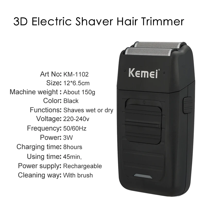 Инструкции по уходу за изделием Этот продукт является перезаряжаемой бритвой. Обычная Чистка с чистящей щеткой в порядке. Этот продукт имеет две плавающие головки бритвы, индивидуально рефлекторная система действий всегда может приблизиться к контуру лица, чтобы эффективно брить волосы любой длины и в любых растущих направлениях. Разумный Дизайн и сотрудничество двух лезвий принесет лучший эффект бритья. Параметры: • Изделие: перезаряжаемая бритва • Модель: KM-1102 • Вход Напряжение: AC 220-240V 50/60Hz • Потребляемая мощность: 3 Вт • Время зарядки: 8 ч • Время использования: около 45 мин • Очистка: с помощью кисти • Цвет: черный Безопасность Предупреждение: Только комплектное зарядное устройство может использоваться. Убедитесь, что заряд не станет влажным. Зарядное устройство включает в себя трансформатор, который не должен быть отрезан и заменен другой вилкой; В противном случае, приведет к серьезным результатам. Если зарядное устройство повреждено, его следует заменить на новое с оригинальным типом, чтобы избежать опасности.