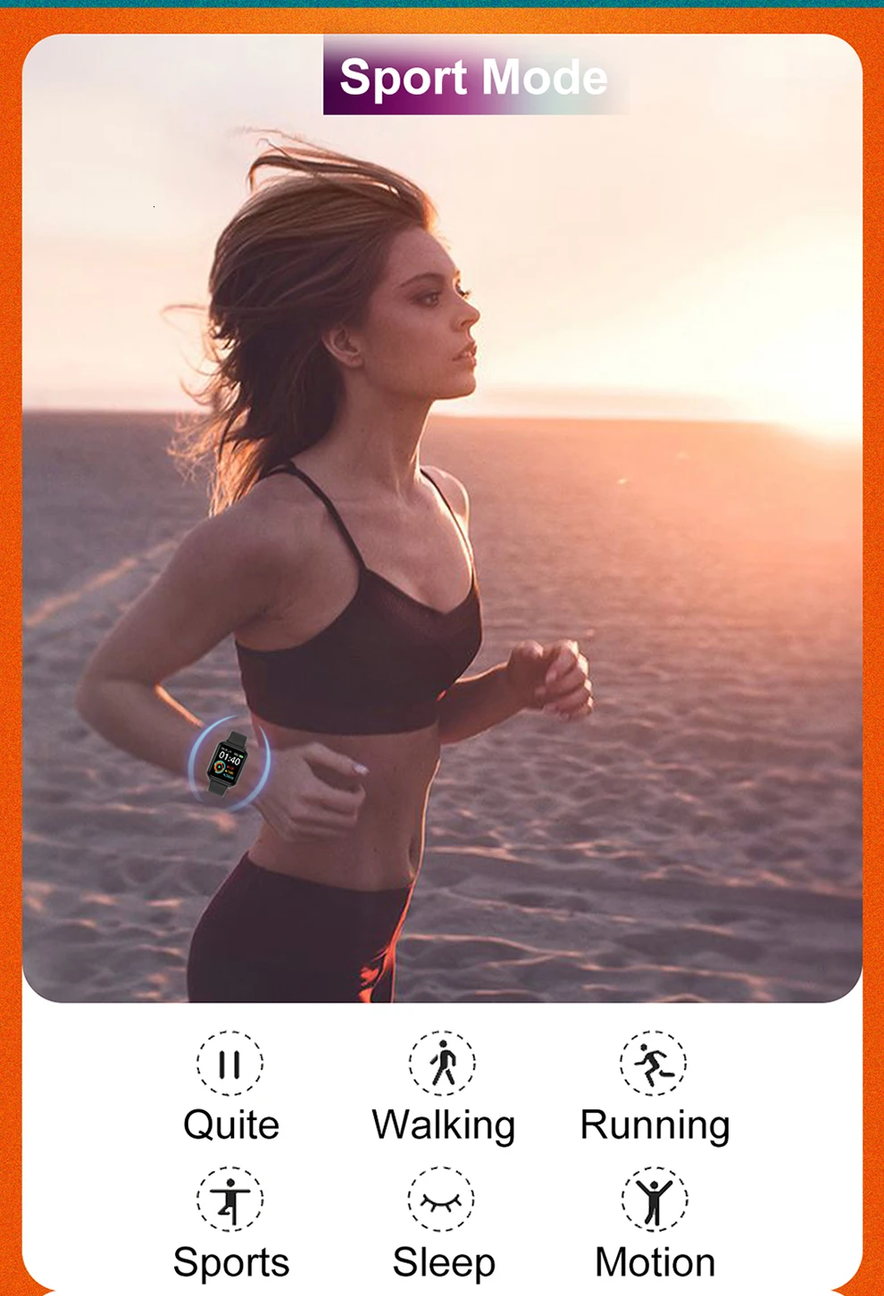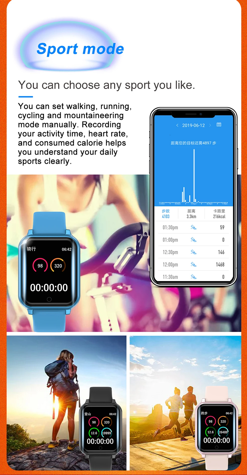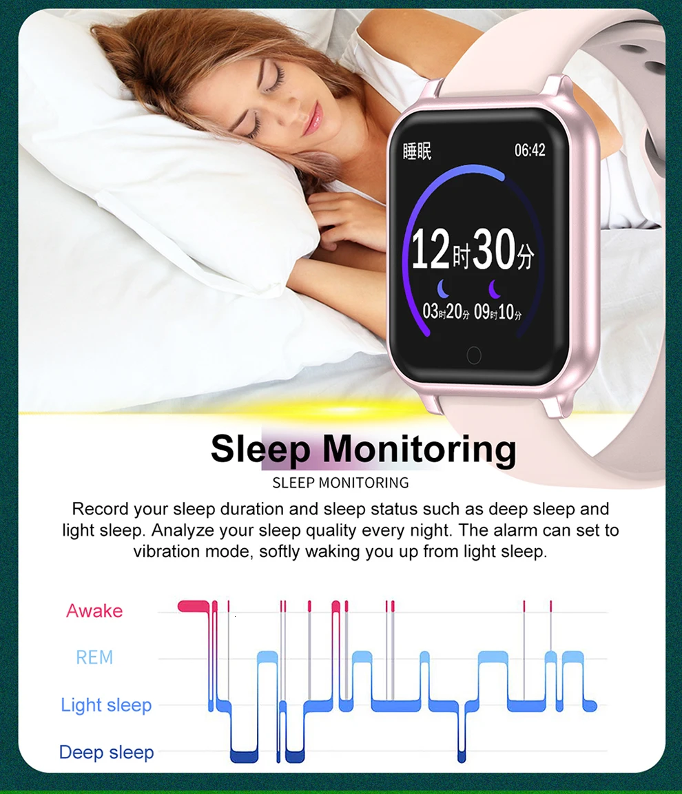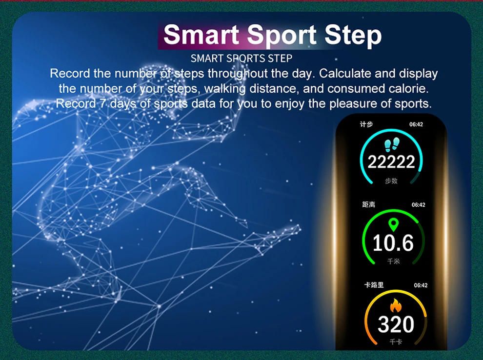 Запись упражнений: шаг, время упражнений, пробег упражнений, потребление калорий, мониторинг сна, сохранение 30 дней данных об упражнениях/сне.