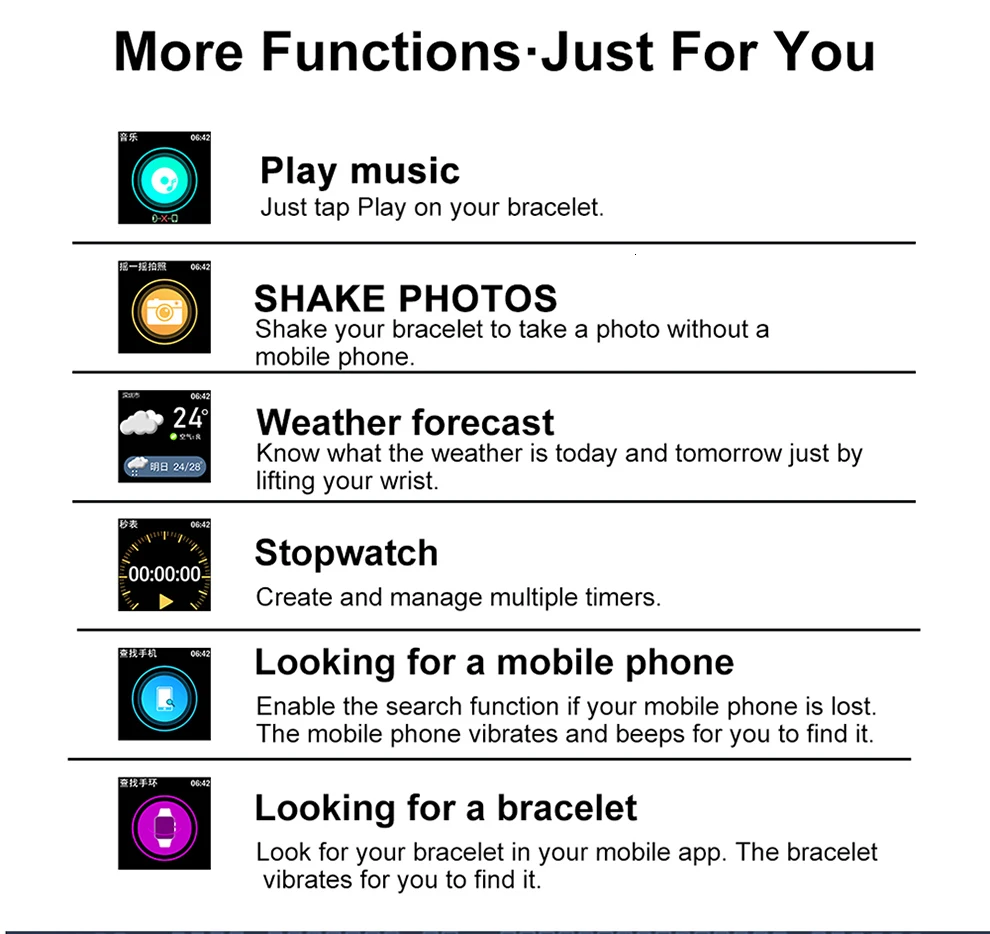 Другие функции: Включите яркий экран запястья, отображение времени, удаленную камеру, не беспокоить настройки режима, найти браслет, WeChat спорт, пользовательская домашняя страница