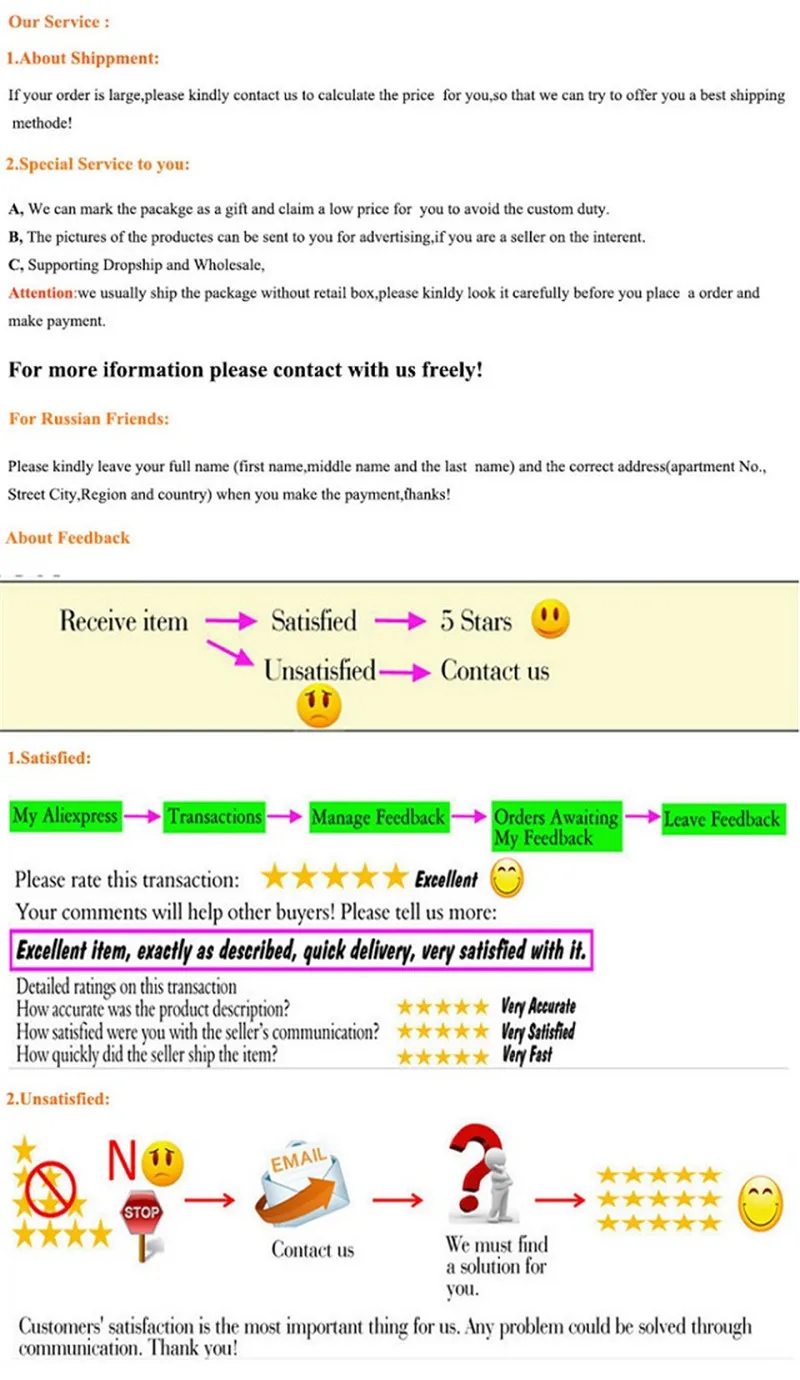 Please let us know before leaving any negative feedback or 1 point, 2 point low DSR or open any disputes, please give us the opportunity to resolve any problems and we will try our best to satisfy your needs.
