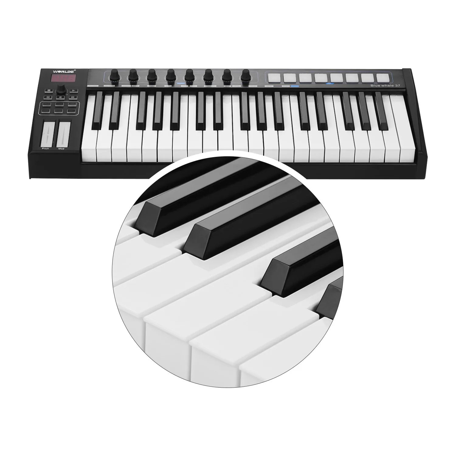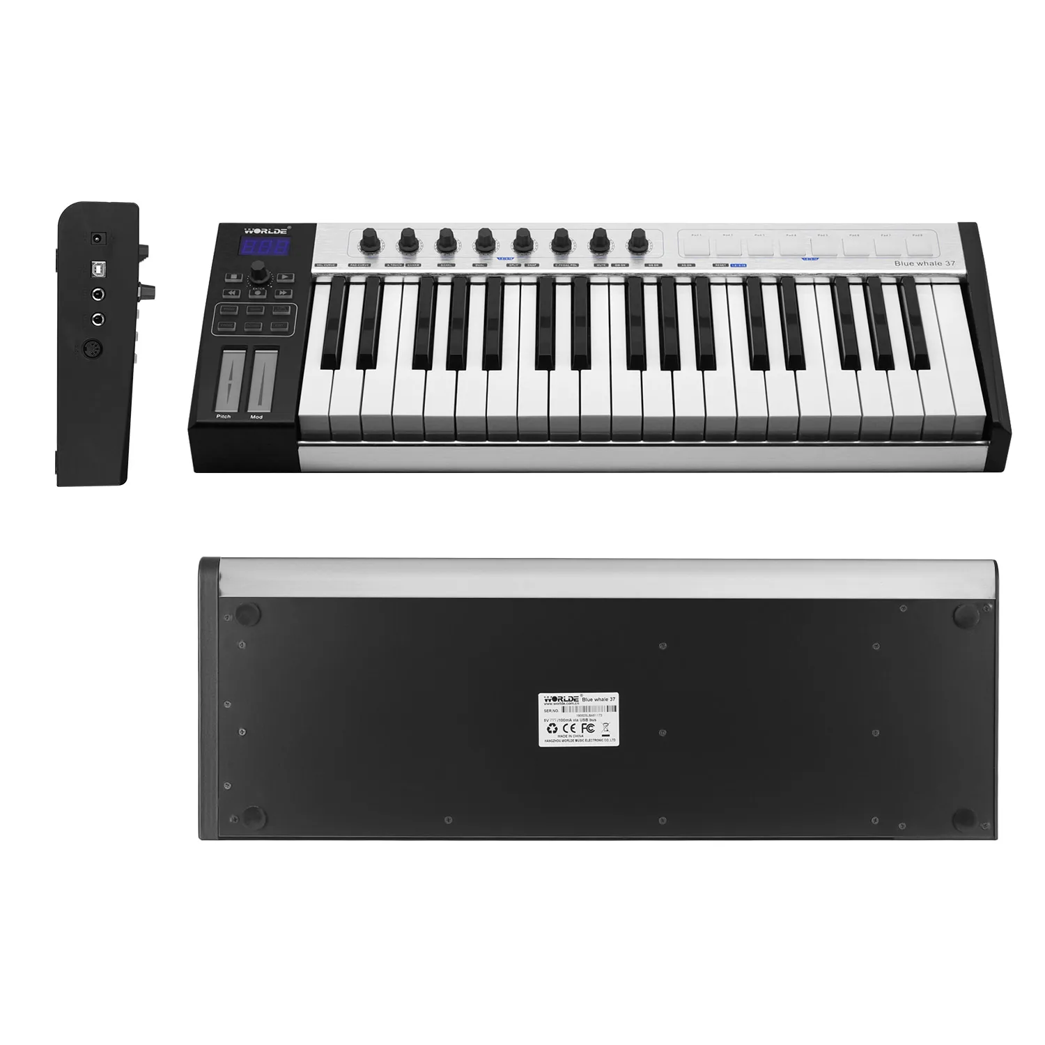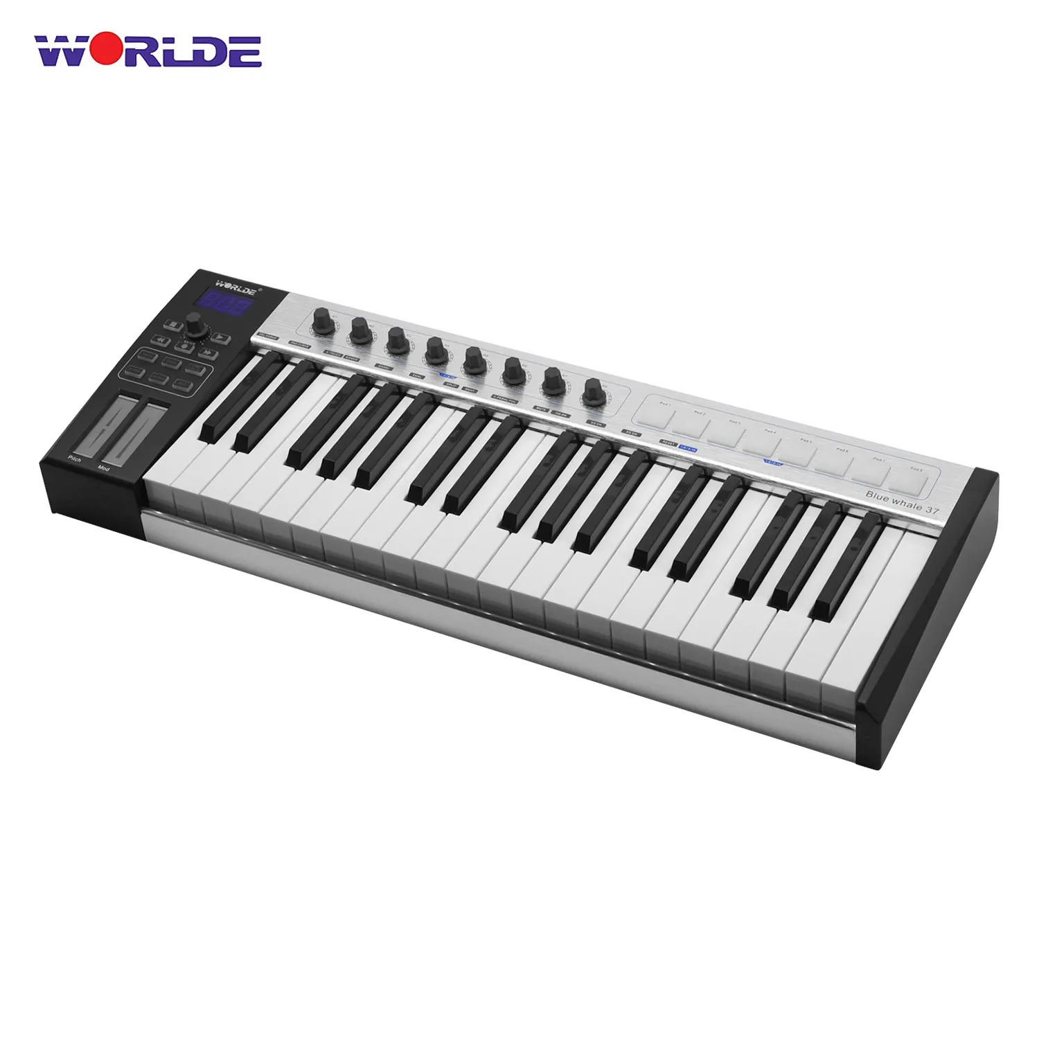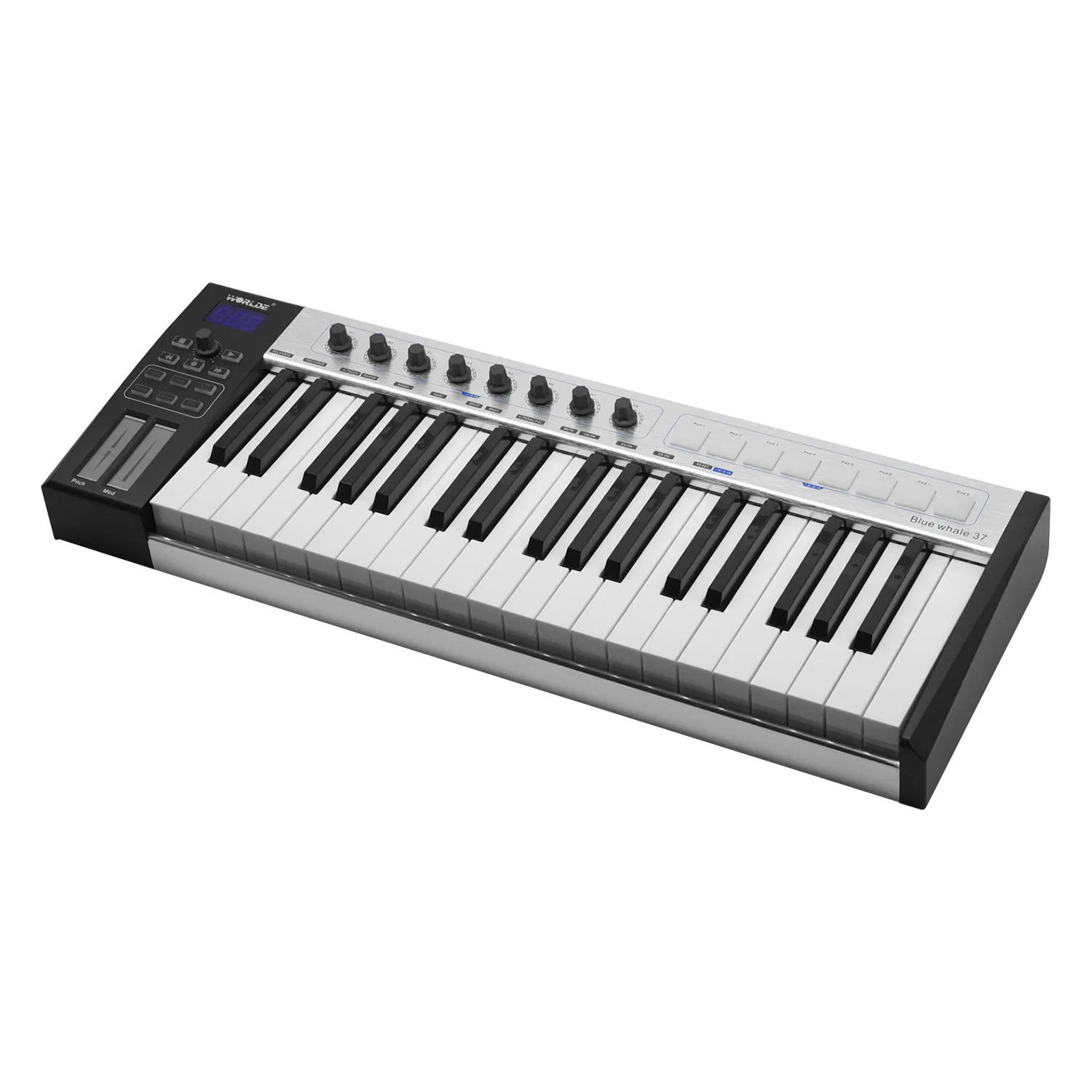 Профессиональная клавиатура MIDI с матовой алюминиевой панелью, четкий светодиодный дисплей и 37 полувзвешенных клавиш с последующим прикосновением.