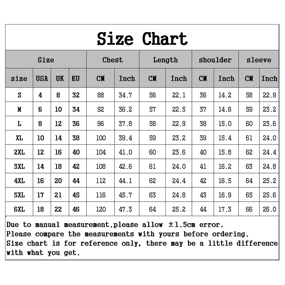 [Наш Размер 6XL] Длина: 64 см/25,2 ", обхват груди: 120 см/47,3", плечо: 44 см/17,3 ", рукав: 66 см/26,0" (прибл.)