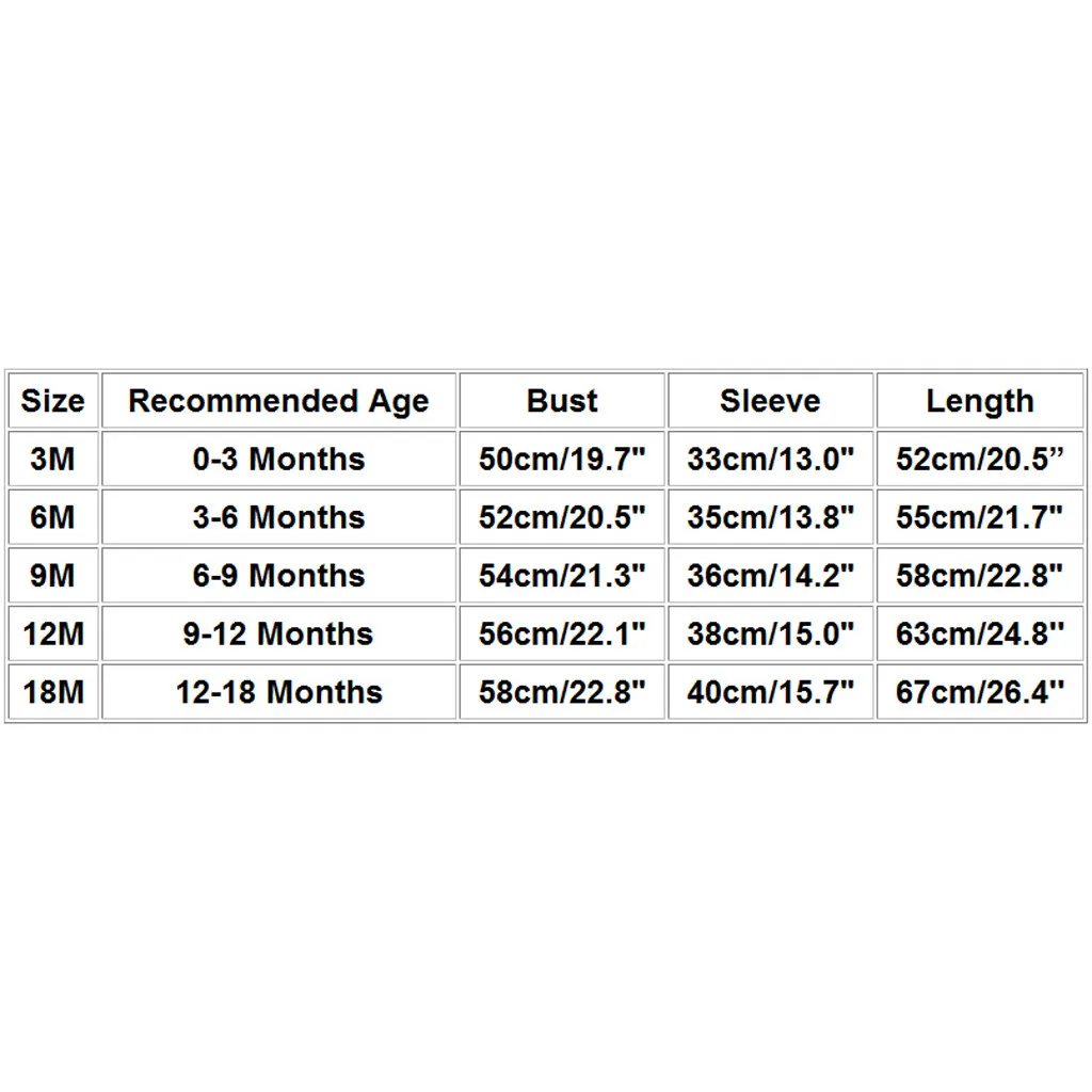 Size Recommended Age Bust Sleeve Length 3M 0-3 Months 50cm/19.7" 33cm/13.0" 52cm/20.5” 6M 3-6 Months 52cm/20.5" 35cm/13.8" 55cm/21.7" 9M 6-9 Months 54cm/21.3" 36cm/14.2" 58cm/22.8" 12M 9-12 Months 56cm/22.1" 38cm/15.0" 63cm/24.8'' 18M 12-18 Months 58cm/22.8" 40cm/15.7" 67cm/26.4''