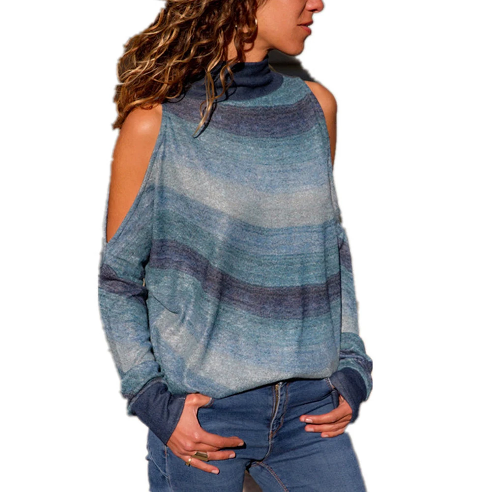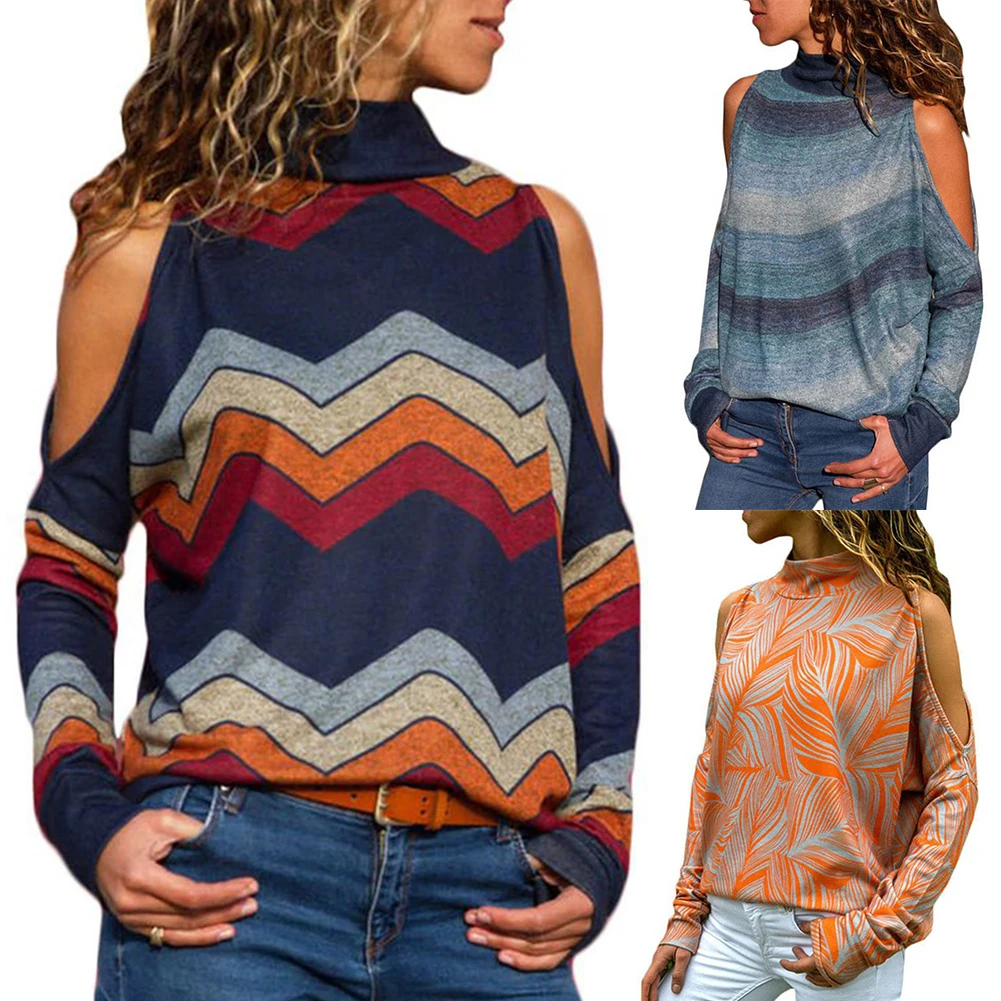 Женский лист с волнообразным рисунком с открытыми плечами с длинными рукавами и высоким воротом, вязаная блузка с узором, надевается через голову