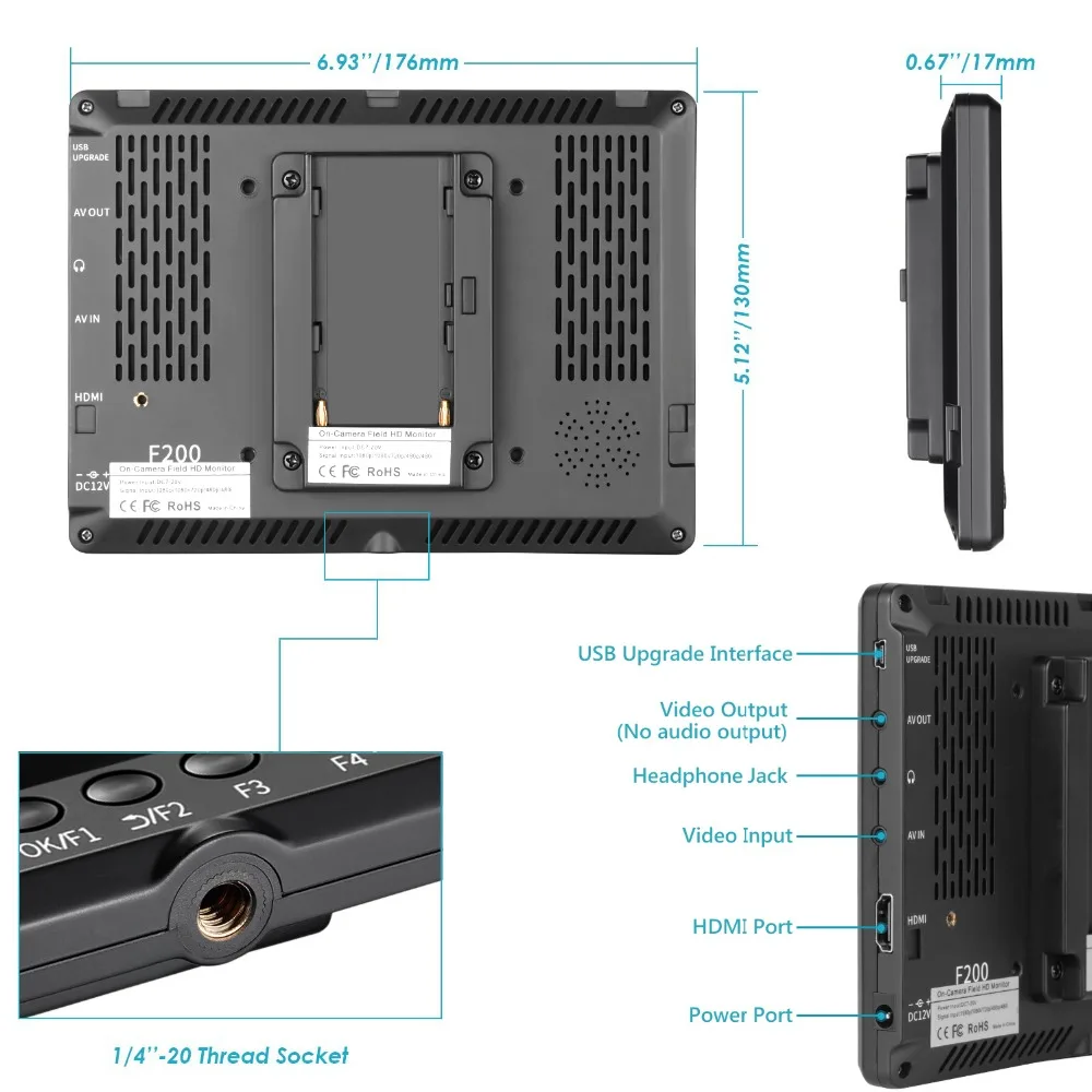 【 Монитор высокой четкости 】 с 7-дюймовым IPS-дисплеем 1920 × 1200, яркостью 1200 кд/м2, коэффициентом контрастности: 1, соотношением сторон 16:10, И Шаг точки 0,07875 × 0,07875 мм, Neewer F200 предлагает большой и детальный предварительный просмотр для проверки фокуса и обрамления и улучшения вашей фотографии и кинематографии