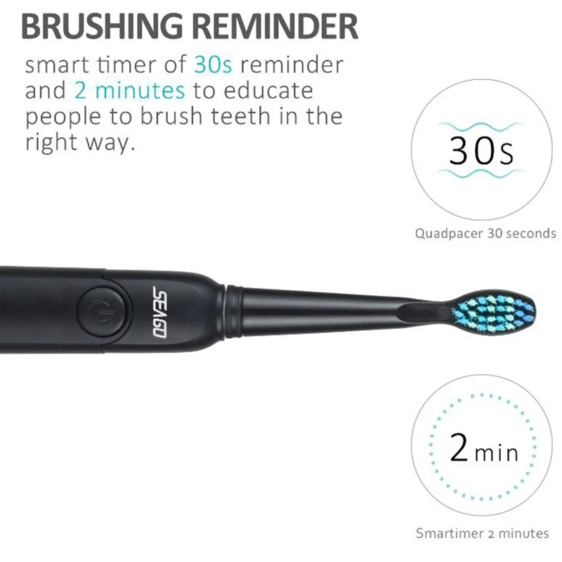 Особенности: Бренд: Seago Материал: ABS, TPE, DuPont нейлоновая щетина Количество: 1 зубная щетка (основной корпус), 3 головки щетки Режим: 5 режимов (белый, сиреневый, белый, gumcare, sensitve) Зарядка: USB зарядка Мощность: 31000 раз/мин ~ 40000 раз/мин Уровень водонепроницаемости: IPX7 Мощность: 5 Вт Напряжение: 5 В 1, эффективная высокая частота вибрации 40000 Время в минуту, эффективно удаляет налет, Глубокое очищение зубов и полости рта. Пять На выбор, подходит для разных моделей Оральные условия для людей Напоминание на 2,30 секунд, функция отключения на две минуты, Делает чистящие зубы более научными, более Эффективный уход за здоровьем молодежи 3, супер водонепроницаемая функция, водонепроницаемый уровень Для уровня IPX7, чтобы обеспечить использование продукта с аккумулятором Сверх-выпуска защиты, когда батарея Если у вас есть серьезные проблемы, продукт будет погружаться на дно Режим питания, мотор и индикатор не работают. 4, с функцией напоминания о недостатке питания, когда Напряжение батареи низкое, для зарядки Инструкция после получения необходимых Кнопки на светильник будет мигать 10 раз Напоминаем Вам о зарядке. 5, время зарядки аккумулятора меньше или равно 10 Часов, полностью заряжается, используется для 25 дней (2 Раз в день, каждый 2 минуты)