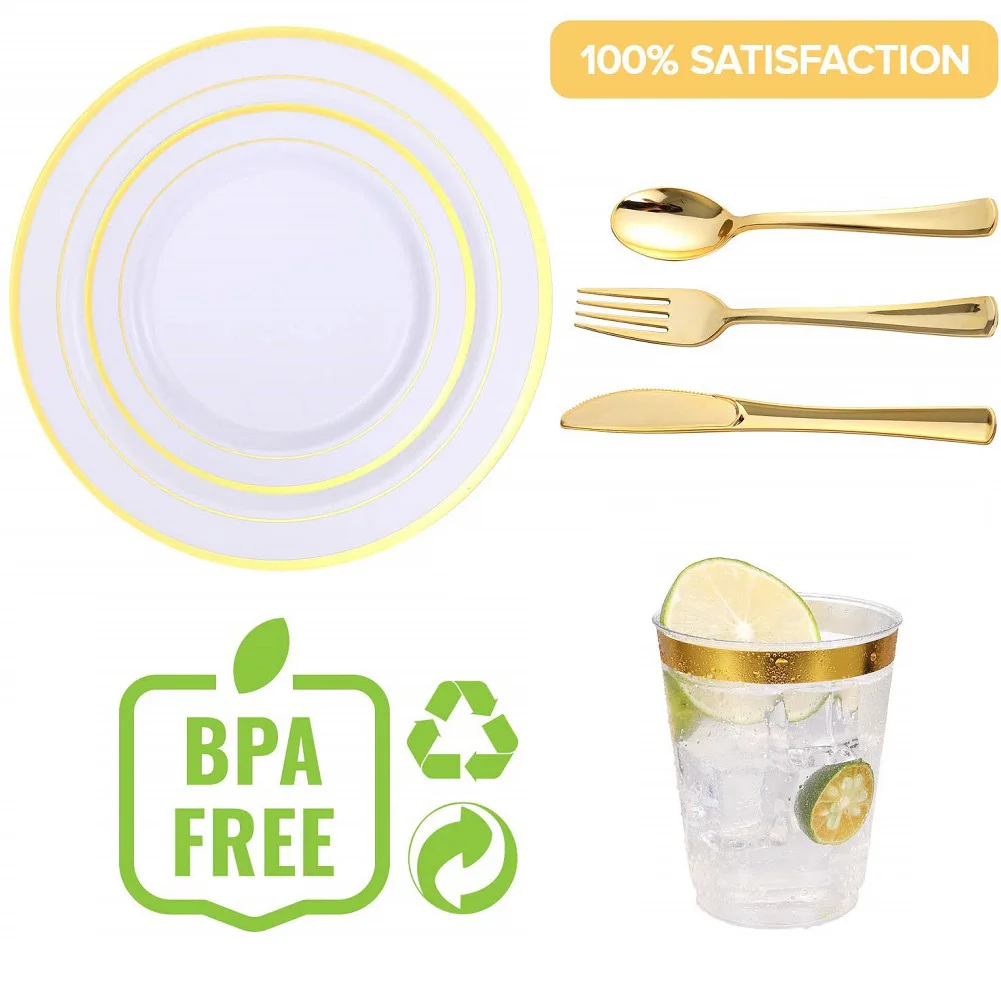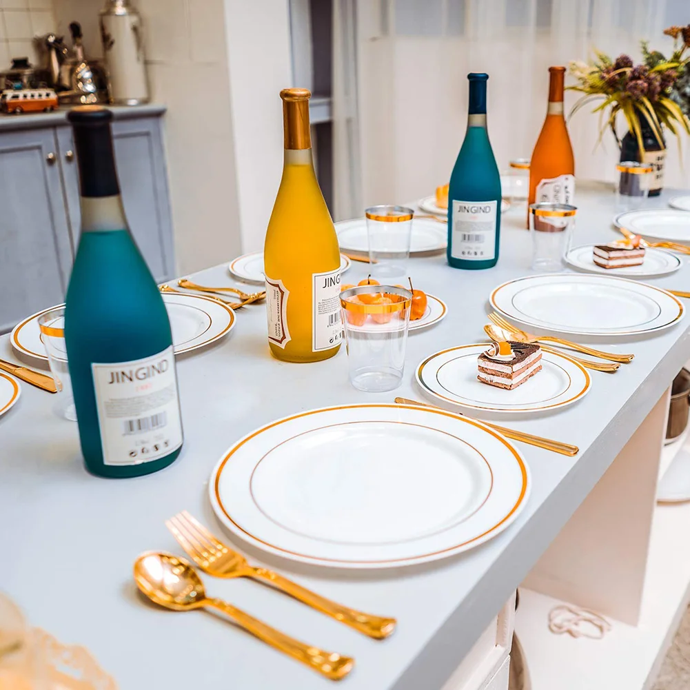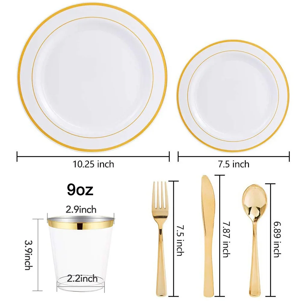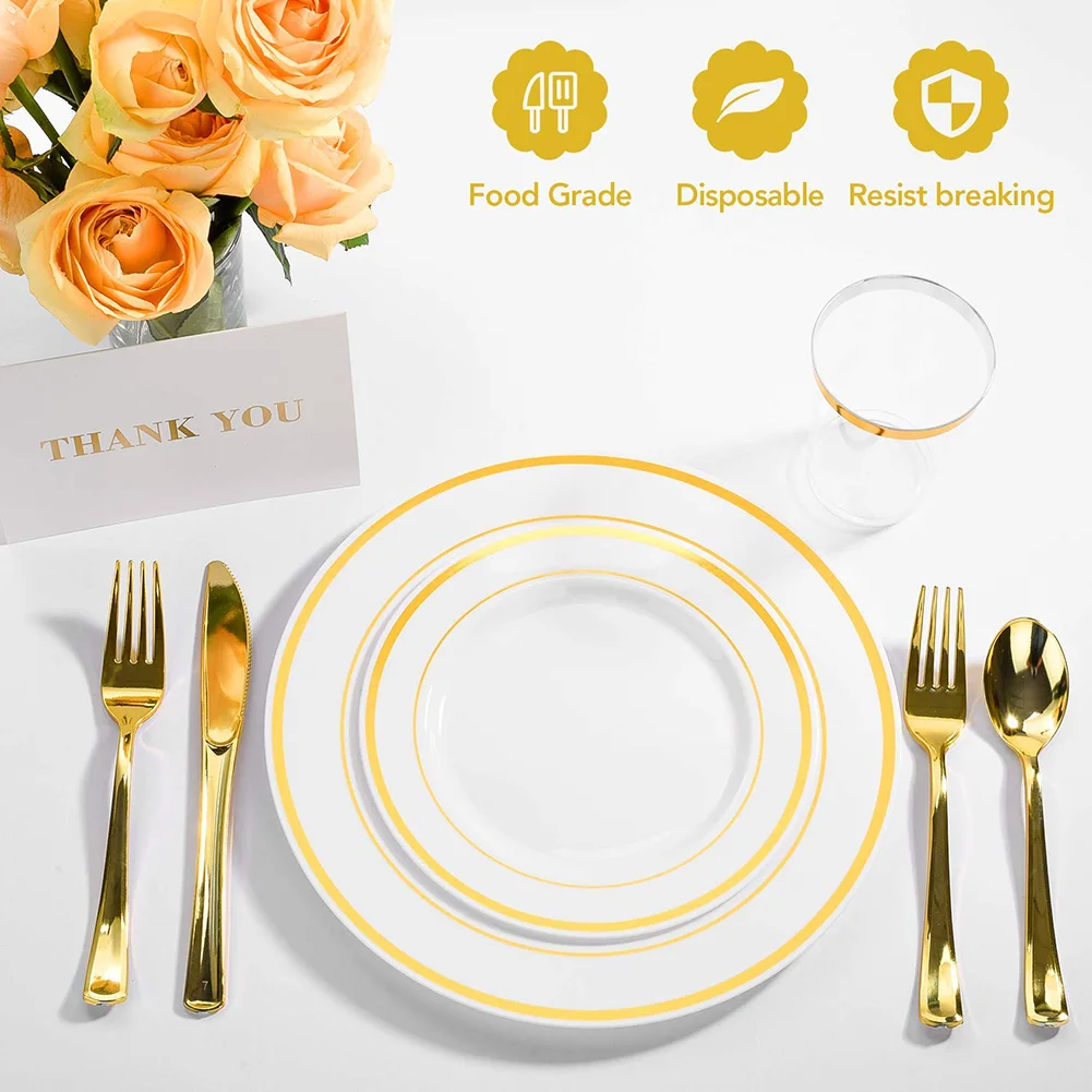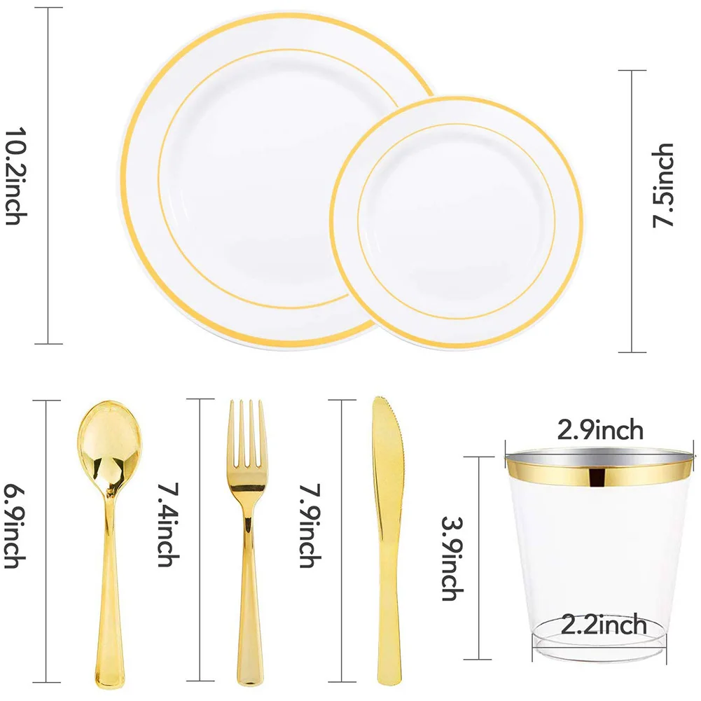 4. Элегантный дизайн. Эти золотые столовые приборы, тарелки и чашки, которые все оснащены очаровательным золотым ободком добавляют элегантности, современный штрих к любому случаю, и этот набор будет сиять в вашем вина и еды.