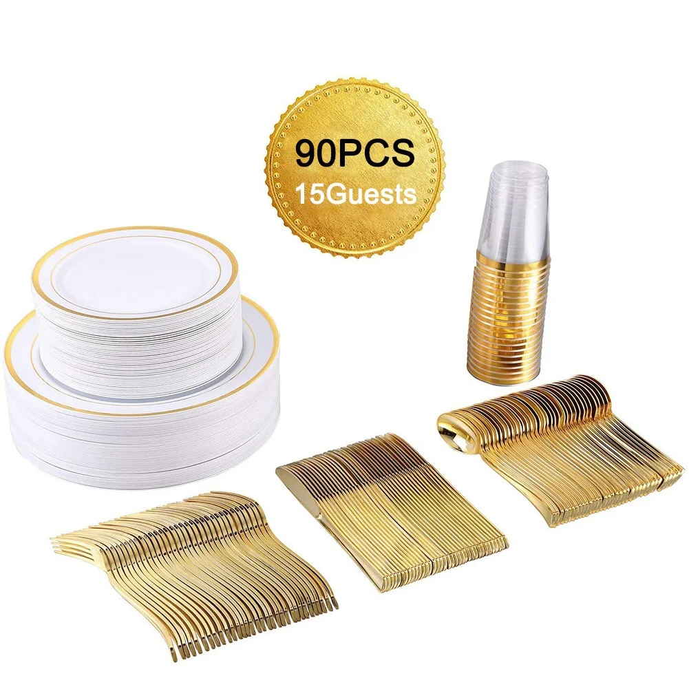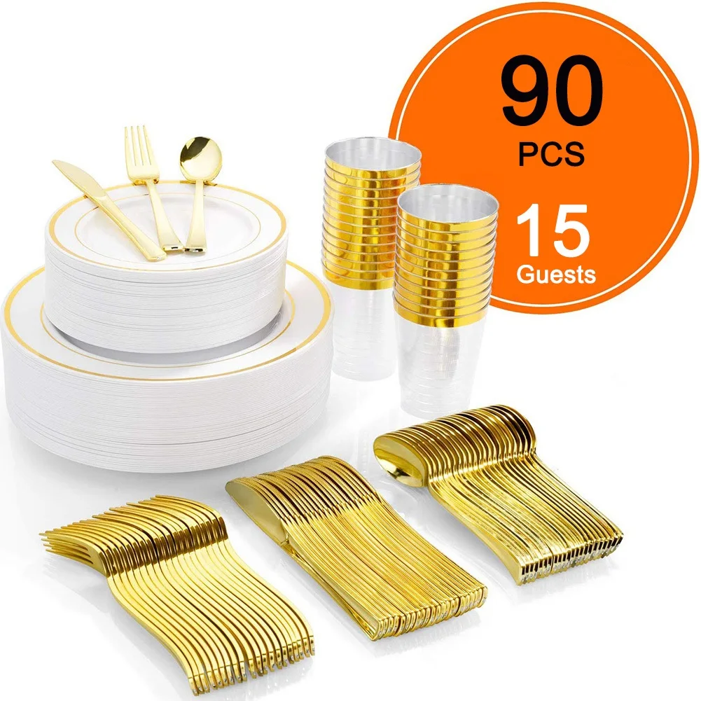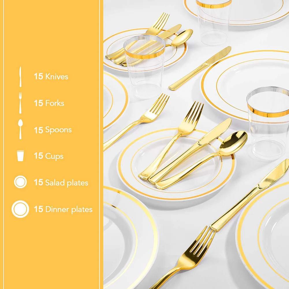 1. набор посуды предназначен для 15 гостей, предоставляет все необходимое для вашего обслуживания, включая 15 вилок, 15 ложек, 15 ножей, 15 тарелок (7,5 "), 15 тарелок (10,25") и 15 чашек (9 унций).