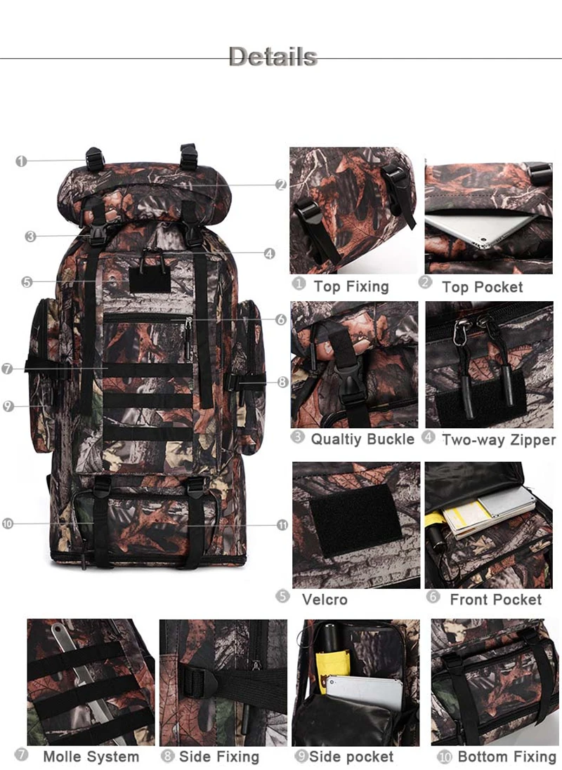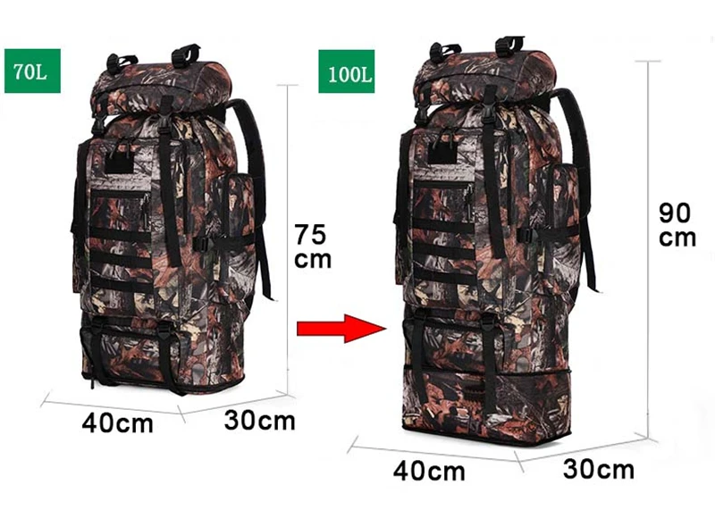 Материал: водонепроницаемый Высококачественный нейлон Размер: 40 см x 30 см x 75 см (ДхШхВ) Размер после расширения: 40 см x 30 см x 90 см (ДхШхВ) Цвет: черный, джунгли листьев ACU пустыни цифровой и т. Д. Использование: дорожный рюкзак, альпинистские рюкзаки, камуфляжный рюкзак Повод: Пешие прогулки, кемпинг, езда на велосипеде, альпинизм, путешествия, скалолазание