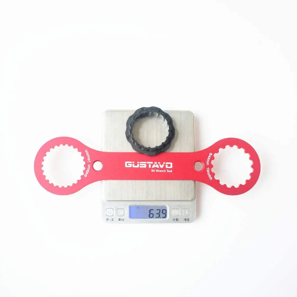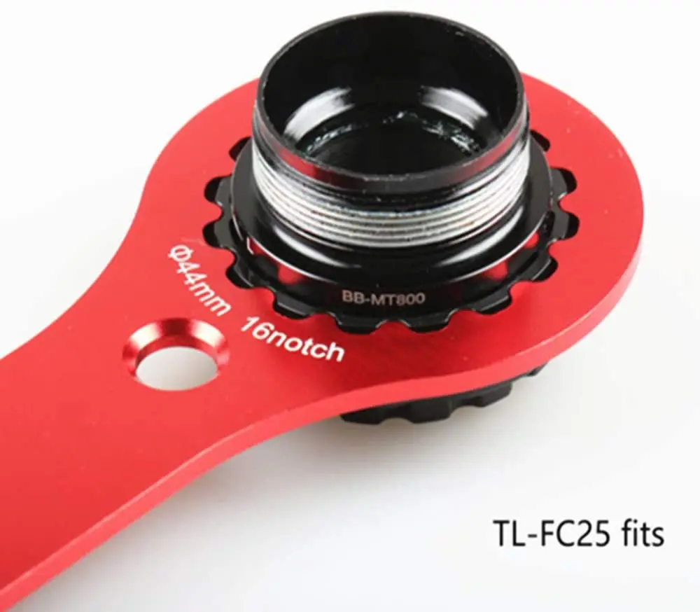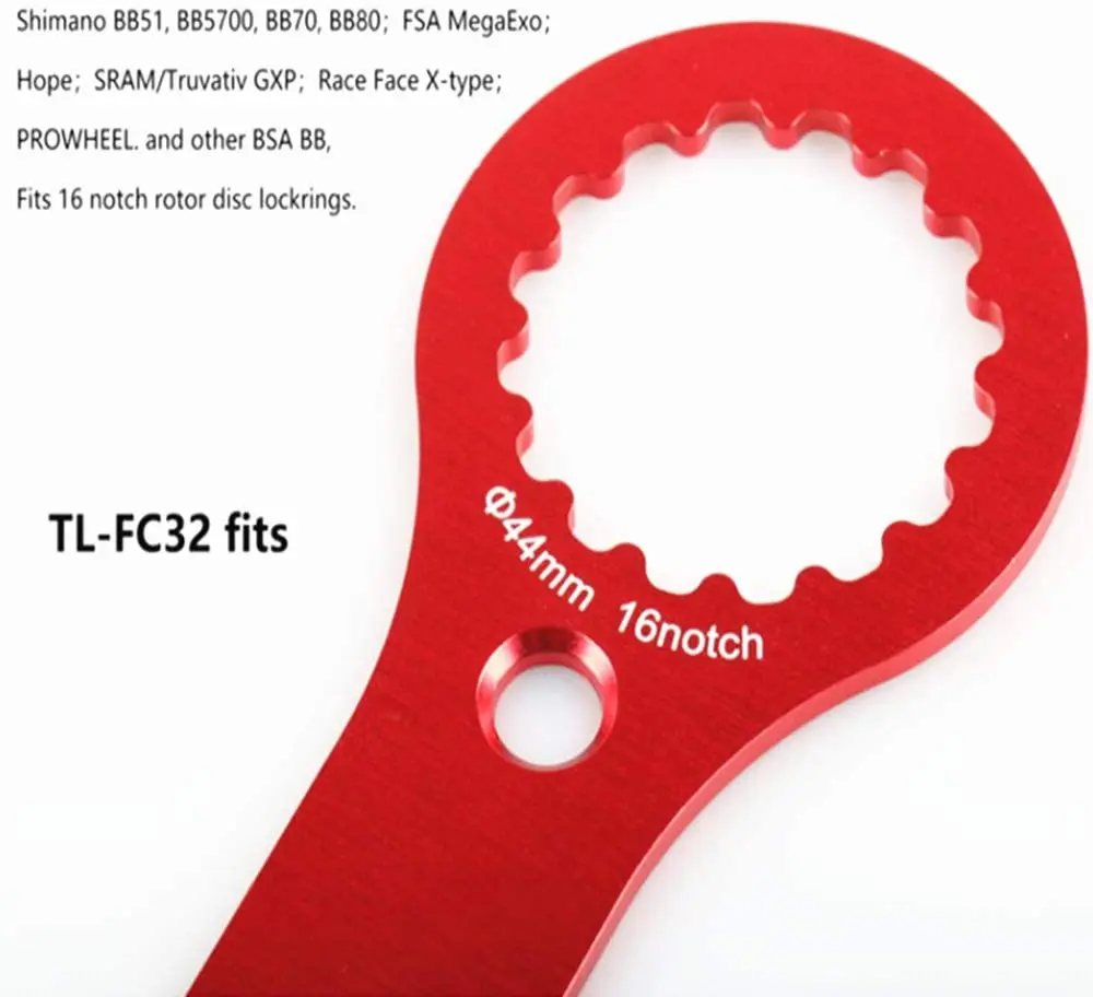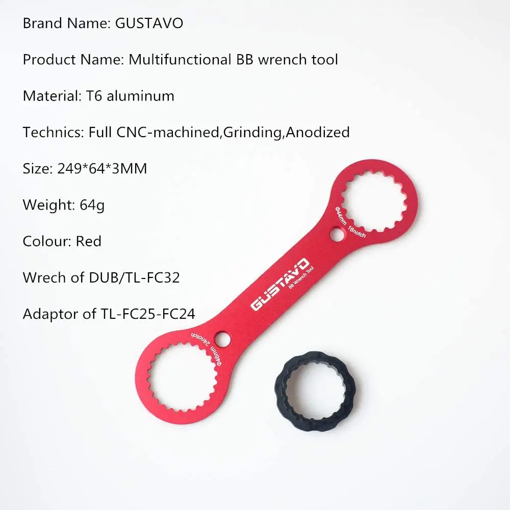 Multifunctional BB wrench tool Wrech of DUB/TL-FC32 of TL-FC25-FC24 TL-FC32: 16-notch bearing cups fits an outside diameter of 44mm (i.e. Shimano BB51, BB5700, BB70, BB80, FSA MegaExo, Hope, SRAM/Truvativ GXP, Race Face X-type, PROWHEEL and other BSA BB, Fits 16 notch rotor disc lockrings.) DUB: 24-notch bearing cups fits with an outside diameter of 46mm (i.e. SRAM DUB BSA BB) Material: Aluminum Alloy Type: Bicycle Multifunctional BB Wrench Bottom Bracket Double-ended Tool Color: Red Size: Material: Aluminum Alloy Type: Bicycle Multifunctional BB Wrench Bottom Bracket Double-ended Tool Color: Red Size: 249*64*3MM Package List 1*BB wrench 1*Adaptor tool