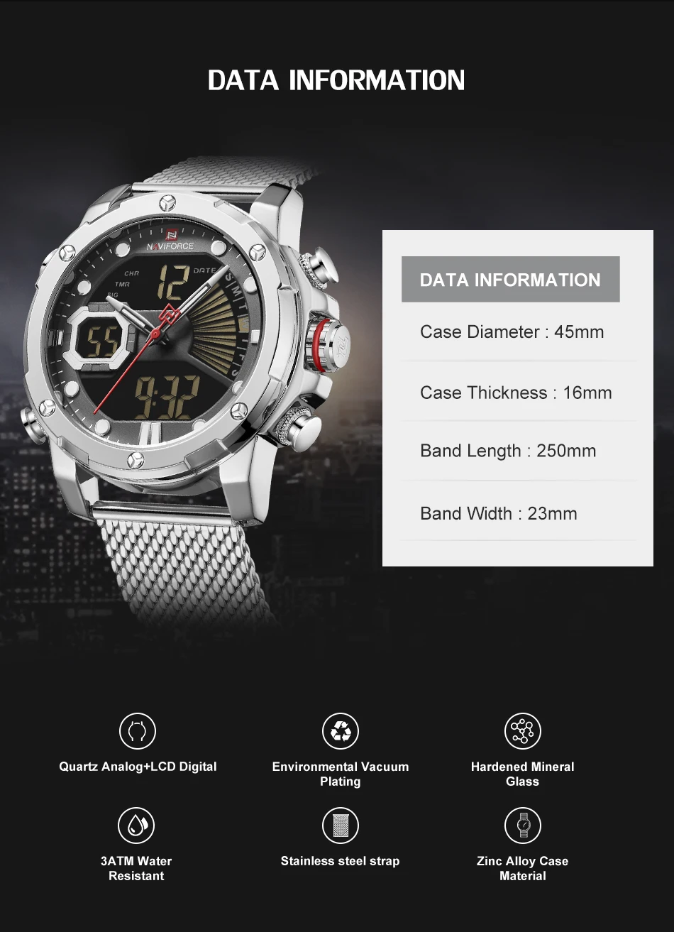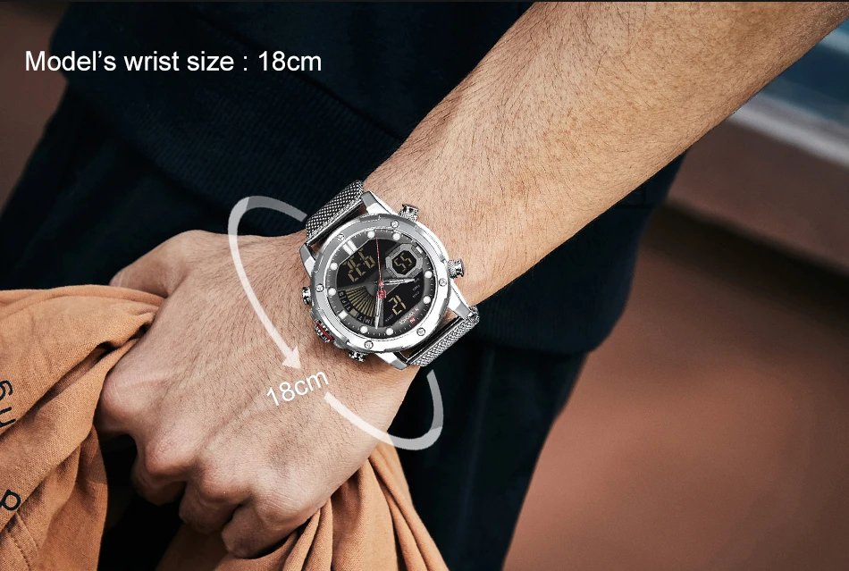 ---- ЖК-дисплей и светящиеся указатели ночью --- Многофункциональные кварцевые цифровые часы --- С водонепроницаемым ремешком для часов из нержавеющей стали Технические характеристики: Материал корпуса: сплав Чехол Диаметр: 45 мм Чехол Толщина: 16mm Материал ремешка: нержавеющая сталь Длина ремешка (включая чехол): 250 мм Ширина ремешка: 23 мм Вес: 156 г-Отображение даты и времени
