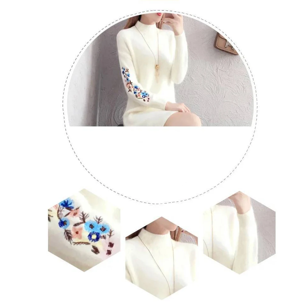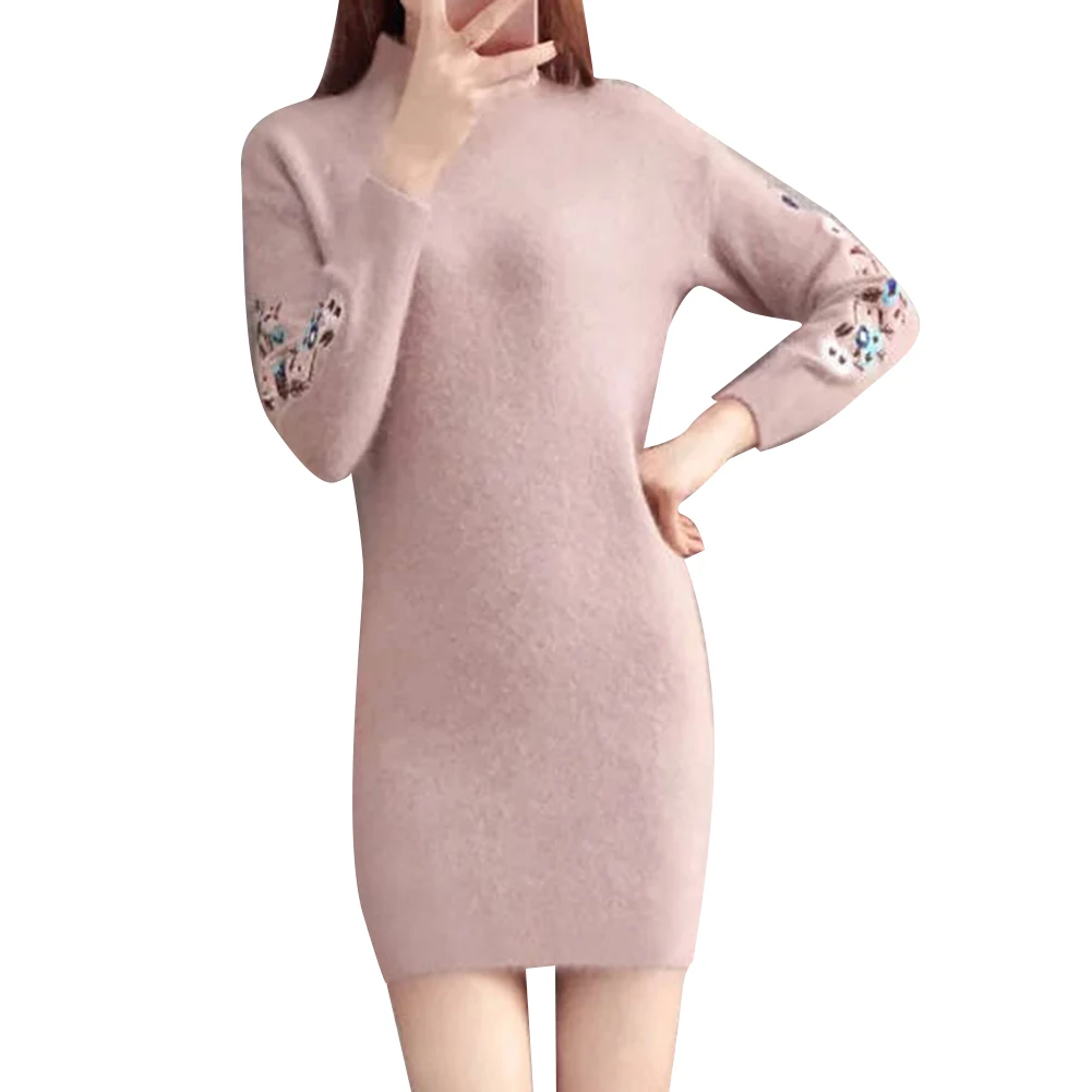 Зимний женский Повседневный вязаный свитер с цветочной вышивкой и длинным рукавом и круглым вырезом мини-платье