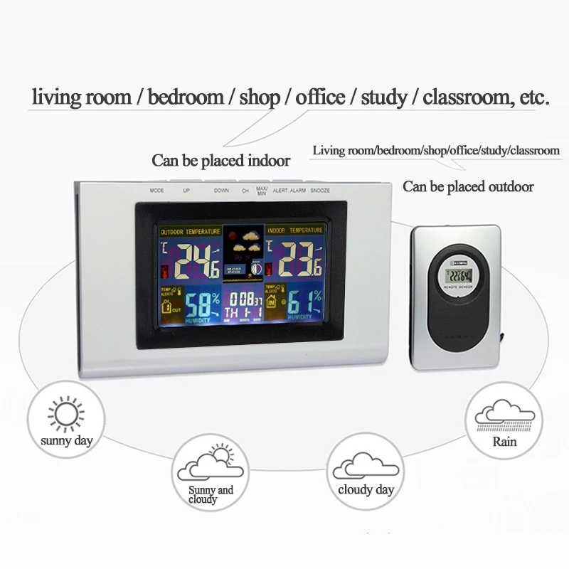 <Многофункциональность: отображает время, дату, погода, внутреннюю и внешнюю температуру и влажность с цветными значками, которые делают эту метеостанцию потрясающей.