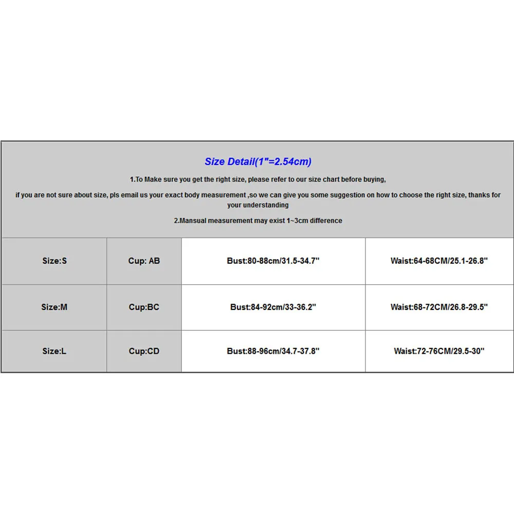 Размер: S Чашка: AB Бюст: 80-88 см/31,5-34,7" Талия: 64-68 см/25,1-26,8 дюйма Размер: M Чашка: BC Бюст: 84-92 см/33-36,2" Талия: 68-72 см/26,8-29,5 дюйма Размер: L Чашка: CD Бюст: 88-96 см/34,7-37,8" Талия: 72-76 см/29,5-30 дюймов