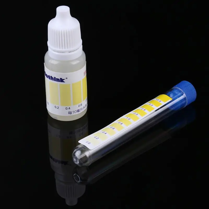 1. Откройте пробку, добавьте воду в линию отметки, 2 капли тестового раствора, закройте пробку и встряхните вверх и вниз, чтобы равномерно перемешать.