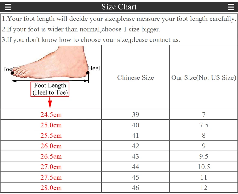 1. Измерение длины стопы является наиболее важным способом выбора правильного размера. Длина стопы не соответствует длине стельки. Длина стопы не соответствует длине подошвы. Длина стопы <длина стельки <длина подошвы 2. Новая обувь может иметь запах клея, пожалуйста, поймите. 3. Фото может быть ярким, но реальный продукт может быть немного темным, пожалуйста, поймите разницу. 4. Мы упаковываем обувь в пенополиэтиленовый пакет, что может сделать обувь немного мятой, пожалуйста, поймите. 5. Если вы считаете, что наше качество не очень хорошее, пожалуйста, обратитесь за помощью в нашу службу поддержки клиентов.