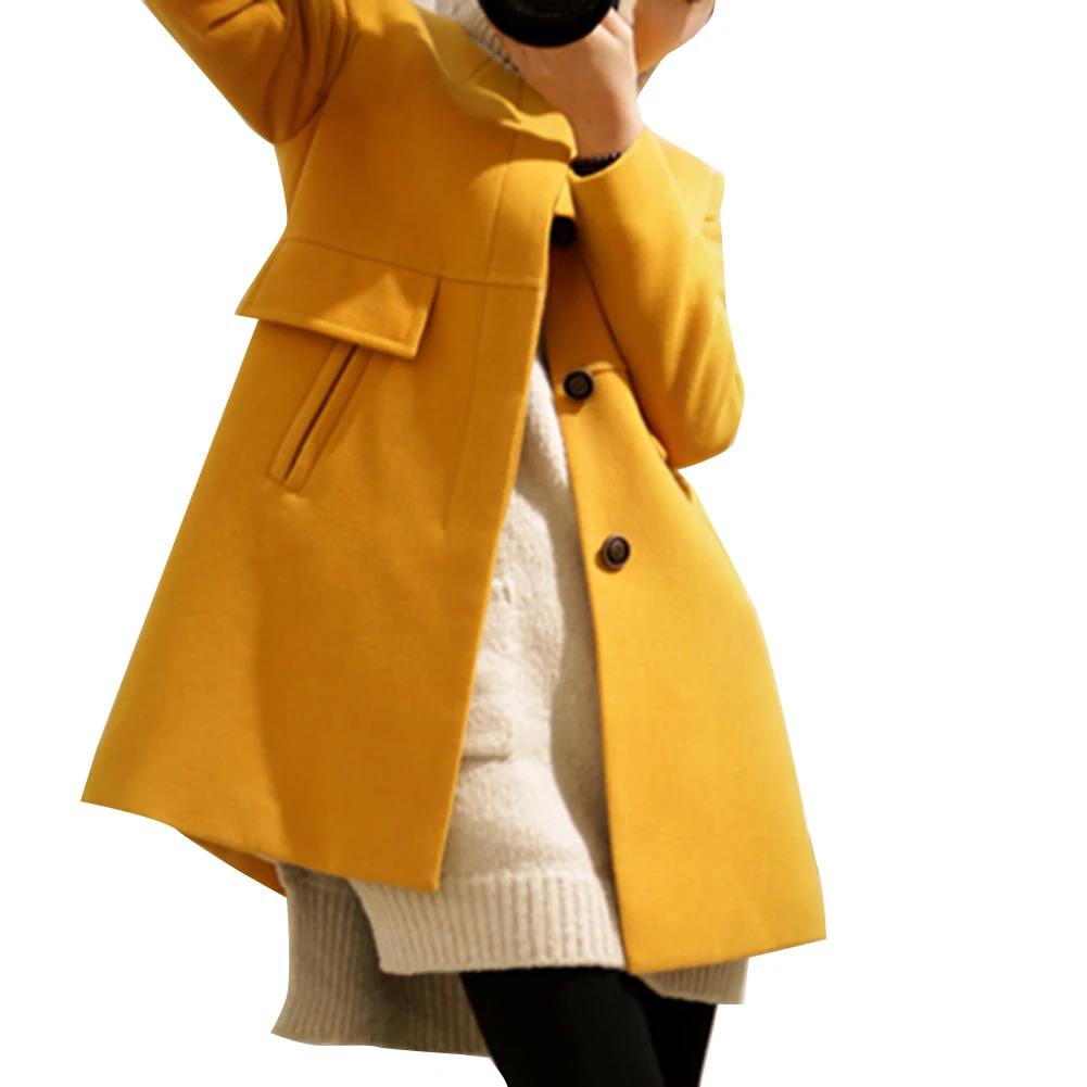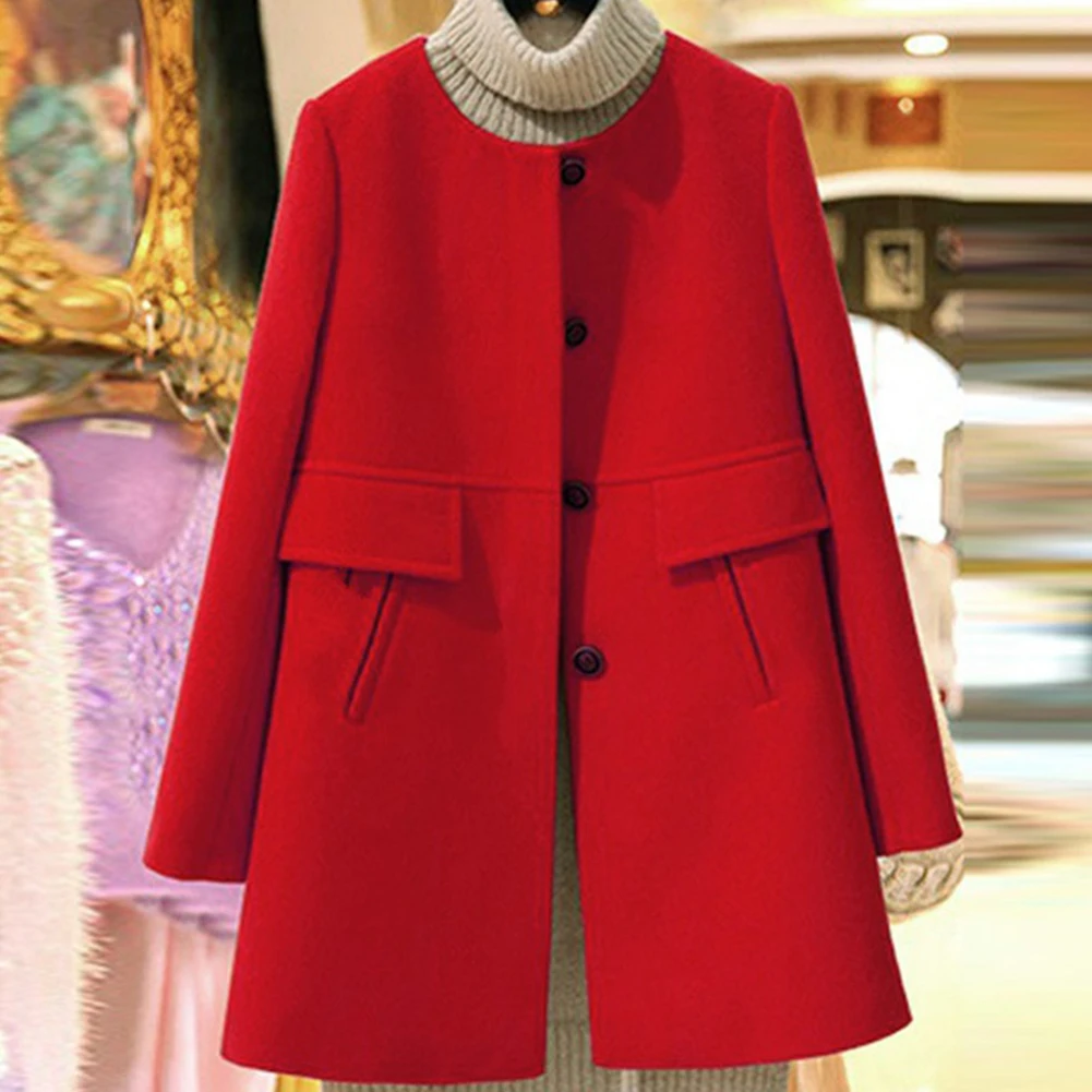 Женский зимний свободный шерстяной Тренч с длинным рукавом и круглым вырезом, карманами на пуговицах, размера плюс