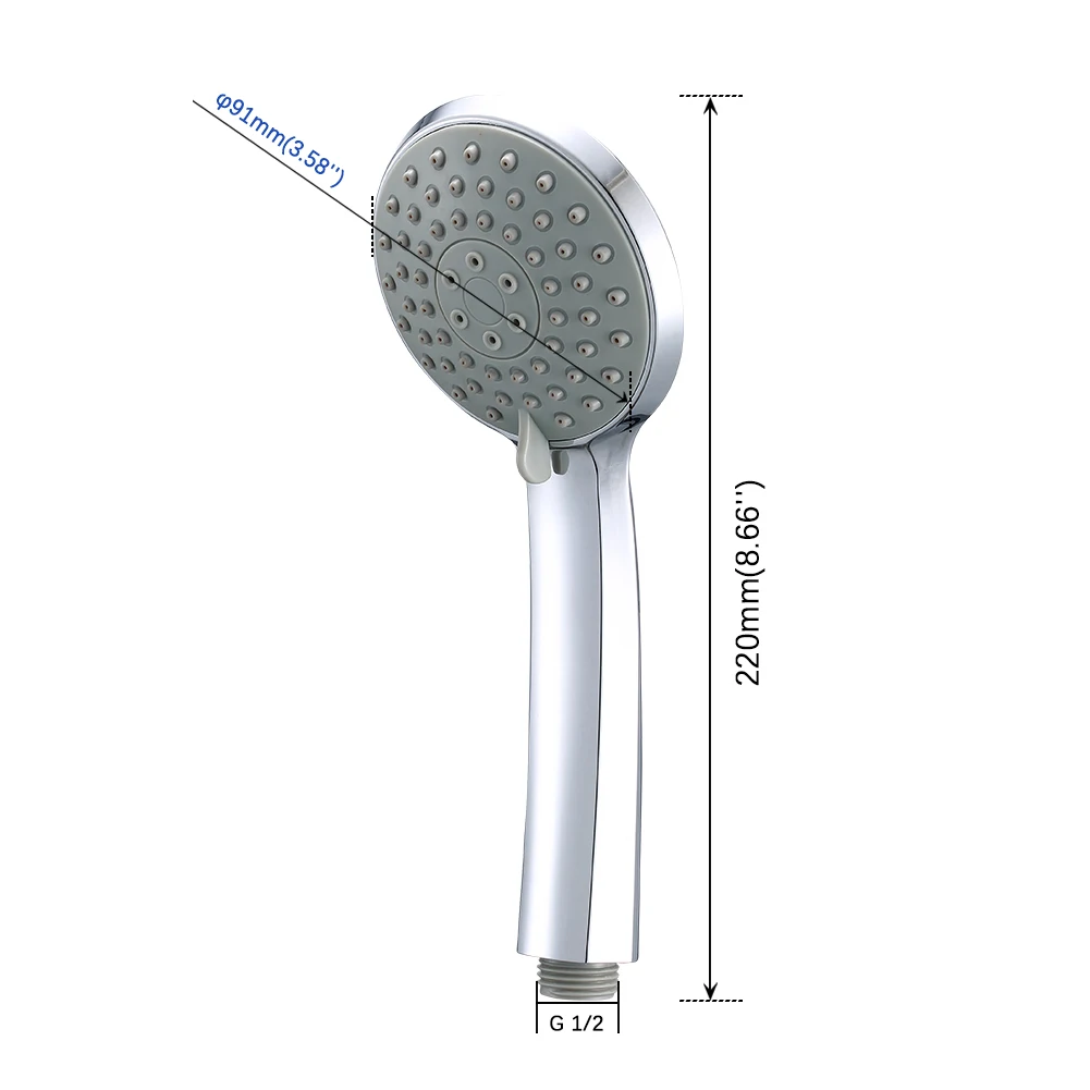 Material: ABS plastic Faceplate diameter: φ91mm (3.58’’) Length: 220mm(8.66’’) Interface standard: G 1/2, diameter: 20mm Surface finish: Chrome Plated Color: Light grey faceplate+ chrome No. of Functions: 3 function Working Temperature: 0°- 90°