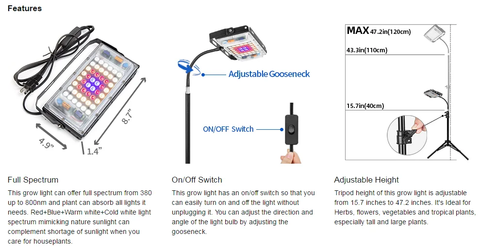 2020 Модернизированный дизайн-Регулируемая подставка для штатива, расширяемая от 15 дюймов до 47 дюймов, просто установите ее на желаемой высоте для вашего предпочтительного использования, вы можете выдержать его на полу и отрегулировать гусиную шею под нужным углом в соответствии с потребностями завода. Полный спектр-компактный растущий свет с высококачественными супер яркими светодиодами, полный спектр 390nm-730nm, включая белый (3500K & 6500K) красный и синий. Растения могут получить спектр, который они больше всего желают от этого растительного светильник. Подходит для всех этапов роста, таких как сеялка, прорастание, растительное и цветение. Энергоэффективность-30 Вт Мощность тяги, заменить 150 Вт HPS или HID растут светильник с только 30 Вт потребления, экономя Ваш Электрический счет. Хорошо подходит для использования в помещении. Простота установки-всего за одну минуту! Прикрутите штатив, гусиная шея и растительный светильник, Отрегулируйте высоту и угол, сделано! Широко используется-широко применяется для сеялки/разведения, садоводства, цветочного шоу, горшечных растений, особенно высоких и больших растений. Гарантия 12 месяцев плюс гарантия 30 дней или возврат, 100% возврат денег. Сначала свяжитесь с нами, если возникнут какие-либо проблемы, и мы сделаем все в порядке.