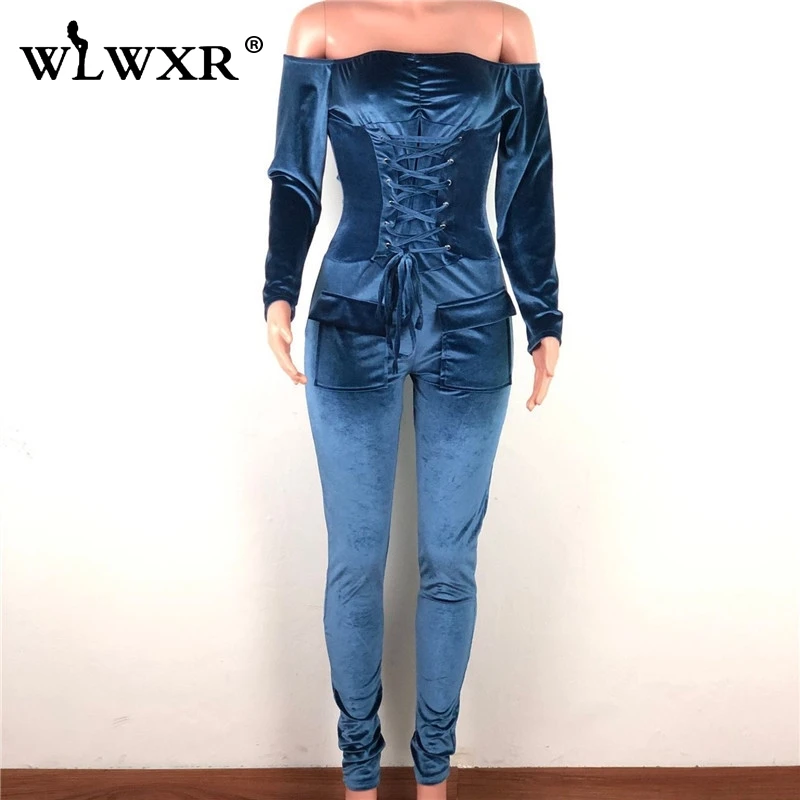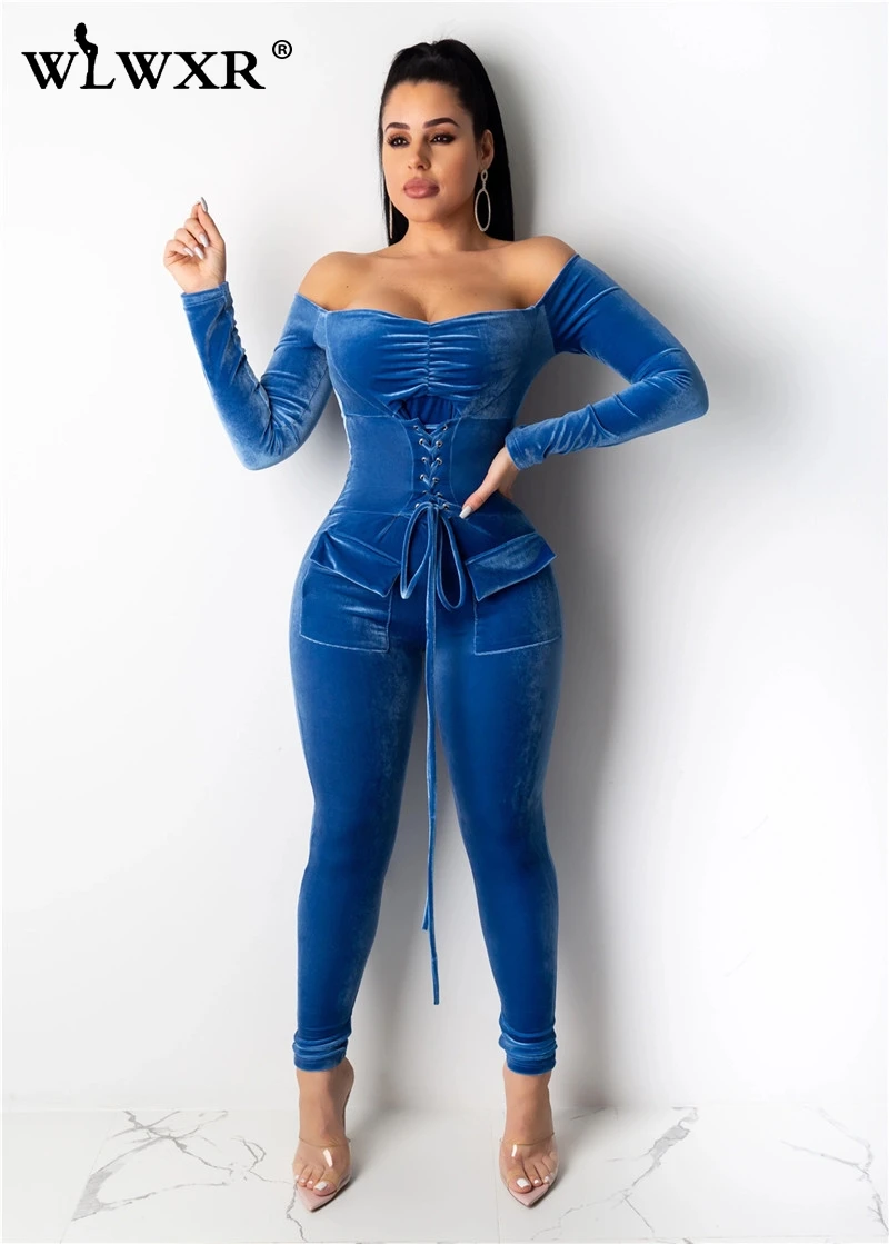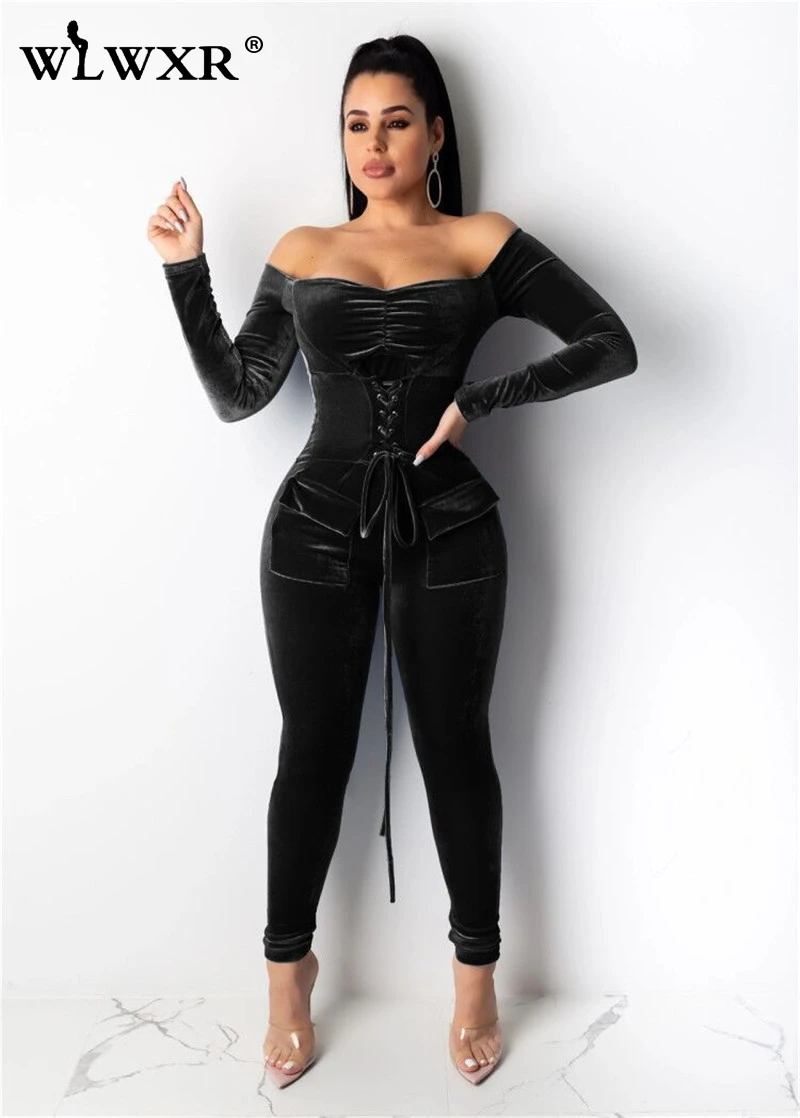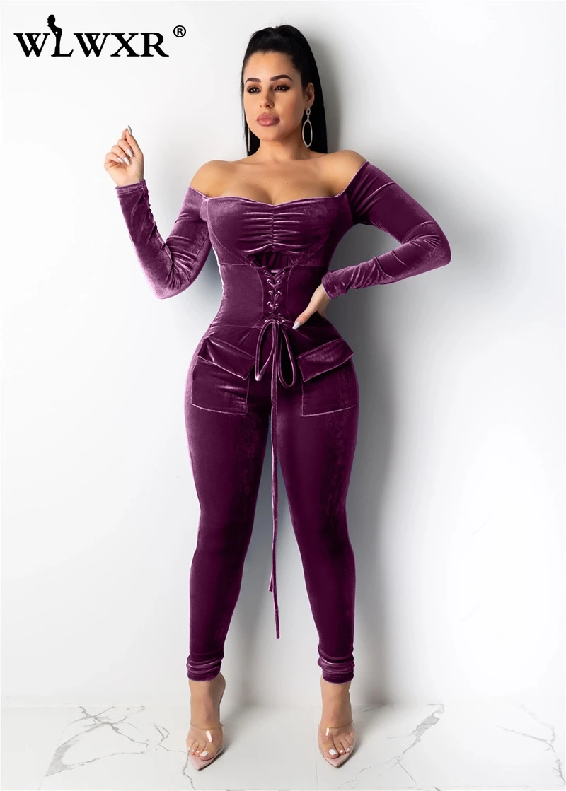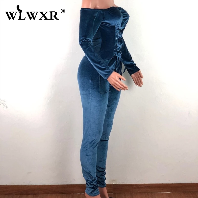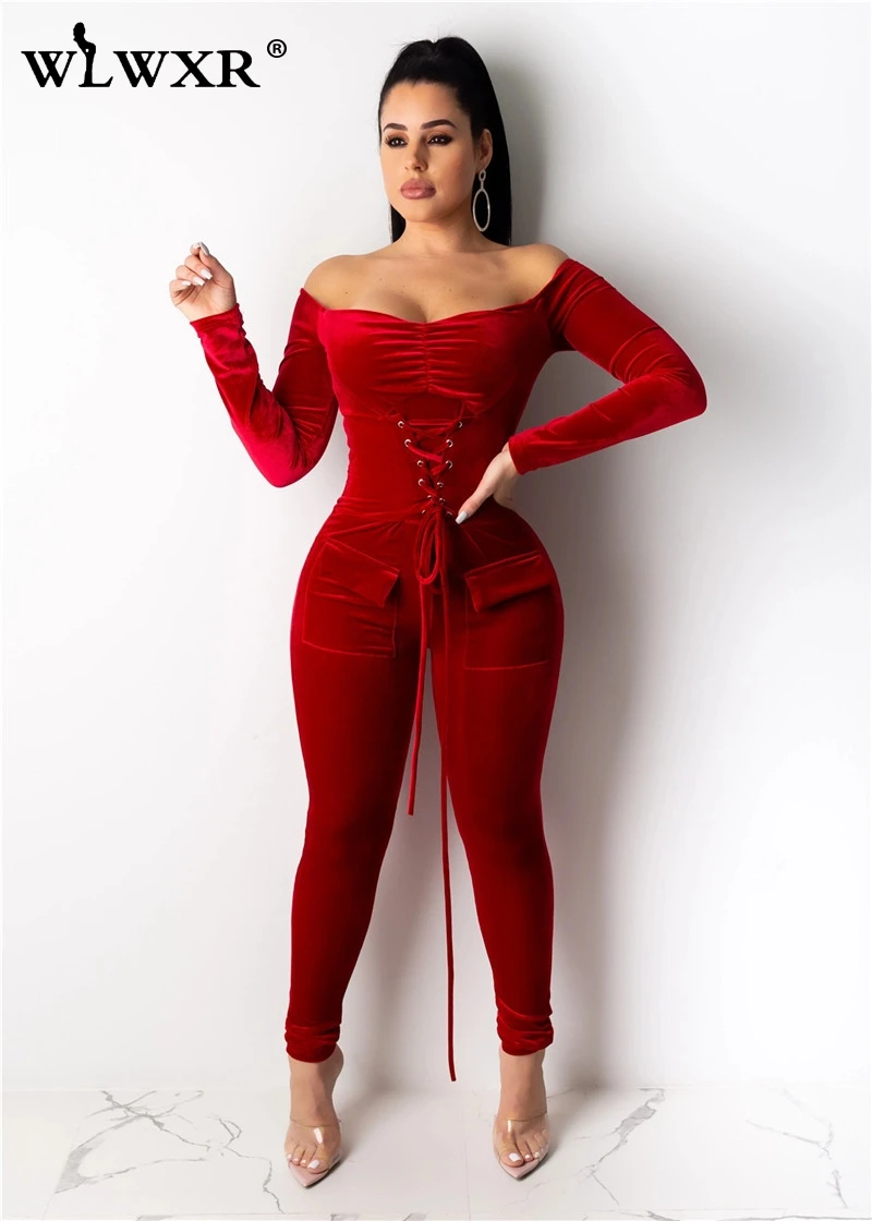 WLWXR бархатный красный бандаж сексуальный комбинезон женский с открытыми плечами облегающий с длинным рукавом Зимний женский комбинезон женские Комбинезоны