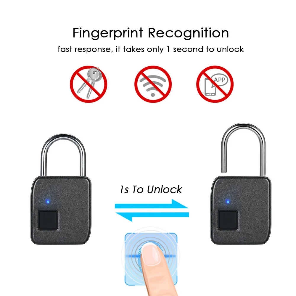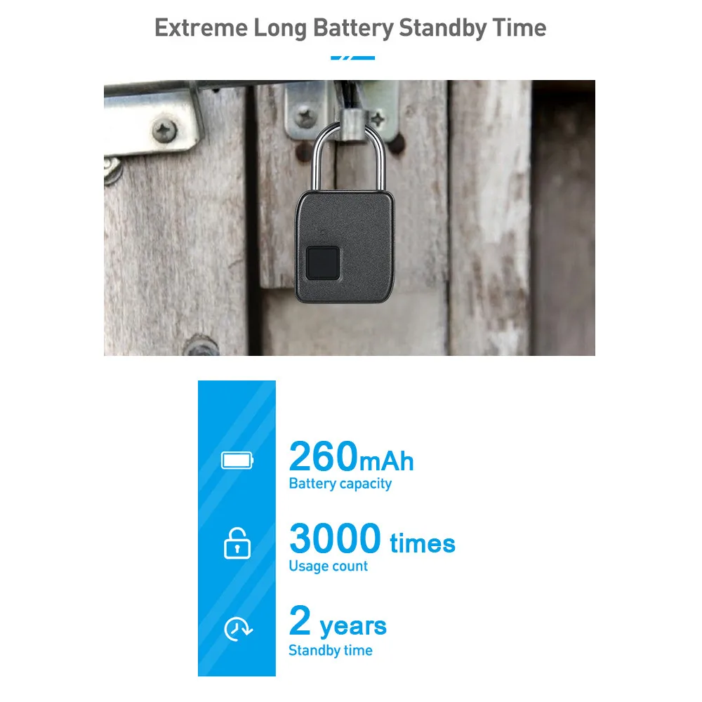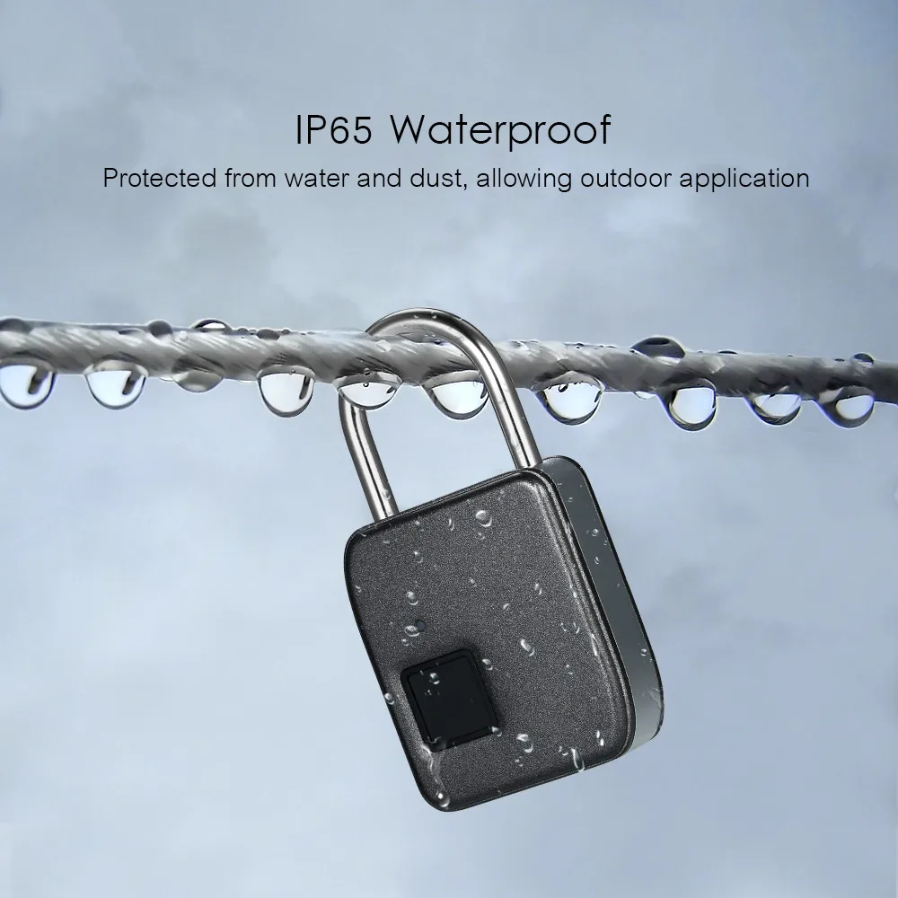 DescriptionFeatures:Wide Application: perfectly used for doors, cabinets, bikes, backpacks, storage lockers, etc.Easy Operation: no need any tools, you can add or delete fingerprints easily by following the instructions of the user manual.10 Groups of Fingerprints: the padlock supports up to 10 fingerprints recording(including one administrator).USB Rechargeable: built-in a 260mAh polymer battery, charge for 2 hours use 3000 times, standby for 2 years.IP65 Waterproof: can be protected from water and dust. High waterproof grade allows outdoor application.With LED Indicator: with 3-color indicator to represent different status.Fast Response: super CPU, good recognition, low error rate, 1 second to unlock.Enhanced Security: zinc alloy metal body construction and high toughness steel shackle, durable to use. Note: 1. Please do not operate the fingerprint padlock when charging.2. Do make sure the output of adaptor is 5V when charging.3. The first fingerprint is the administrator fingerprint by default.4. Only the administrator can delete the fingerprint and delete all the fingerprints at once. Specifications:Color: BlackMaterial: Zinc AlloyBattery: Built in a 3.7V 260mAh 061727 Polymer BatteryCollecting Time: ≤0.5sMatching Time: ≤1sFRR: <1%FAR: <0.002%Power Supply: 5V 200mAStand-by Time: 2 YearsWaterproof: IP65Working Temperature: -20℃~55℃Working Humidity: 40%~90%(without Condensation)Item Size: 7.4 * 4.3 * 1.5cm / 2.9 * 1.7 * 0.6in(L * W * H)Item Weight: 84g / 3.0ozPackage Size: 11.3 * 7.9 * 3.5cm / 4.4 * 3.1 * 1.4inPackage Weight: 161g / 5.7oz Package List:1 * Fingerprint Lock1 * Type-C USB Cable(without Plug)1 * User Manual(English)Постоянно пользуюсь часами, удобно, что для любого случая можно менять цвет ремешка. У меня уже целая коллекция таких. Чёрный и... Читать отзыв полностью...