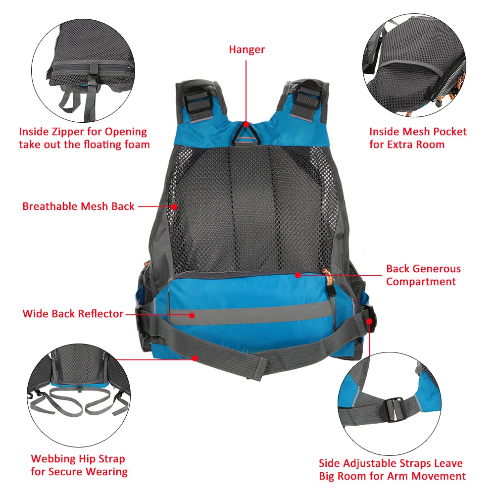 This fishing Life jacket looks more like a tactical vest with total 11 zippered pockets and multi attachment Ladders and accessory loops on its front and wide reflectors on the back and shoulder. Underneath the tactical exterior it’s a fully functional flotation device which is detachable for functioning as a shear fishing gear carrier. And this vest will fit almost any person due to webbed adjustable buckle straps. If your main priority id gear storage, this life vest is one of a kind. It’s great for fly fishing, kayak fishing, canoe fishing (pretty much any type of fishing).