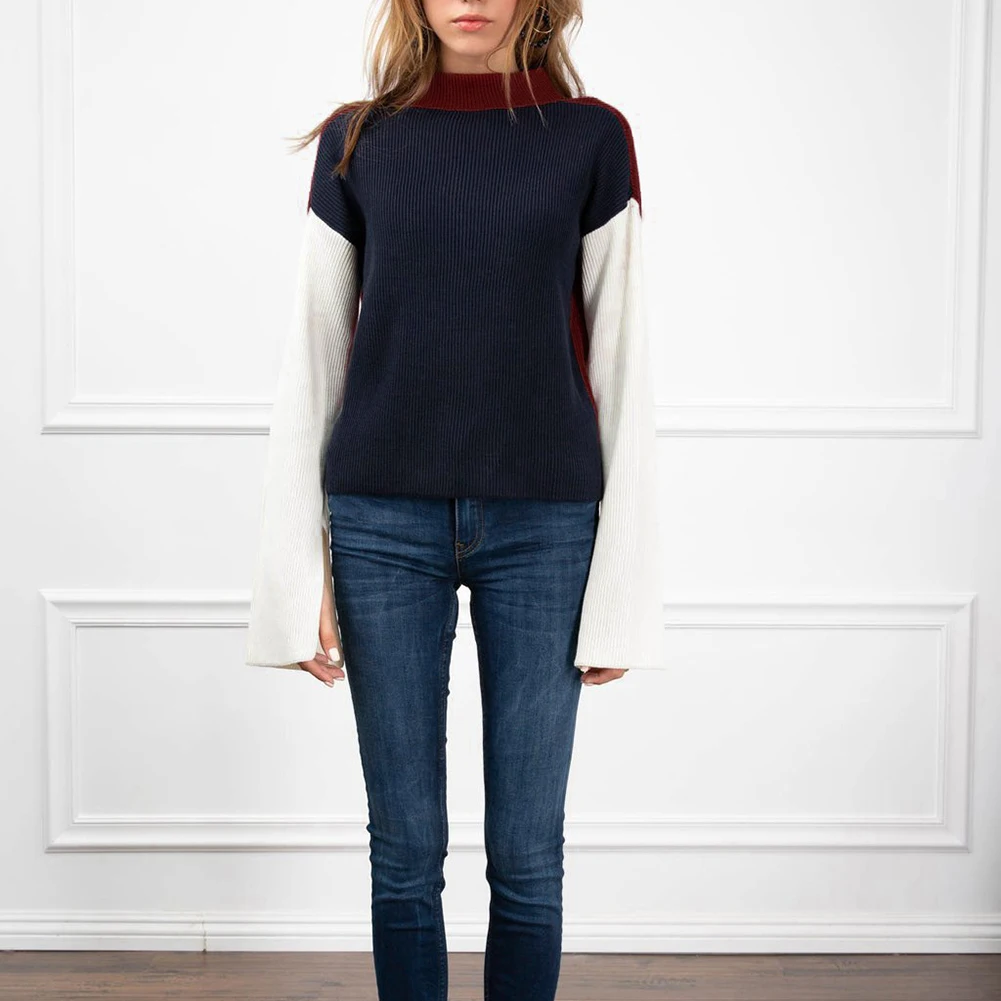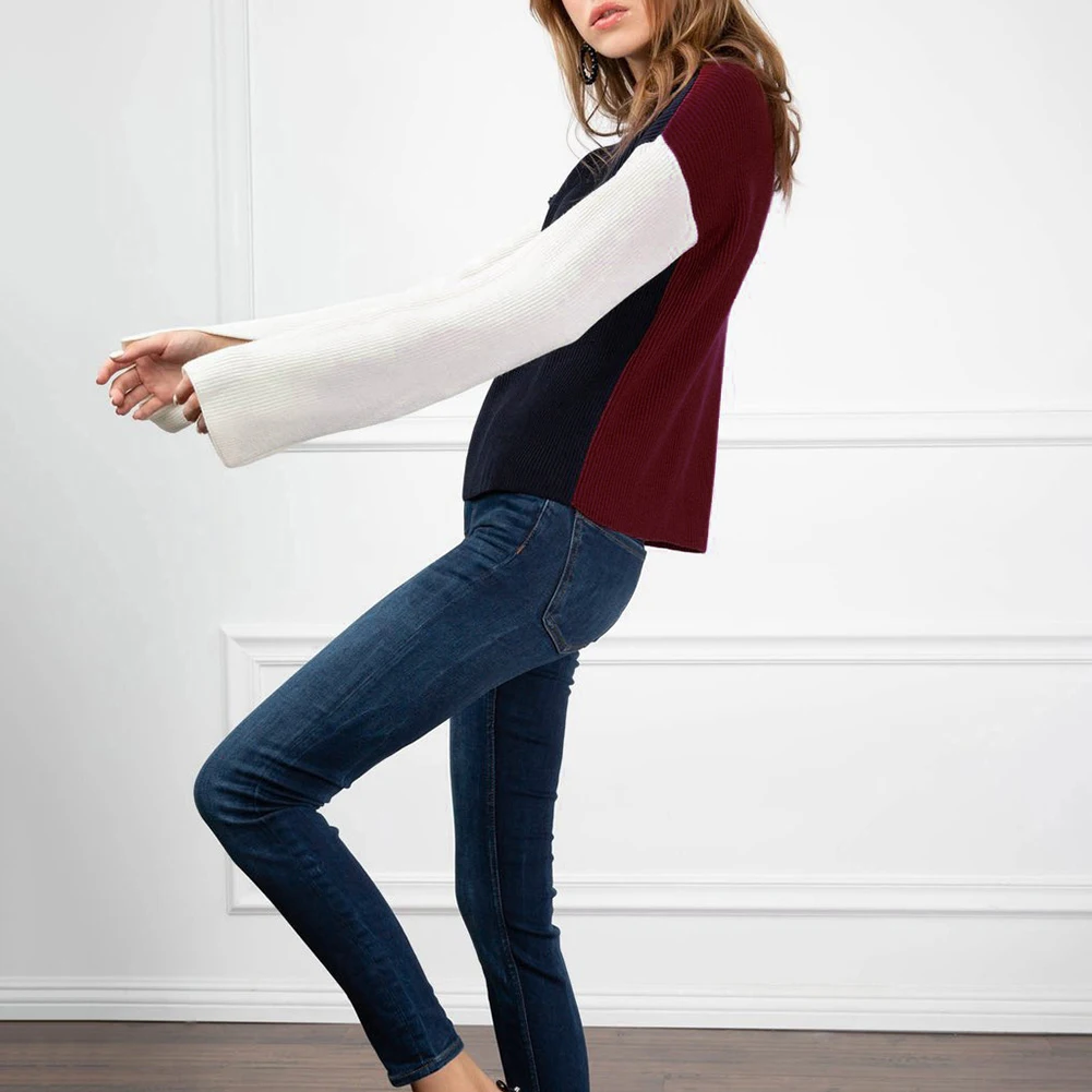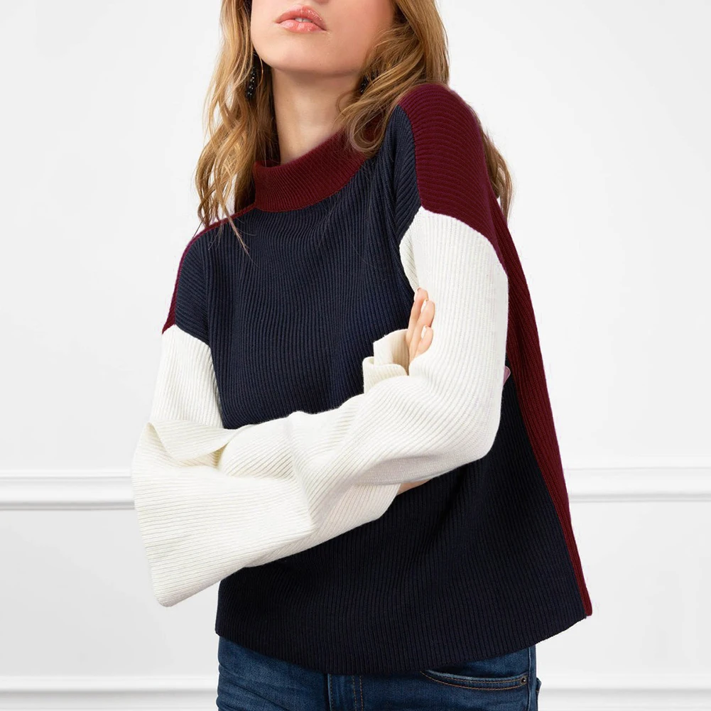 Модный зимний женский свитер, топ с цветными блоками, ребристый свитер с длинным рукавом, вязаный пуловер