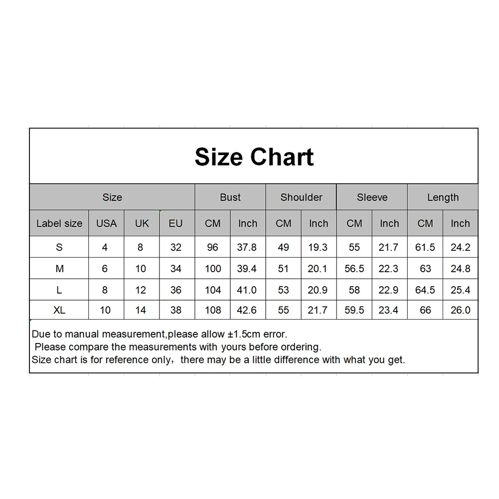 [Наш Размер S] Ширина плеч: 49 см/19,29 дюйма, длина рукава: 55 см/21,65 дюйма, обхват груди: 96 см/37,80 дюйма, длина: 61,5 см/24,21 дюйма (прибл.)