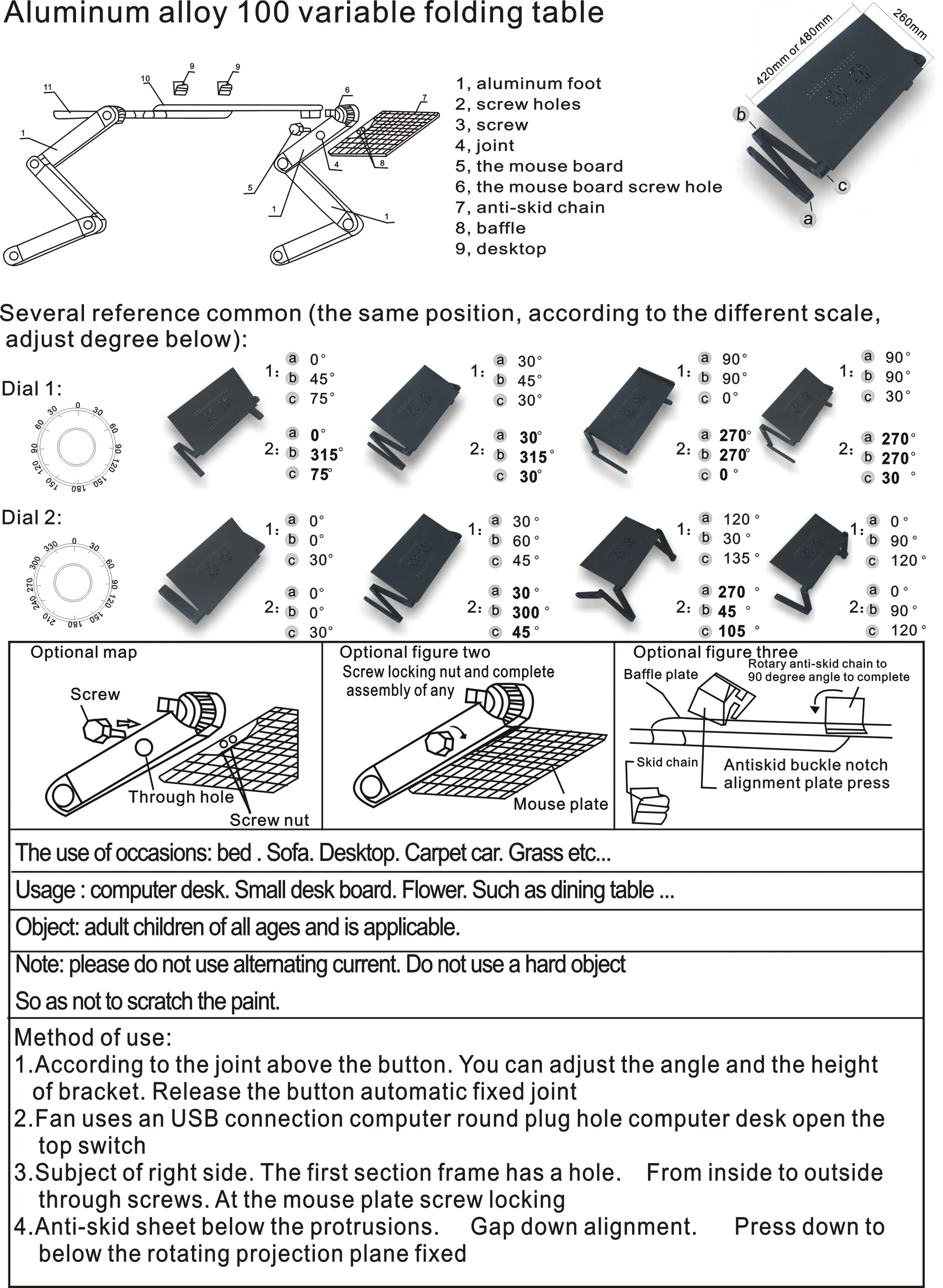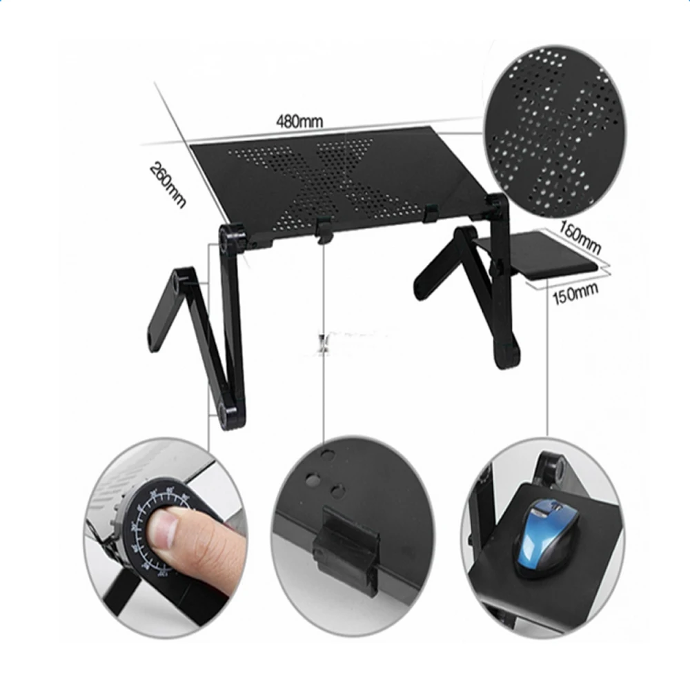 Введение: Это портативный и Универсальный складной компьютерный стол, который можно разместить на столе, чтобы быть стоящим столом, или на кровати или в любом месте, где вы хотите комфортно использовать ноутбук! Вы также можете положить книги или таблетки, чтобы свободные руки. Складные ножки стола можно поворачивать на 360 градусов. Зафиксируйте положение под разными углами. Нажмите на ручку регулировки, чтобы отрегулировать угол. Ручка имеет шкалу для подтверждения угла и регулировки баланса стола. Ножки изготовлены из алюминиевого сплава, который отличается прочностью и гибкостью. Особенности: 1. Ножки изготовлены из алюминиевого сплава, а регулировочные ручки изготовлены из АБС-пластика, который очень прочный и гибкий. Ноги можно поворачивать на 360 градусов, фиксировать под разными углами, обеспечивая наиболее удобный угол набора текста и уменьшая давление на шею и плечи. Отпустите боли в спине 2. Может использоваться в качестве подносы для завтрака, размещения аудио оборудования, проекторов, стоек для ноутбуков, книжных лотков, письменных столов и других стендов для ноутбуков 3. Включает панель мыши, которая может быть установлена на правой ножке 4. Две противоскользящие пряжки можно установить на край стола. Когда рабочий стол наклонен под углом, это может предотвратить скольжение элемента вниз 5. Сборка не требуется. Угол ножки стола регулируется пружинной пряжкой без дополнительных инструментов Примечание: 1. При получении товара, пожалуйста, подтвердите продукт в соответствии с перечнем инструкций. Как только вы найдете меньше деталей, пожалуйста, предоставьте соответствующие фотографии, чтобы связаться с нами. Мы решим это в срок. 2. Пожалуйста, установите товар с инструкцией по эксплуатации. 3. Рекомендуется, чтобы установка не была слишком тугой для легкой регулировки. После установки конструкции, закрепите интерфейс для большей стабильности. Технические характеристики: 1. Размер рабочего стола: (18,9x10,24) ”/ (48x26) см (Д x Ш) 2. Диапазон регулировки высоты: 1,89-18,9 ”/4,8-48 см 3. Размер мыши: (7,09x6,3) " / (18x16) см (Д x Ш) 4. Материал: алюминиевый сплав и АБС жесткий пластик 5. Вес: 33 фунта/15 кг 6. Вес: 3.31lbs/1,5 кг 7. Цвет: черный Посылка включает в себя: 1 x складной компьютерный стол 1 x Мышь пластина 2 х противоскользящие пряжки Инструкция (1 шт.)