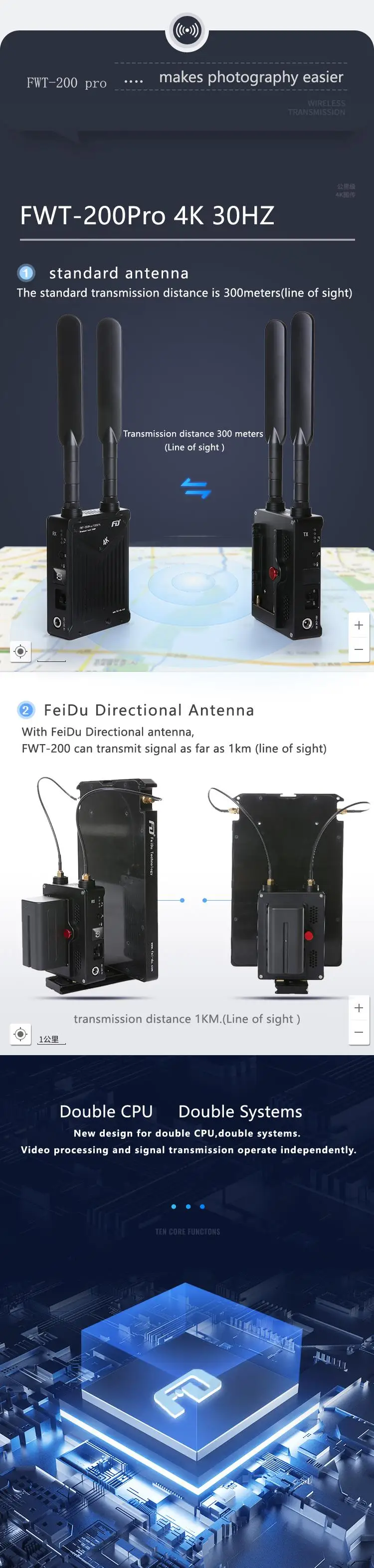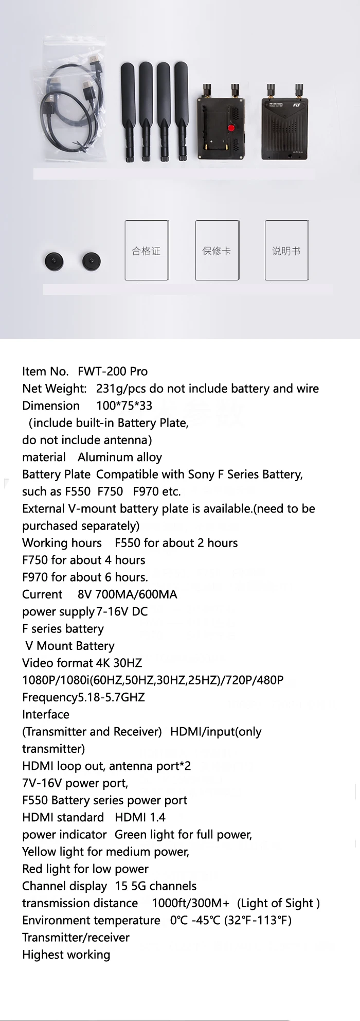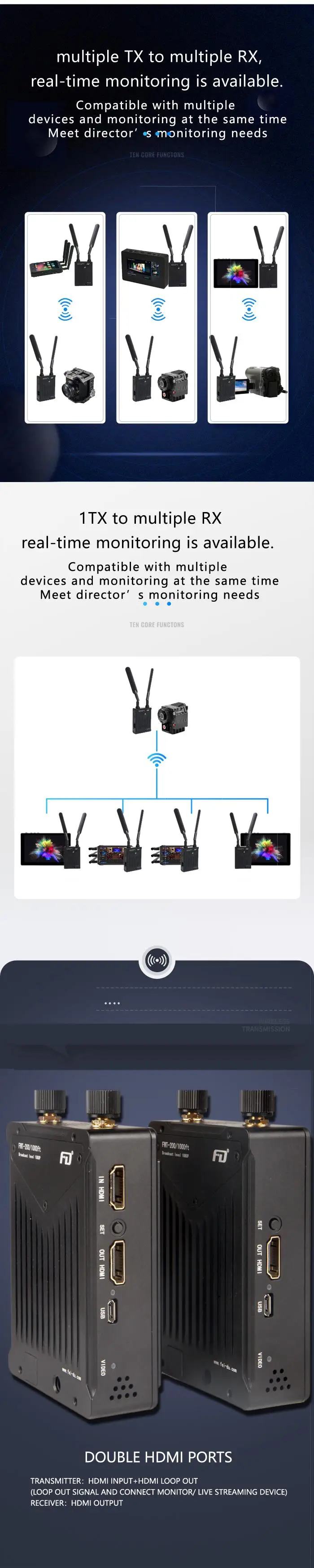 Вернём деньги, если не получите заказ через 90 дней после отправки.ОписаниеFeidu FWT-200pro 4K двойной HDMI Беспроводная система передачи 2106P 30Hz HD изображения видео передатчик приемник