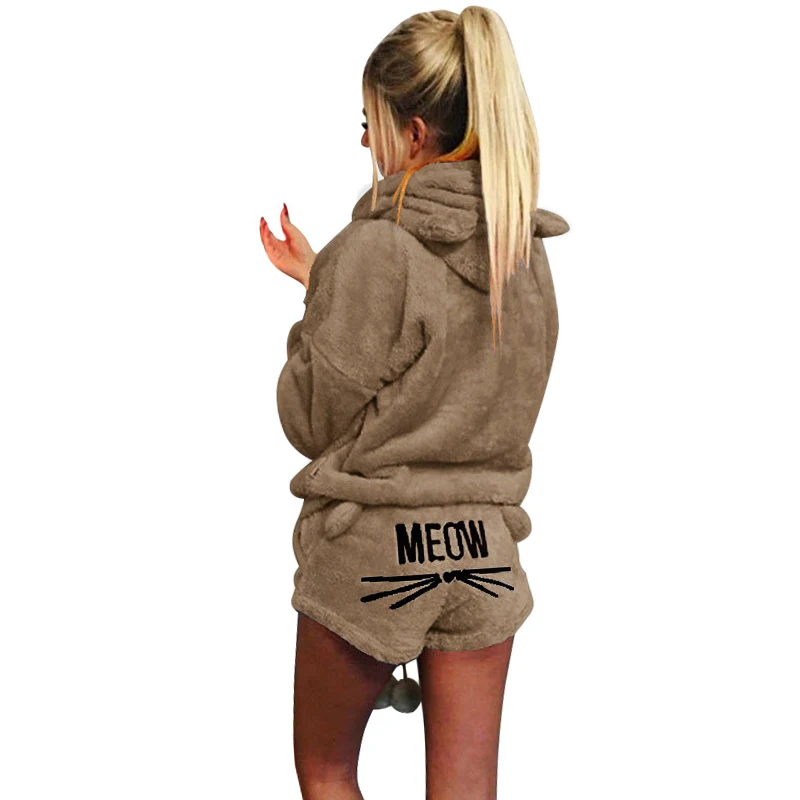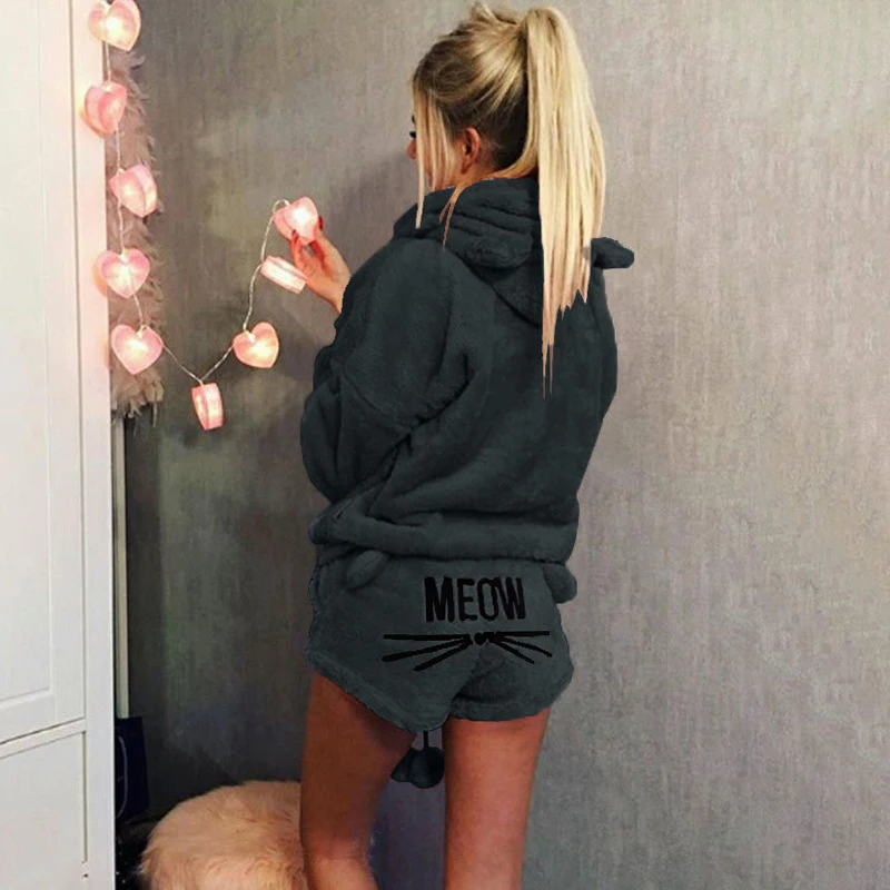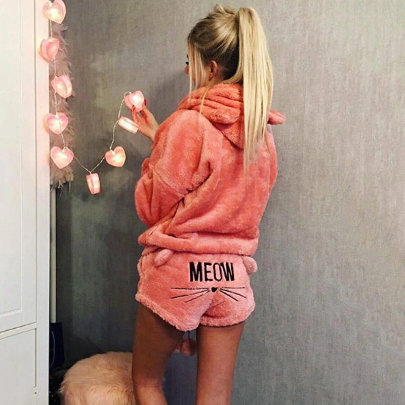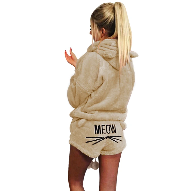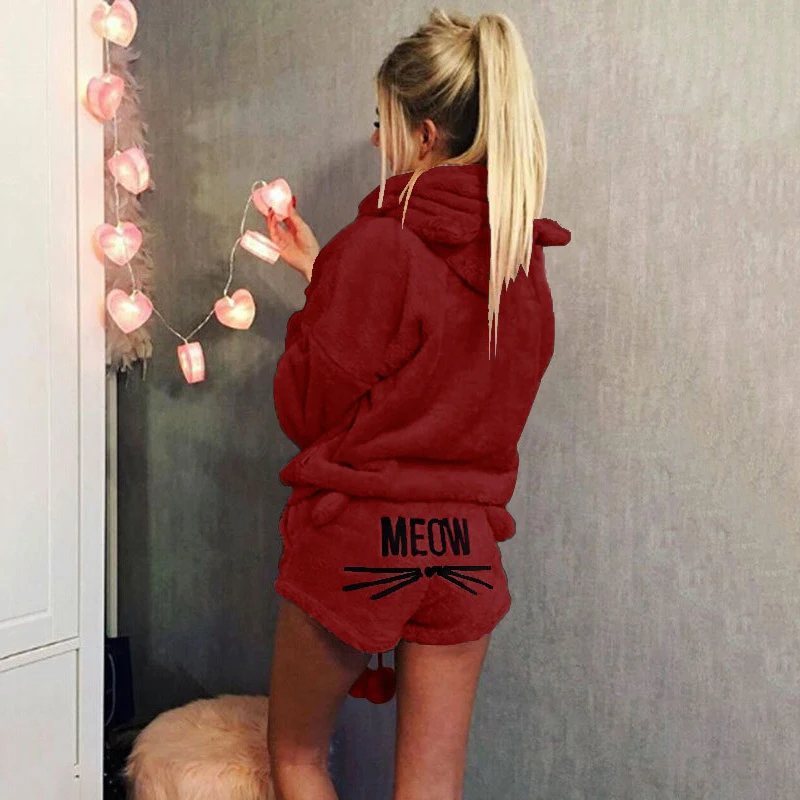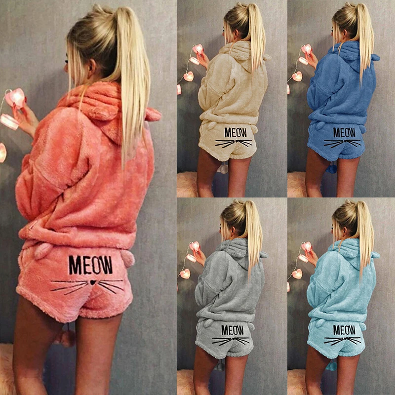 Эта толстовка с капюшоном и шорты-лучший выбор для отдыха дома. Очень удобная бархатная ткань кораллового цвета, милый рисунок кошки, воротник с капюшоном, спущенное плечо и эластичная талия на шорты. Он отлично сохраняет тепло и делает вас легко шикарным.