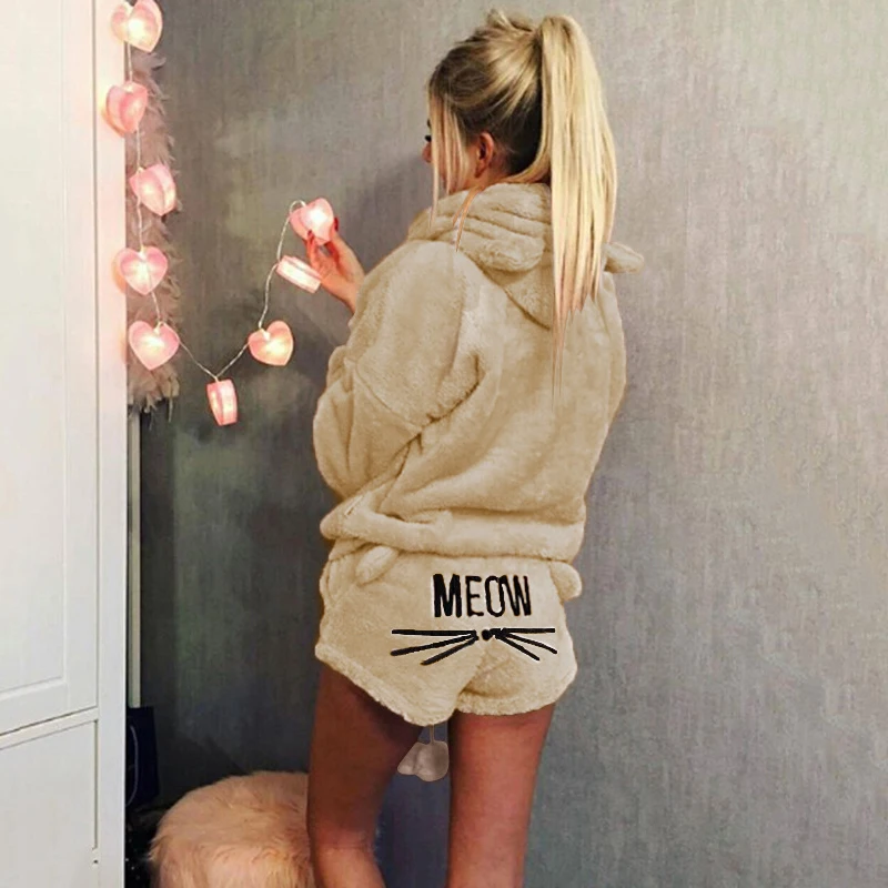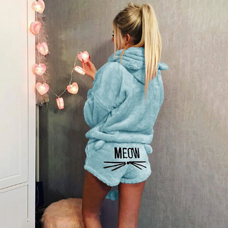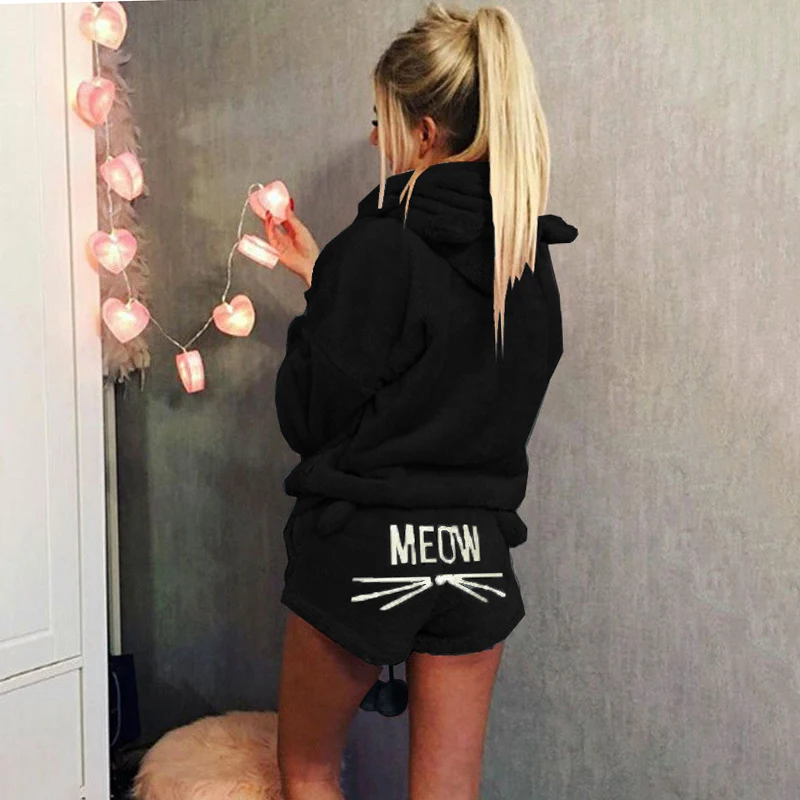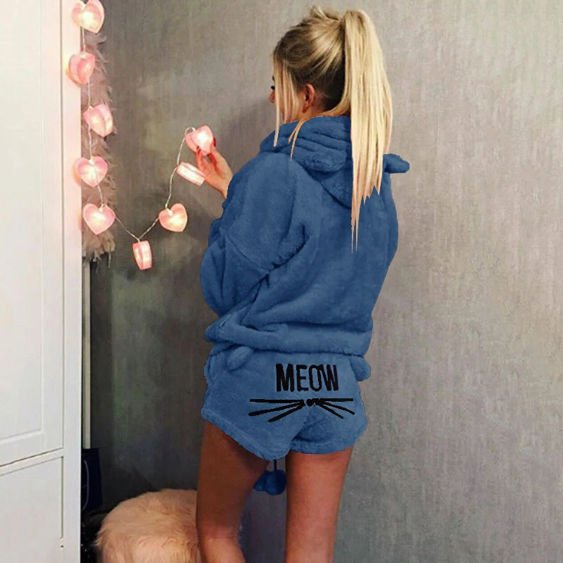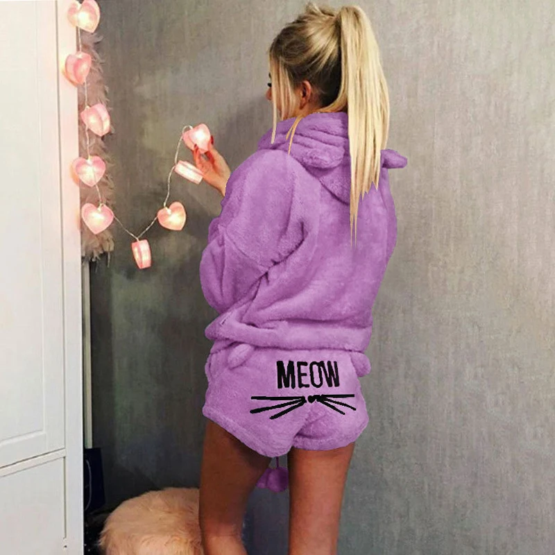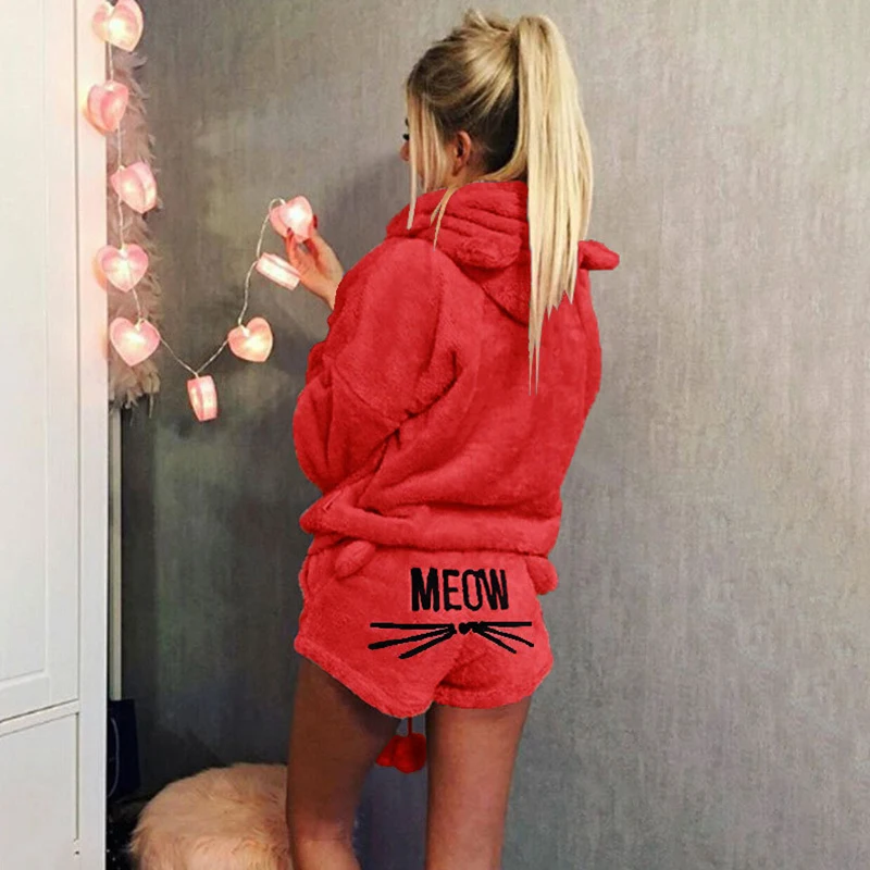 Эта толстовка с капюшоном и шорты-лучший выбор для отдыха дома. Очень удобная бархатная ткань кораллового цвета, милый рисунок кошки, воротник с капюшоном, спущенное плечо и эластичная талия на шорты. Он отлично сохраняет тепло и делает вас легко шикарным.
