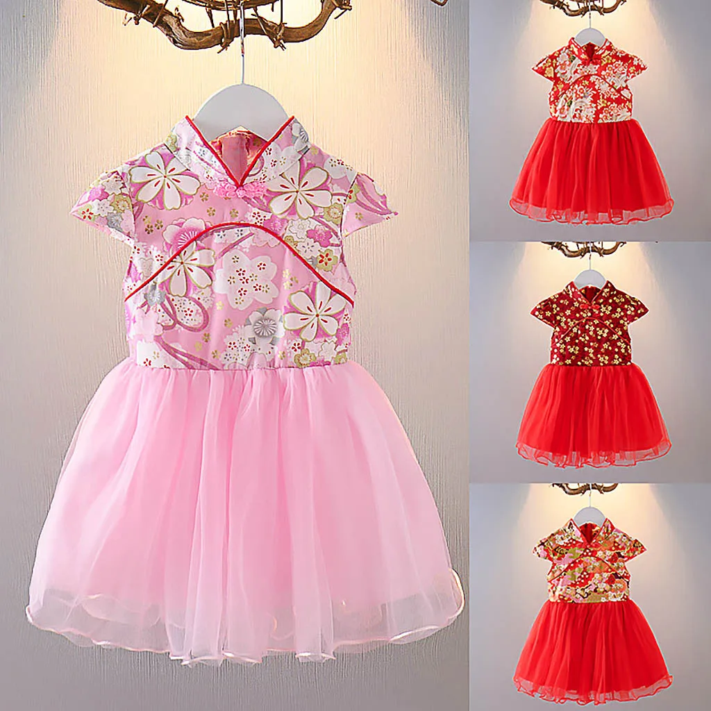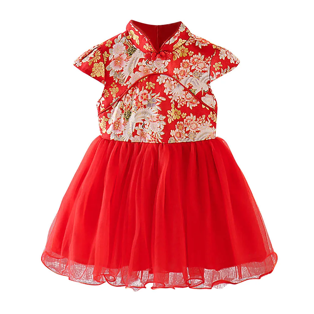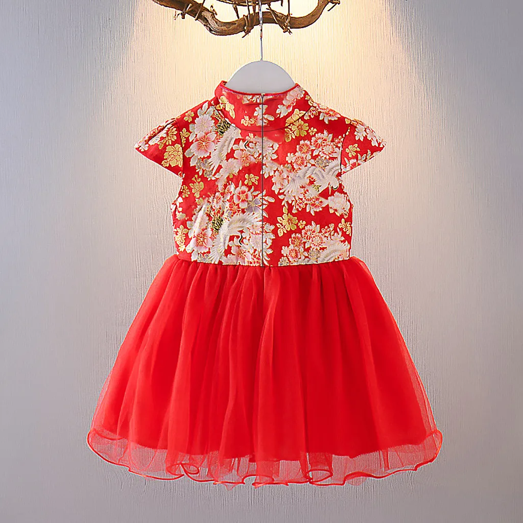 Детское платье Ципао для девочек, костюм принцессы с ярким цветочным принтом