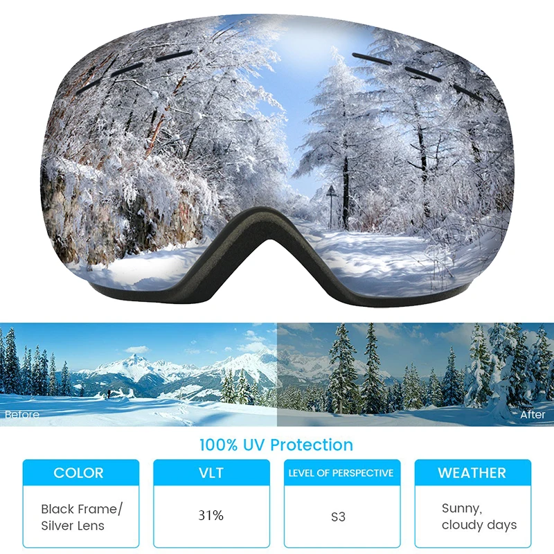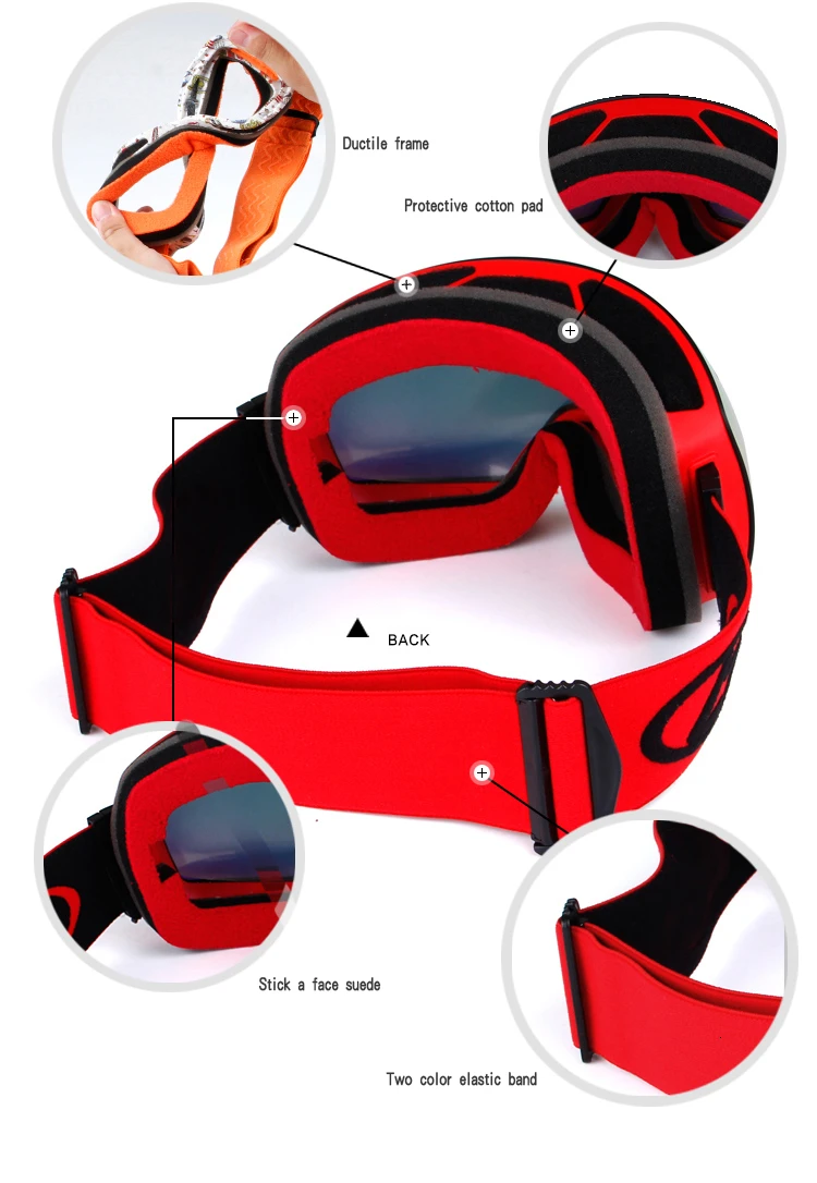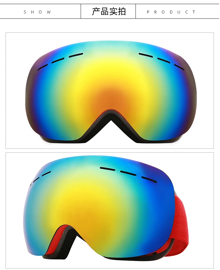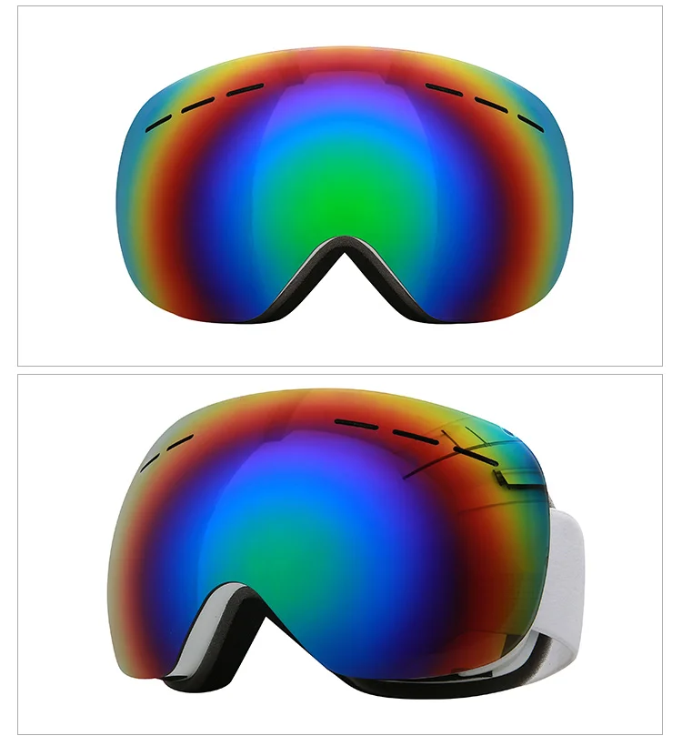 Характеристики продукта Тип очков: профессиональные лыжные очки Оптические характеристики линз: защита UV400, зеркальное покрытие Материал оправы: ТПУ Материал линз: поликарбонат Ширина линзы: 18,2 см Высота линз: 10,4 см Цвет оправы s: разноцветный Назначение: устойчивость к царапинам, ударам, ультрафиолетовому излучению, туману и другим функциям. Посылка входит 1 * очки для катания на лыжах 1 * сумка для очков 1 * коробка для лыжных очков