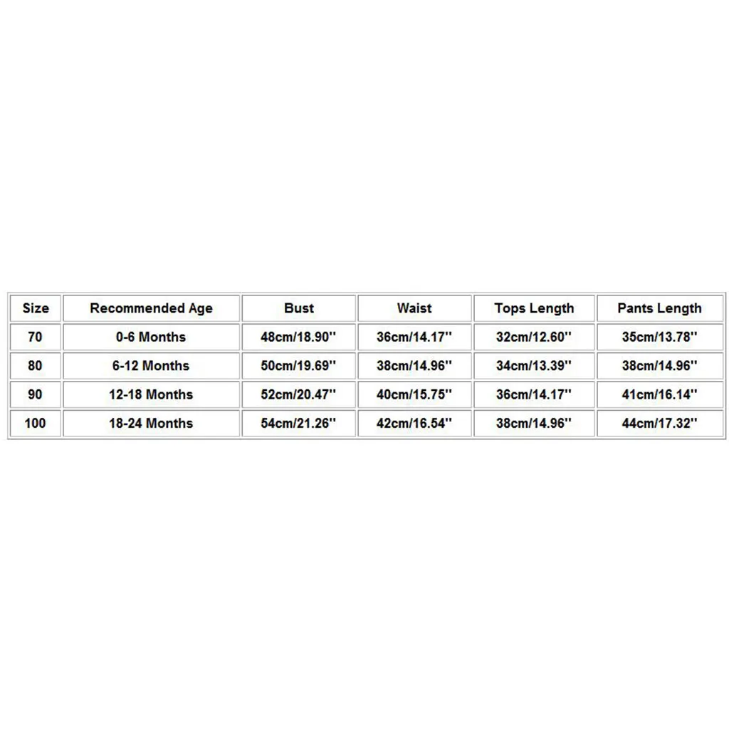 Размеры Рекомендуемый возраст Обхват груди Обхват талии Топы Длина Брюки Длина 70 Для детей от 0 до 6 месяцев 48 см/18,90'' 36 см/14,17'' 32 см/12,60'' 35 см/13,78'' 80 6-12 месяцев 50 см/19,69'' 38 см/14,96'' 34 см/13,39'' 38 см/14,96'' 90 12-18 месяцев 52 см/20,47'' 40 см/15,75'' 36 см/14,17'' 41 см/16,14'' 100 18-24 месяцев 54 см/21,26'' 42 см/16,54'' 38 см/14,96'' 44 см/17,32''