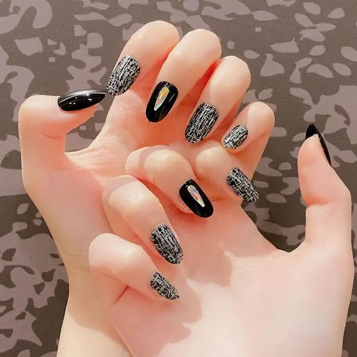 24 шт./коробка, Черные искусственные ногти средней длины со стразами, съемные ноготь, полное покрытие, искусственные ногти с клеем для девочек, сделай сам