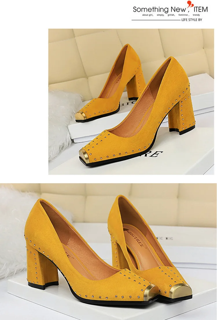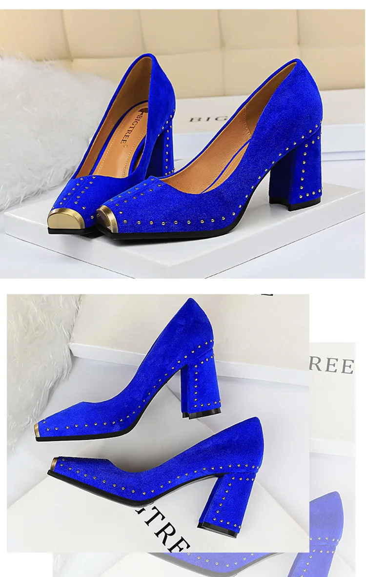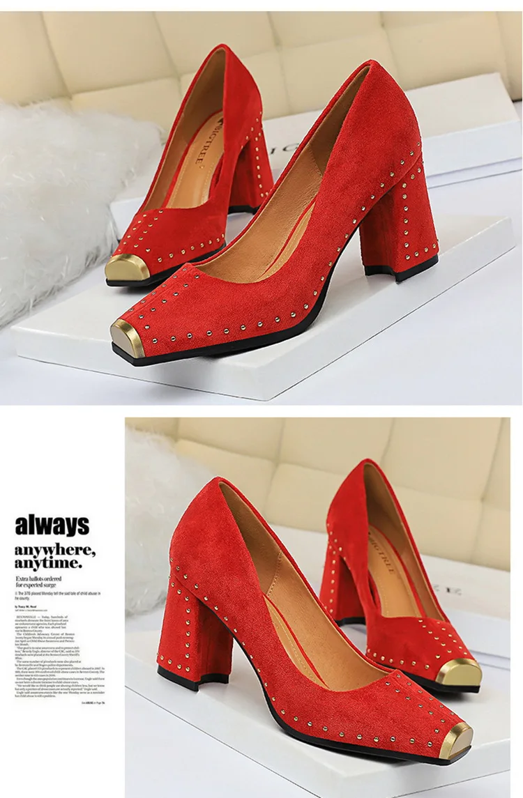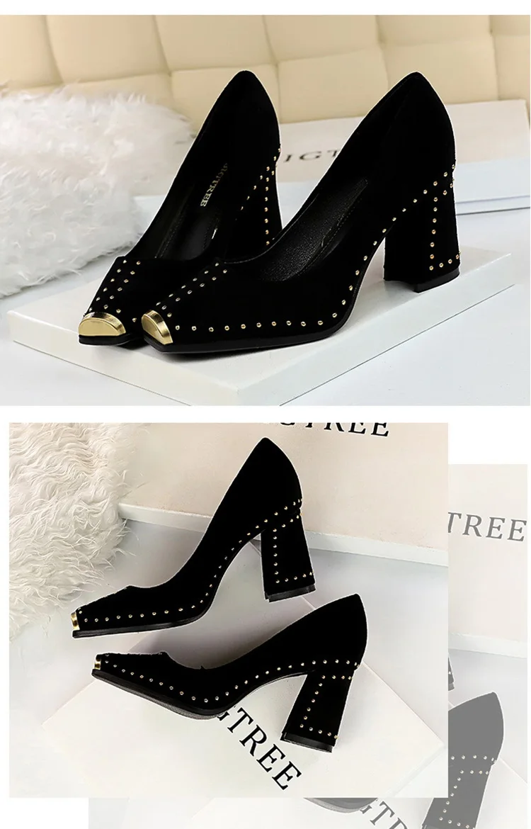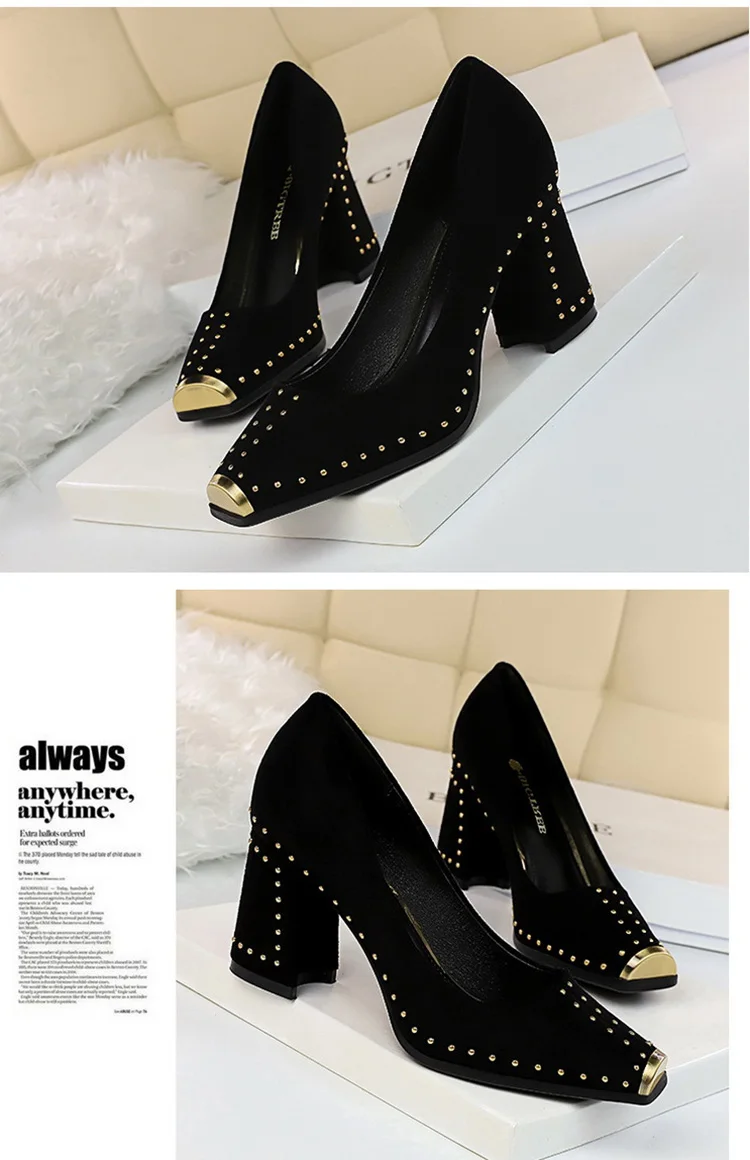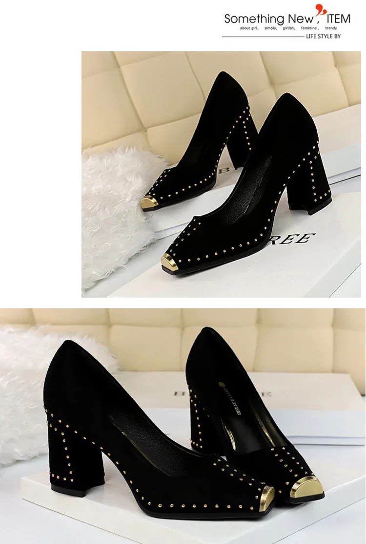 Новая обувь; женские туфли-лодочки; модные роскошные свадебные туфли на высоком каблуке; вечерние женские туфли на толстом каблуке с закрытым носком и заклепками; Цвет Черный; женская обувь на каблуке