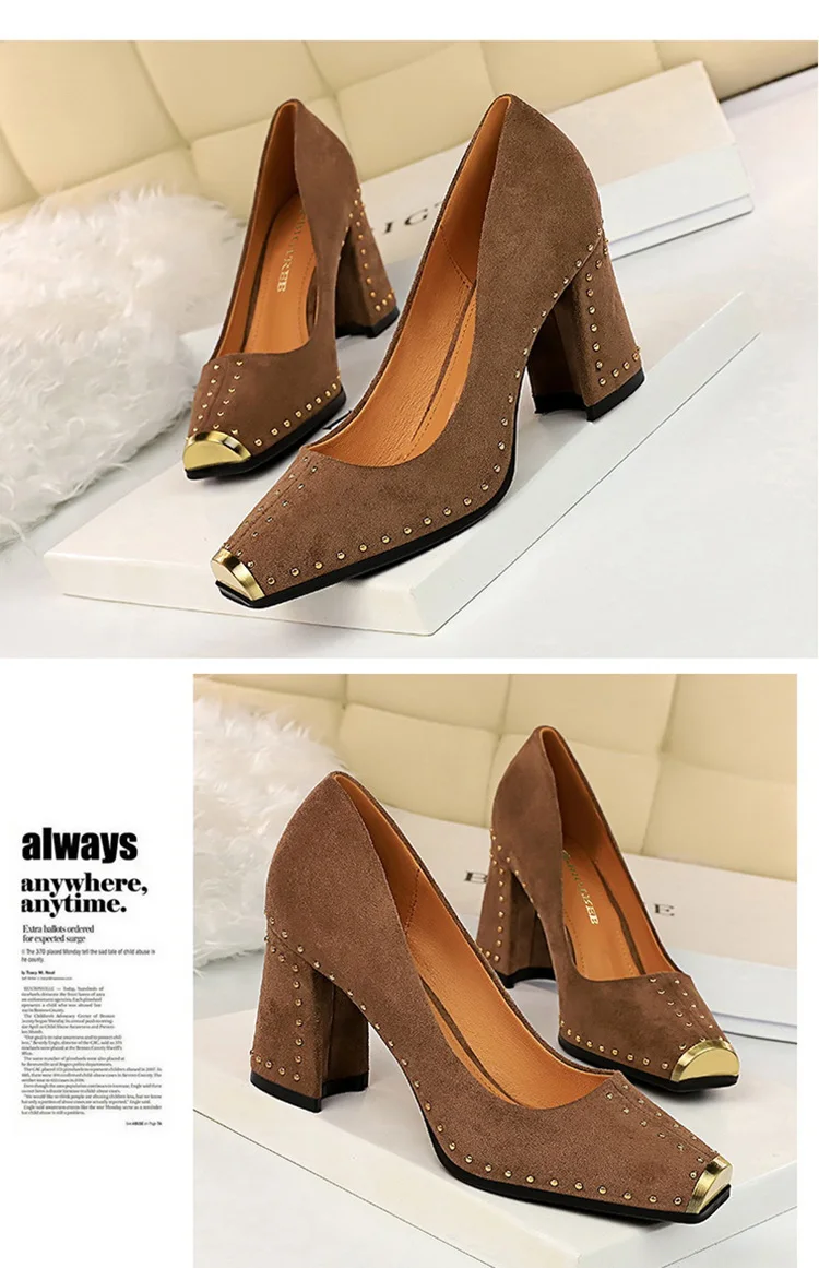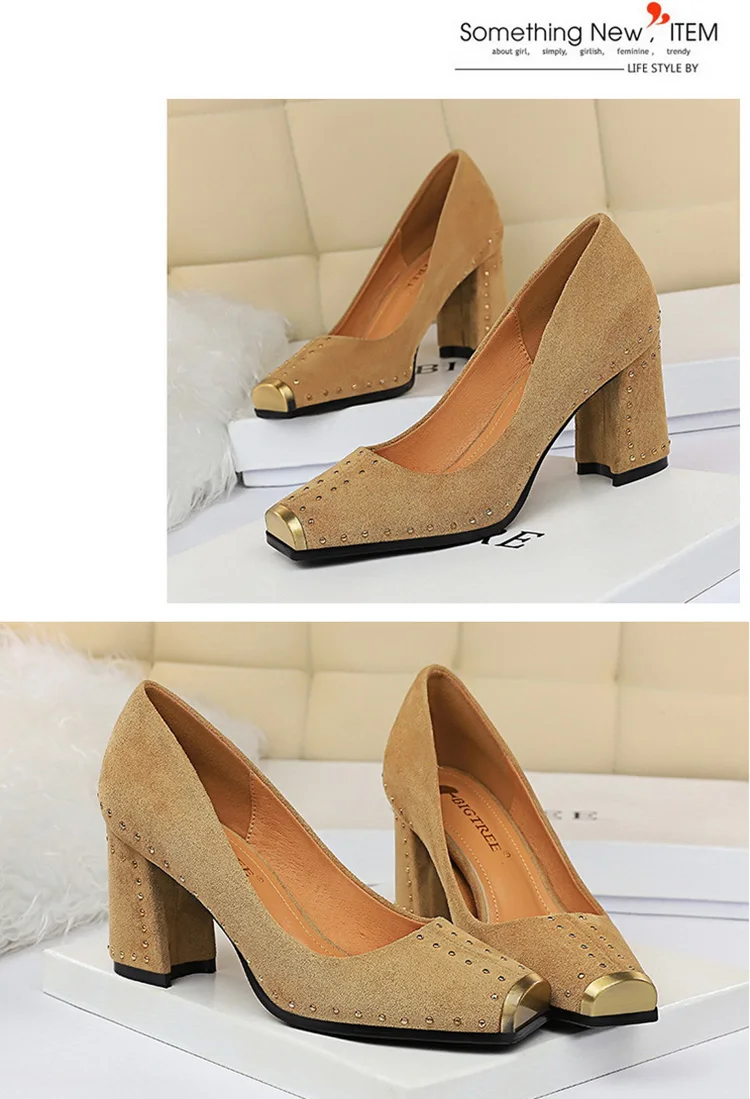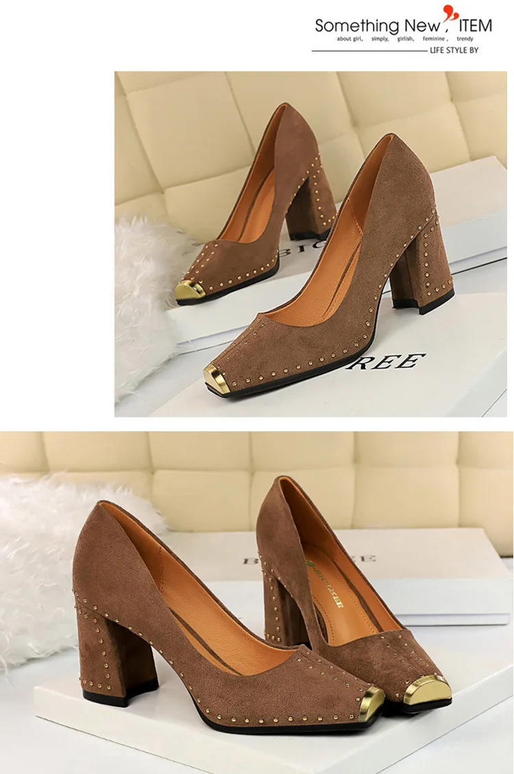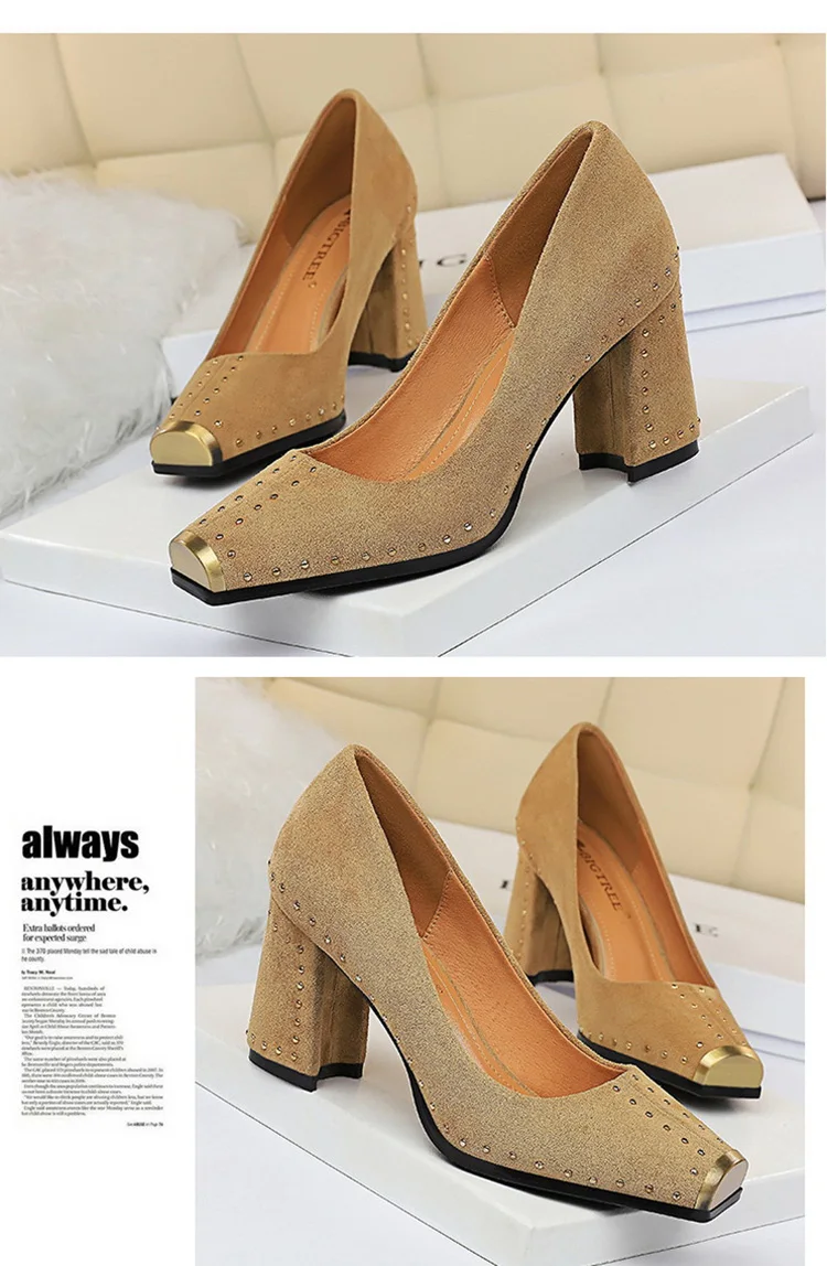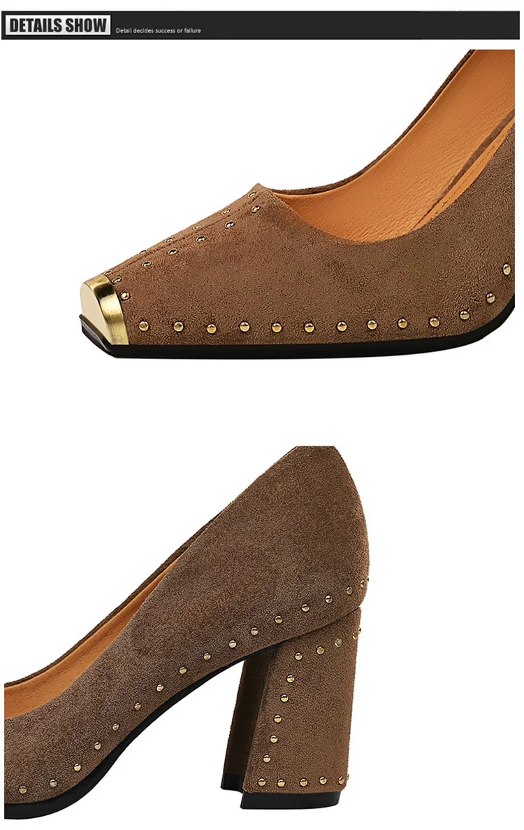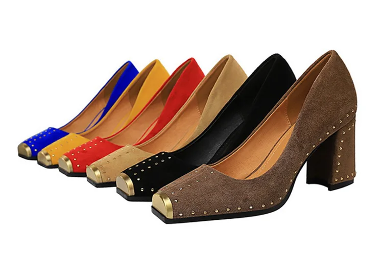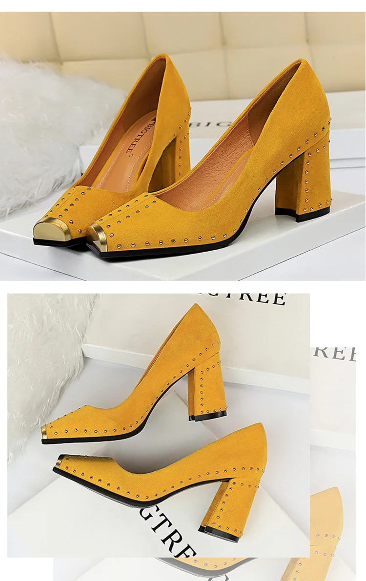 Новая обувь; женские туфли-лодочки; модные роскошные свадебные туфли на высоком каблуке; вечерние женские туфли на толстом каблуке с закрытым носком и заклепками; Цвет Черный; женская обувь на каблуке