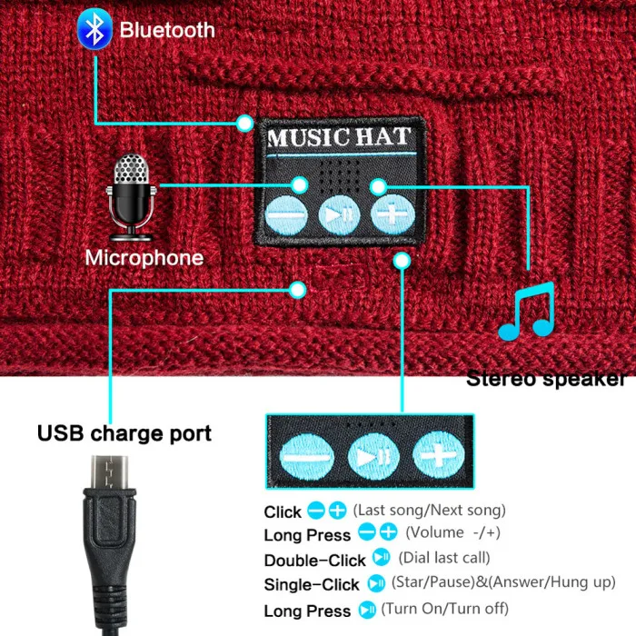 Музыкальная Bluetooth шляпа предназначена для повторного использования и моется. При этом панели значков на шляпе не закреплены на кнопке. Если значки не совпадают с кнопками управления, отрегулируйте их вручную.