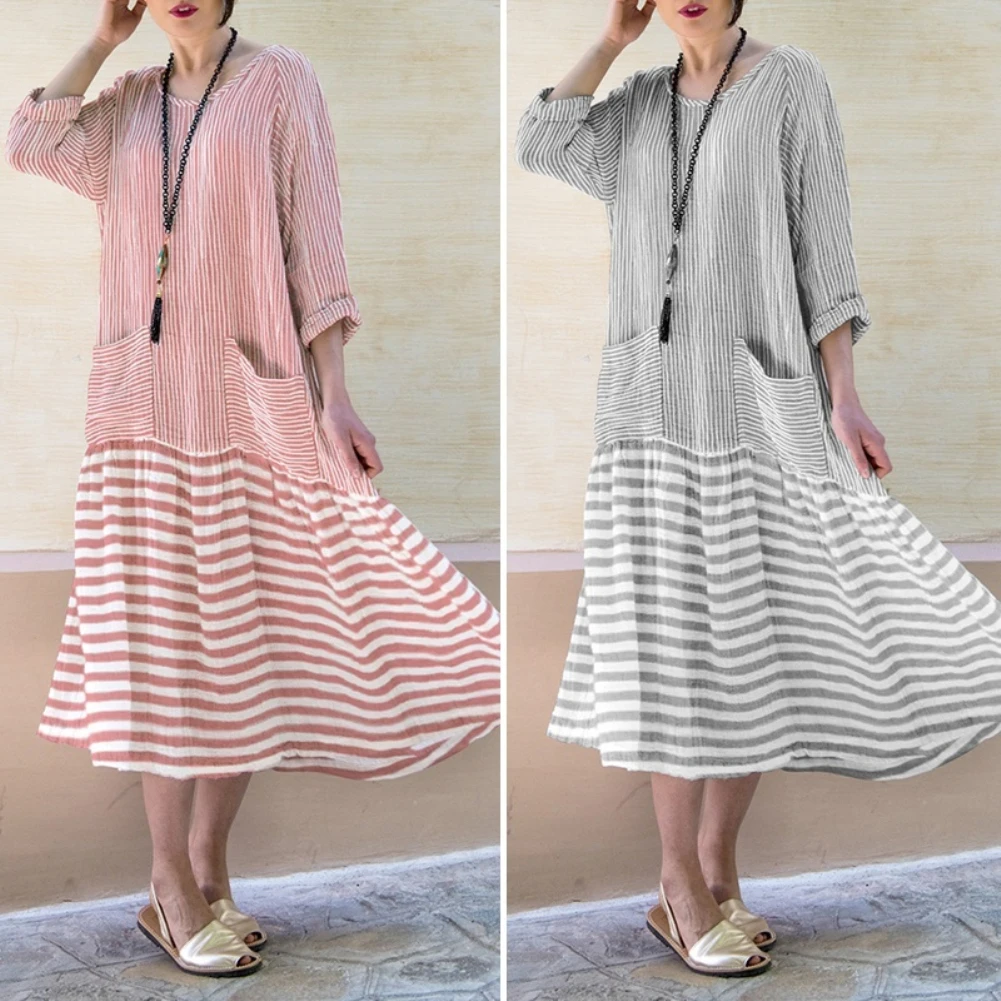 Женский винтажный сарафан в полоску Plus Sze, свободный сарафан средней длины с круглым вырезом и длинными рукавами, летние пляжные вечерние платья с карманами