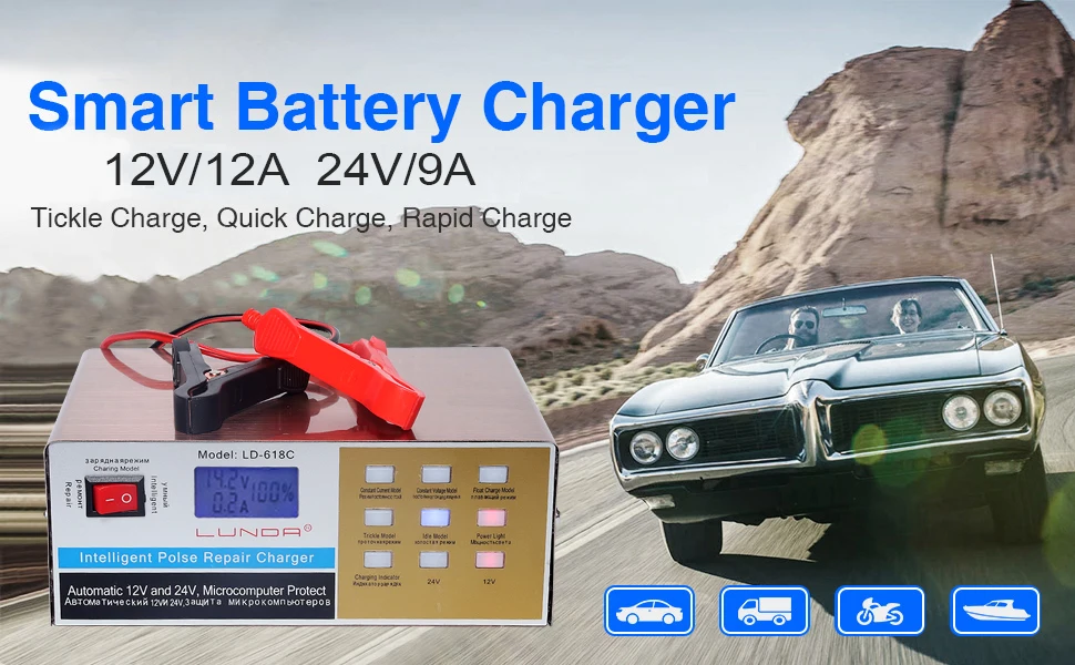 Подходит для мотоциклов, автомобилей, грузовиков, сухих батарей, водяных батарей, свинцово-кислотных батарей, не требующих технического обслуживания (в том числе влажных и сухих), интеллектуального мониторинга тока батареи, мощность и статус зарядки 12V / 24V автоматическое переключение, Полная зарядка автоматически прекращает зарядку, вы можете заряжать вручную, но также умная зарядка, которую вы можете зарядить обычной батареей, также можно заряжать зарядку, ремонт, обслуживание батареи, анализ состояния заряда в три в одном, контроль состояния батареи в любое время Материал: металл + электронные компоненты