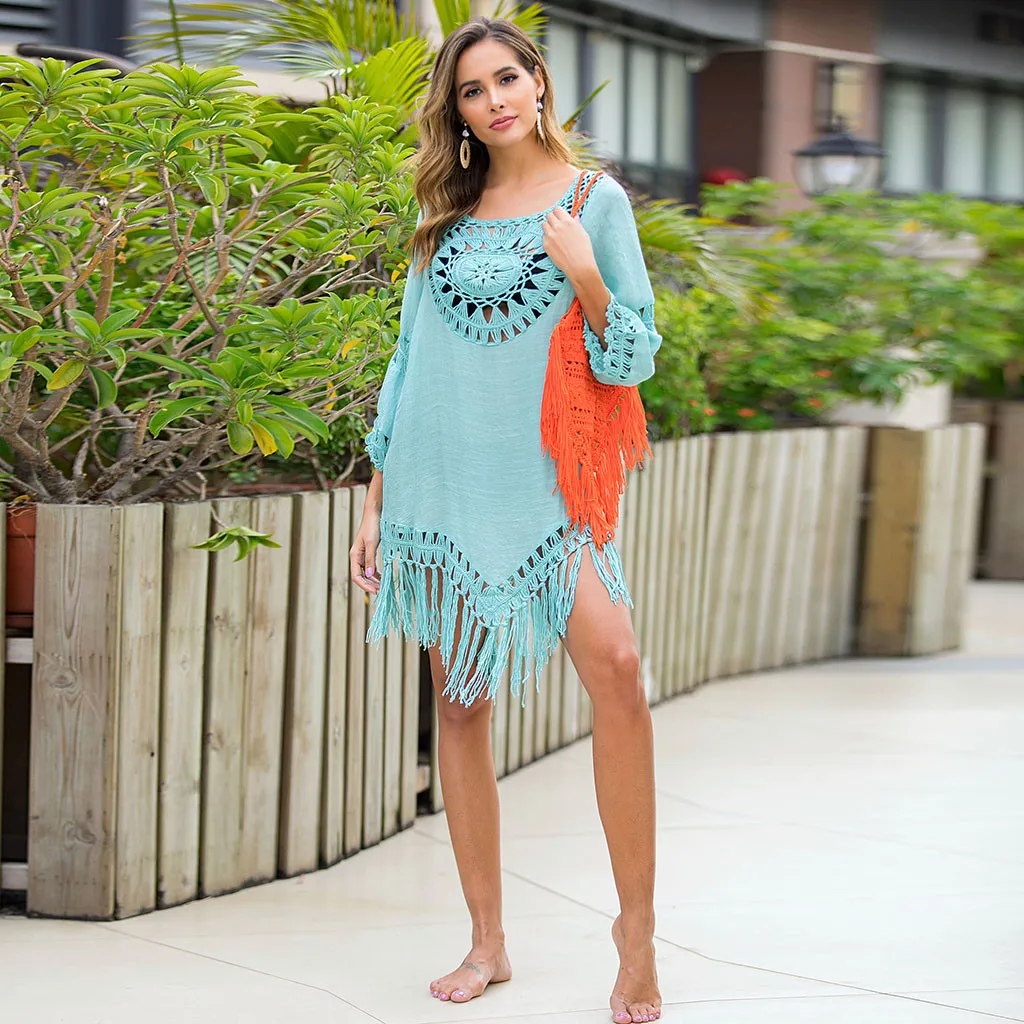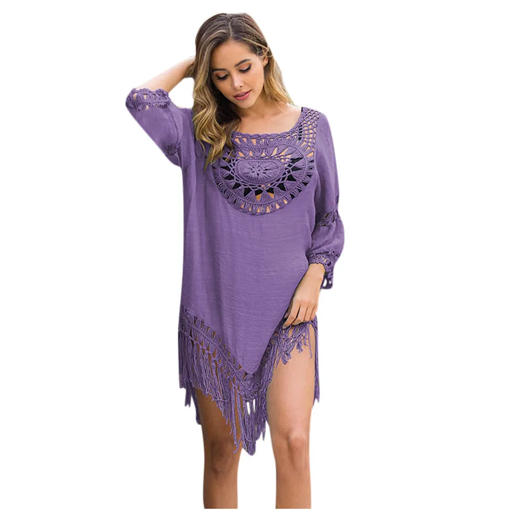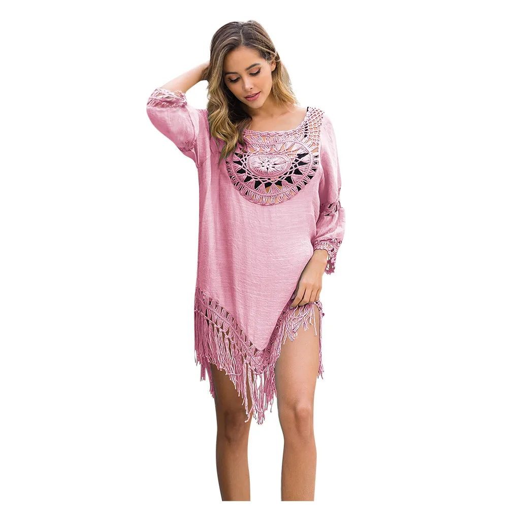 3.КруглыйШеи, 3/4Рукава,МиниДлина,С вырезами, кисточками,Очаровательно и привлекательно. Простой, но модный. Свободный крой. Предупреждения Кожа Повреждения, когда вы играете на пляже.