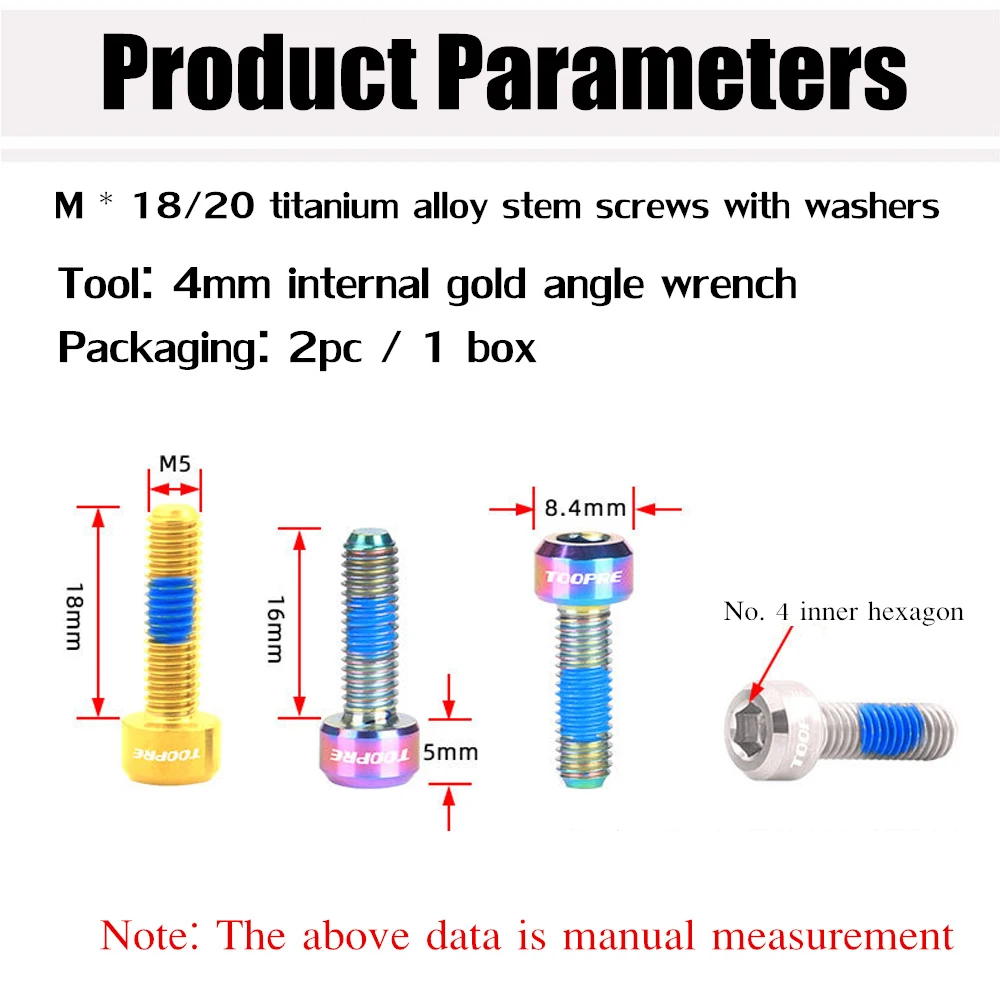 M * 16/18 винты из титанового сплава с шайбами Инструмент: 4 мм Внутренний Золотой угловой ключ Упаковка: 2 шт/1 коробка Внутренний шестигранник № 4 Примечание: Приведенные выше данные являются ручными измерениями