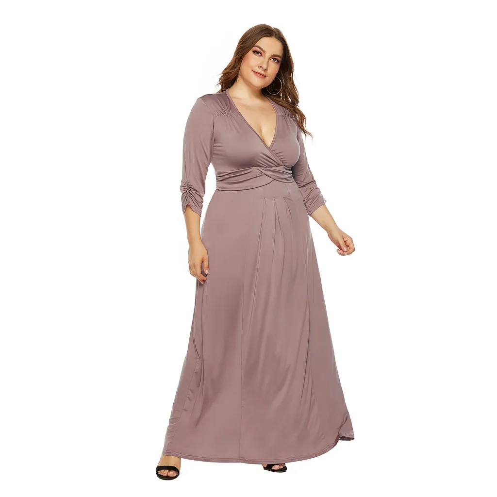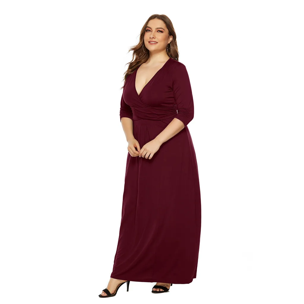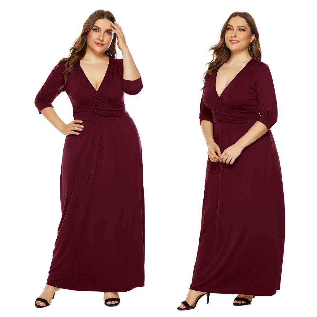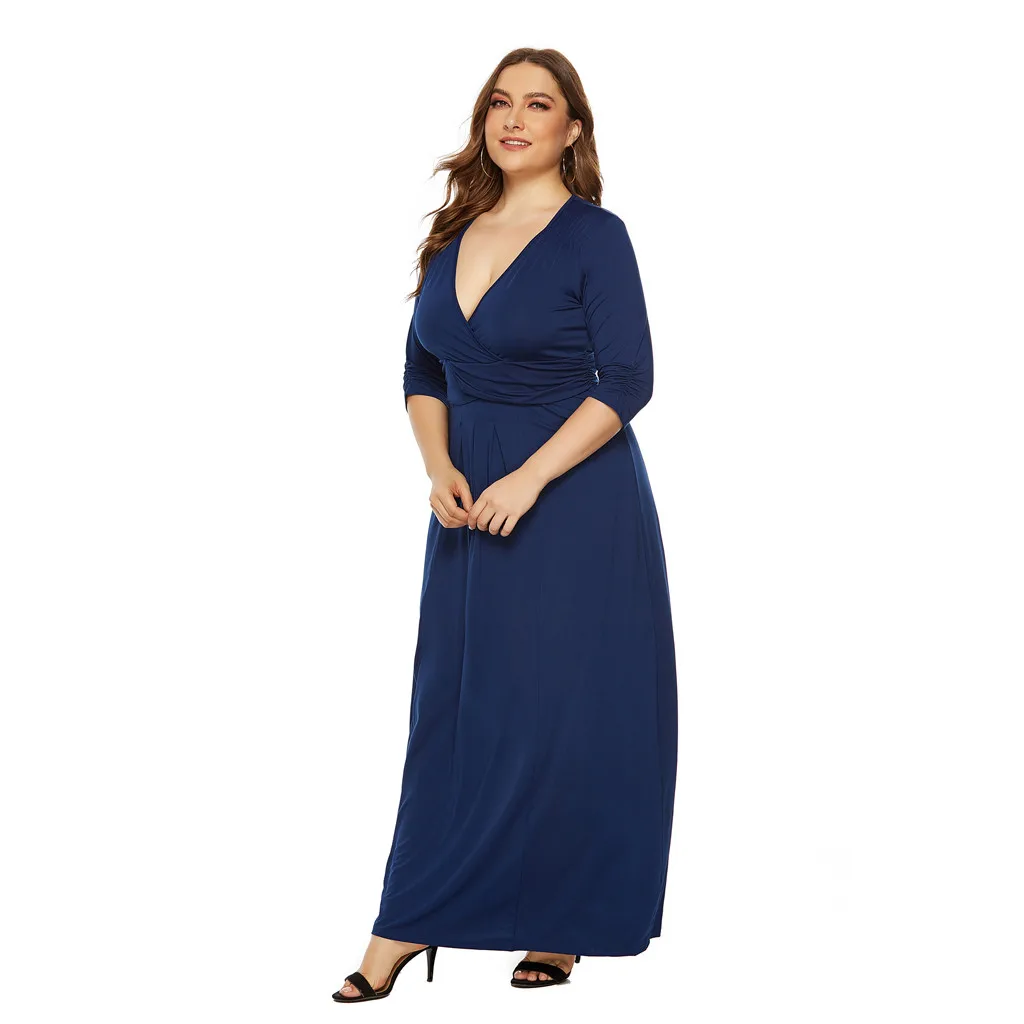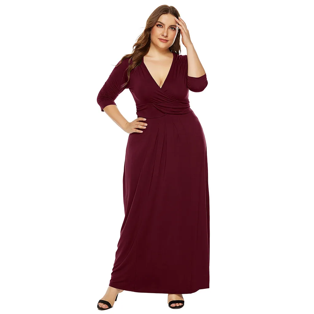 Женщины плюс размер случайные сплошной цвет v-образным вырезом Половина рукава складки стрейч тонкий платье