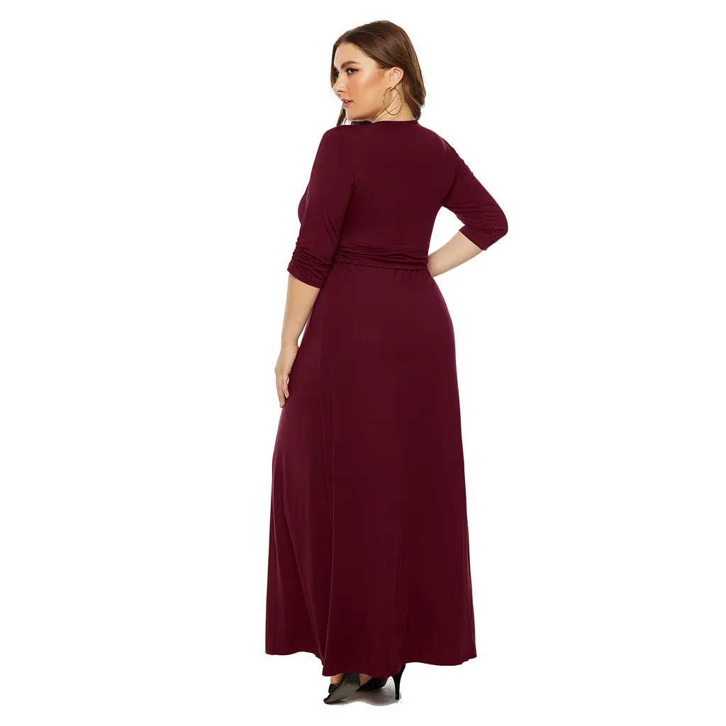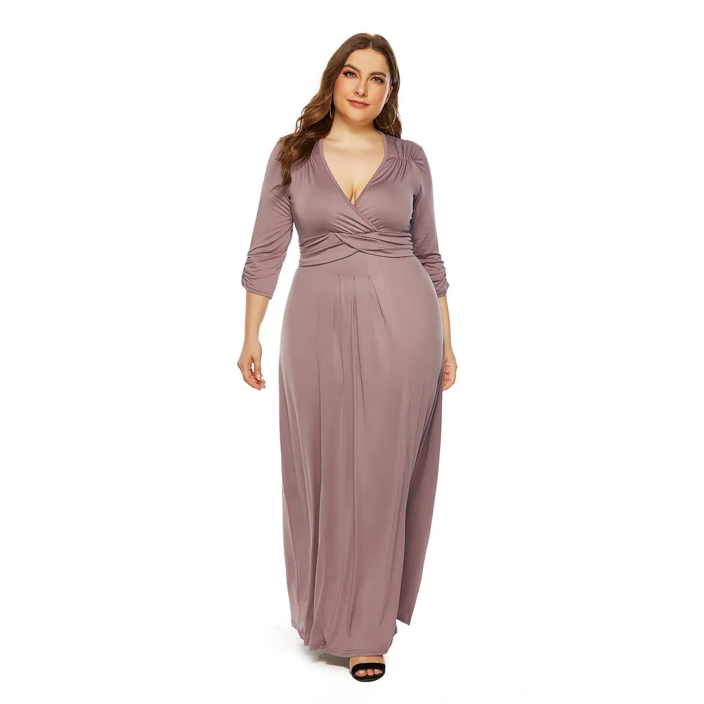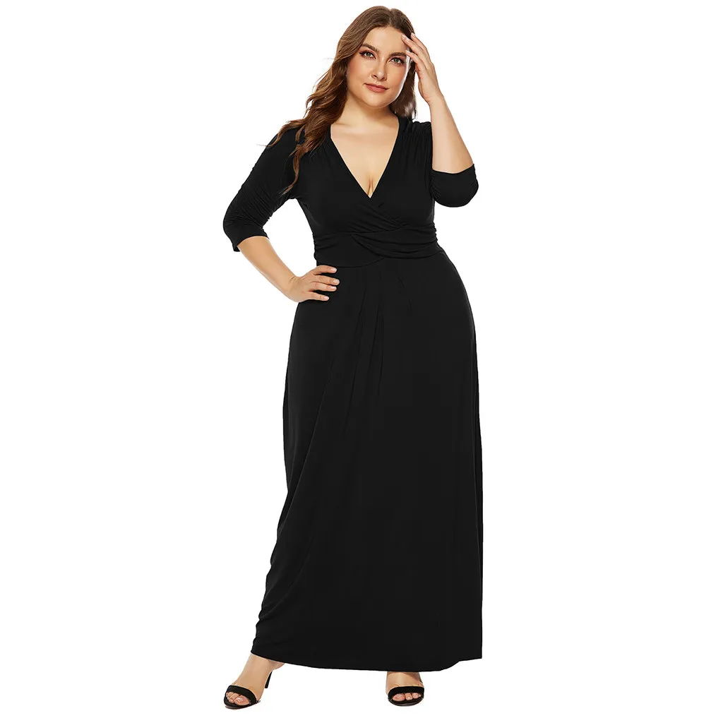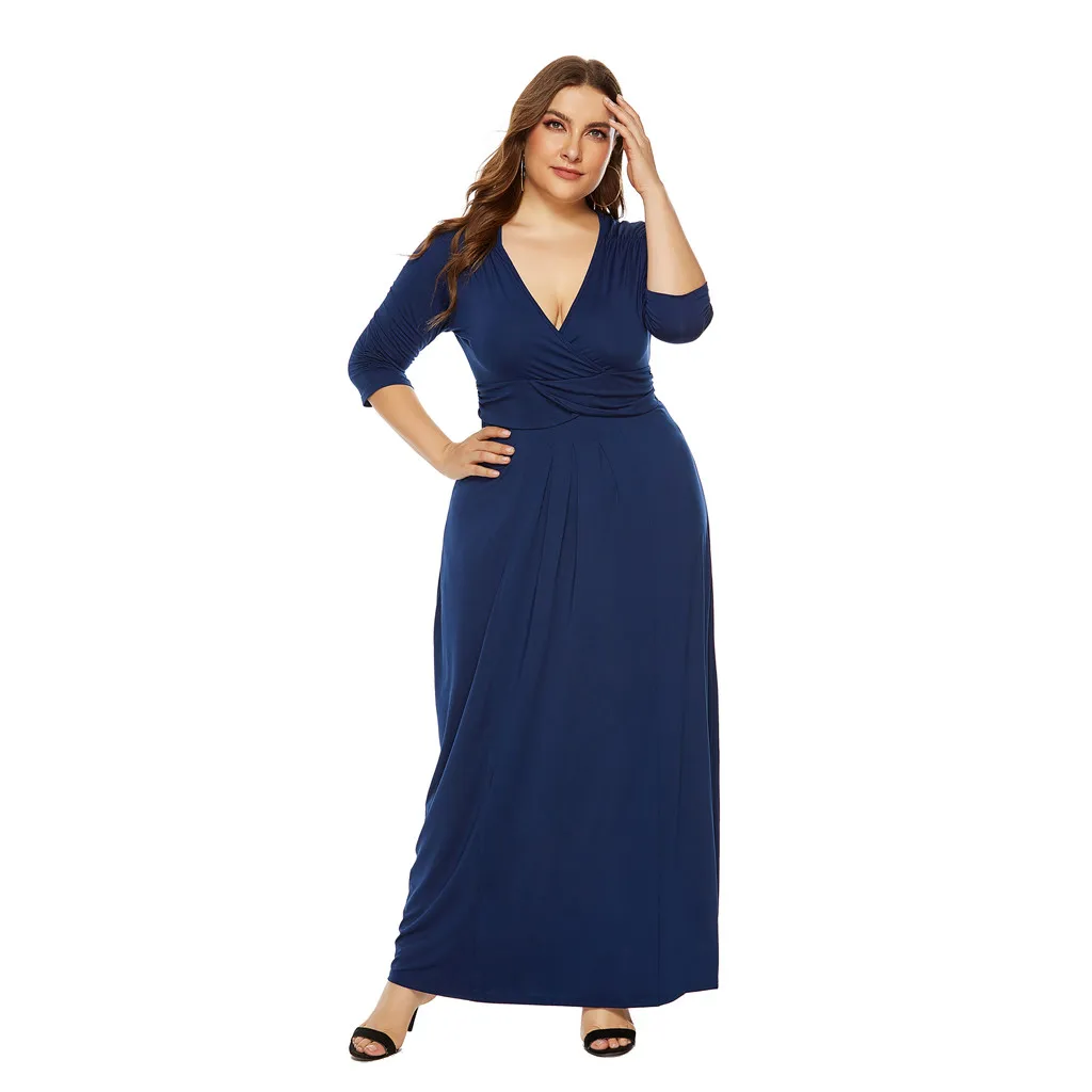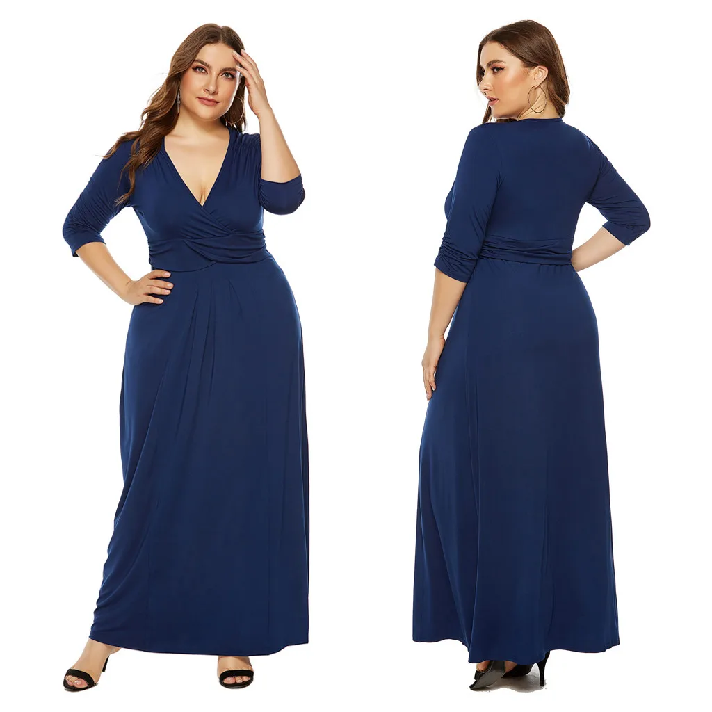 Женщины плюс размер случайные сплошной цвет v-образным вырезом Половина рукава складки стрейч тонкий платье